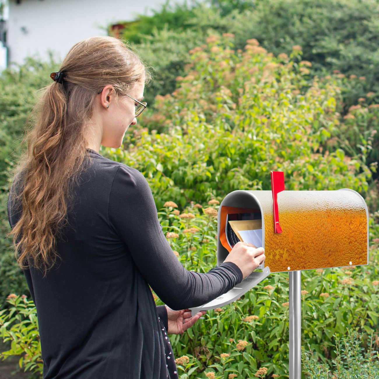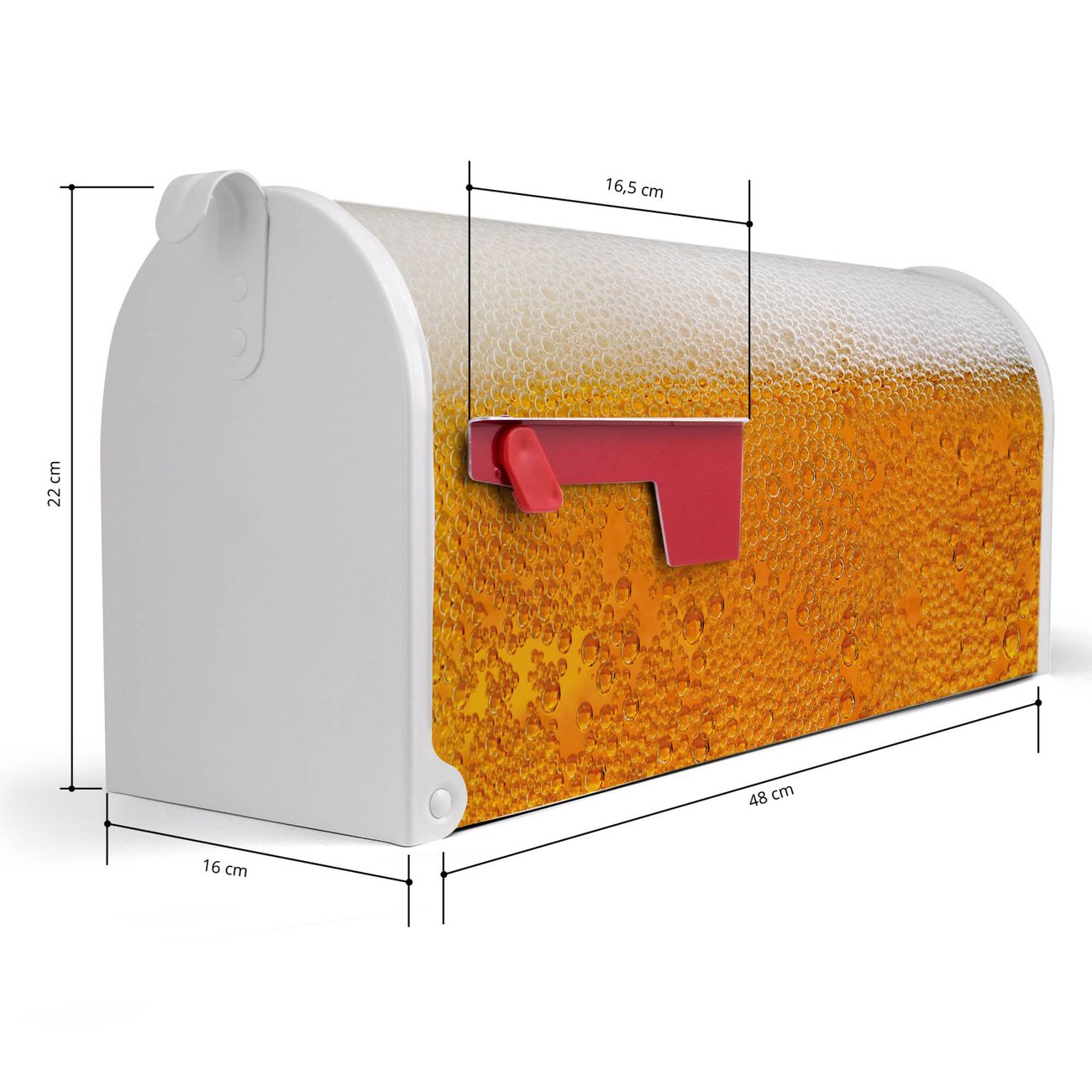 Der amerikanische Briefkasten von banjado mit Bier Motiv bietet Ihnen ausreichend Fassungsvermögen, um große A4 Sendungen und Zeitschriften zu empfangen. Die typisch amerikanische rote Fahne zeigt Ihnen an, wenn Sie Post erhalten haben. Die US-Mailbox besteht aus verzinktem Stahlblech welches lackiert wurde und ist 48 x 22 x 16 CM (BxHxT) groß. Die Folie mit Motiv Bier besteht aus einer wetter- und UV-resistenten Folie, die mit einem Schutzlaminat überzogen ist, sodass die US Mailbox zusätzlich vor Kratzern geschützt ist. An der Unterkante sind 4 Löcher je Seite um die Mailbox, typisch amerikanisch, an einem Holzpfahl oder einem Zaun zu befestigen. Auf Wunsch können Sie bei uns den passenden Standfuß oder die passende Wandhalterung kaufen um die US-Mailbox sicher zu befestigen. Wir bieten Ihnen ebenfalls Namensschilder, bereits beschriftet oder frei zu beschriften, und verschiedene selbst gestaltete Bitte-Keine-Werbung-Aufkleber.