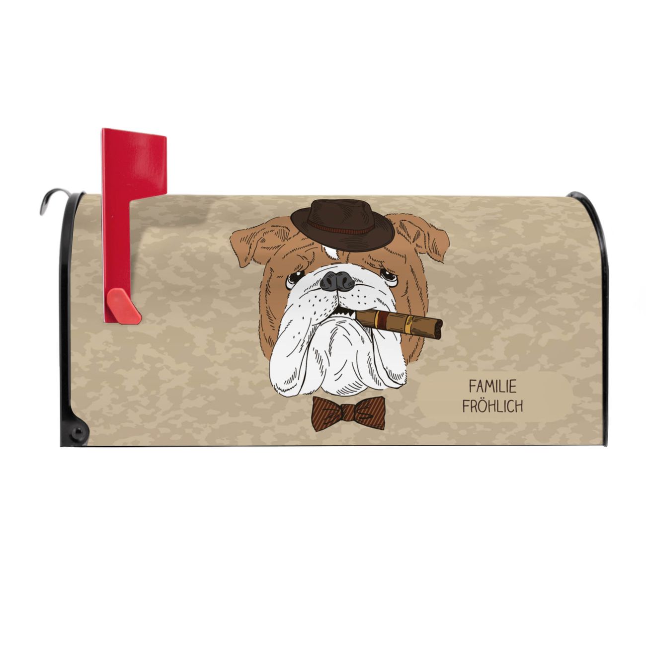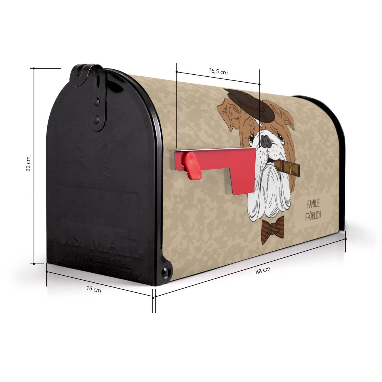 Der amerikanische Briefkasten von banjado mit Big Daddy Motiv bietet Ihnen ausreichend Fassungsvermögen, um große A4 Sendungen und Zeitschriften zu empfangen. Die typisch amerikanische rote Fahne zeigt Ihnen an, wenn Sie Post erhalten haben. Die US-Mailbox besteht aus verzinktem Stahlblech welches lackiert wurde und ist 48 x 22 x 16 CM (BxHxT) groß. Die Folie mit Motiv Big Daddy besteht aus einer wetter- und UV-resistenten Folie, die mit einem Schutzlaminat überzogen ist, sodass die US Mailbox zusätzlich vor Kratzern geschützt ist. An der Unterkante sind 4 Löcher je Seite um die Mailbox, typisch amerikanisch, an einem Holzpfahl oder einem Zaun zu befestigen. Auf Wunsch können Sie bei uns den passenden Standfuß oder die passende Wandhalterung kaufen um die US-Mailbox sicher zu befestigen. Wir bieten Ihnen ebenfalls Namensschilder, bereits beschriftet oder frei zu beschriften, und verschiedene selbst gestaltete Bitte-Keine-Werbung-Aufkleber.