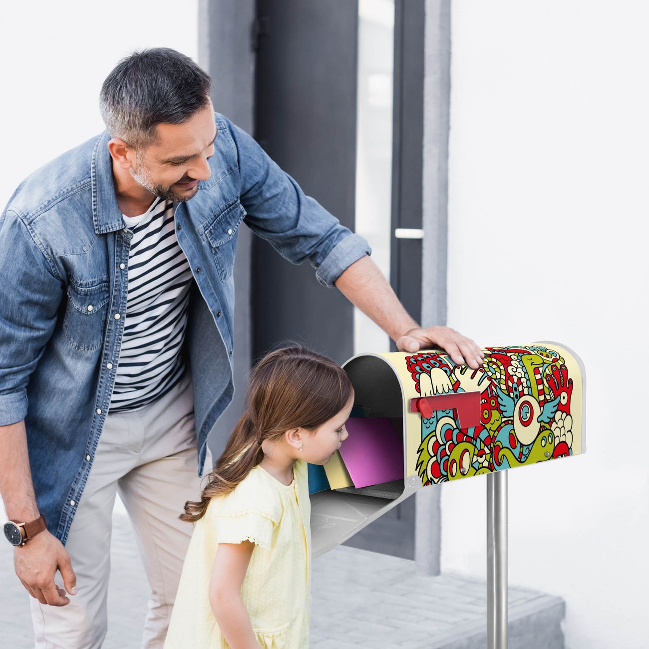 Der amerikanische Briefkasten von banjado mit Birds Worms Freaks Motiv bietet Ihnen ausreichend Fassungsvermögen, um große A4 Sendungen und Zeitschriften zu empfangen. Die typisch amerikanische rote Fahne zeigt Ihnen an, wenn Sie Post erhalten haben. Die US-Mailbox besteht aus verzinktem Stahlblech welches lackiert wurde und ist 48 x 22 x 16 CM (BxHxT) groß. Die Folie mit Motiv Birds Worms Freaks besteht aus einer wetter- und UV-resistenten Folie, die mit einem Schutzlaminat überzogen ist, sodass die US Mailbox zusätzlich vor Kratzern geschützt ist. An der Unterkante sind 4 Löcher je Seite um die Mailbox, typisch amerikanisch, an einem Holzpfahl oder einem Zaun zu befestigen. Auf Wunsch können Sie bei uns den passenden Standfuß oder die passende Wandhalterung kaufen um die US-Mailbox sicher zu befestigen. Wir bieten Ihnen ebenfalls Namensschilder, bereits beschriftet oder frei zu beschriften, und verschiedene selbst gestaltete Bitte-Keine-Werbung-Aufkleber.