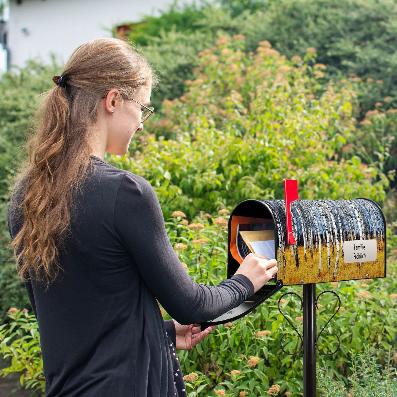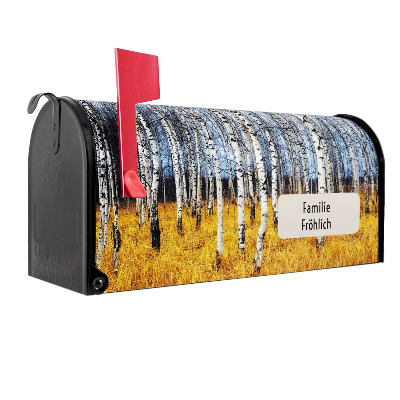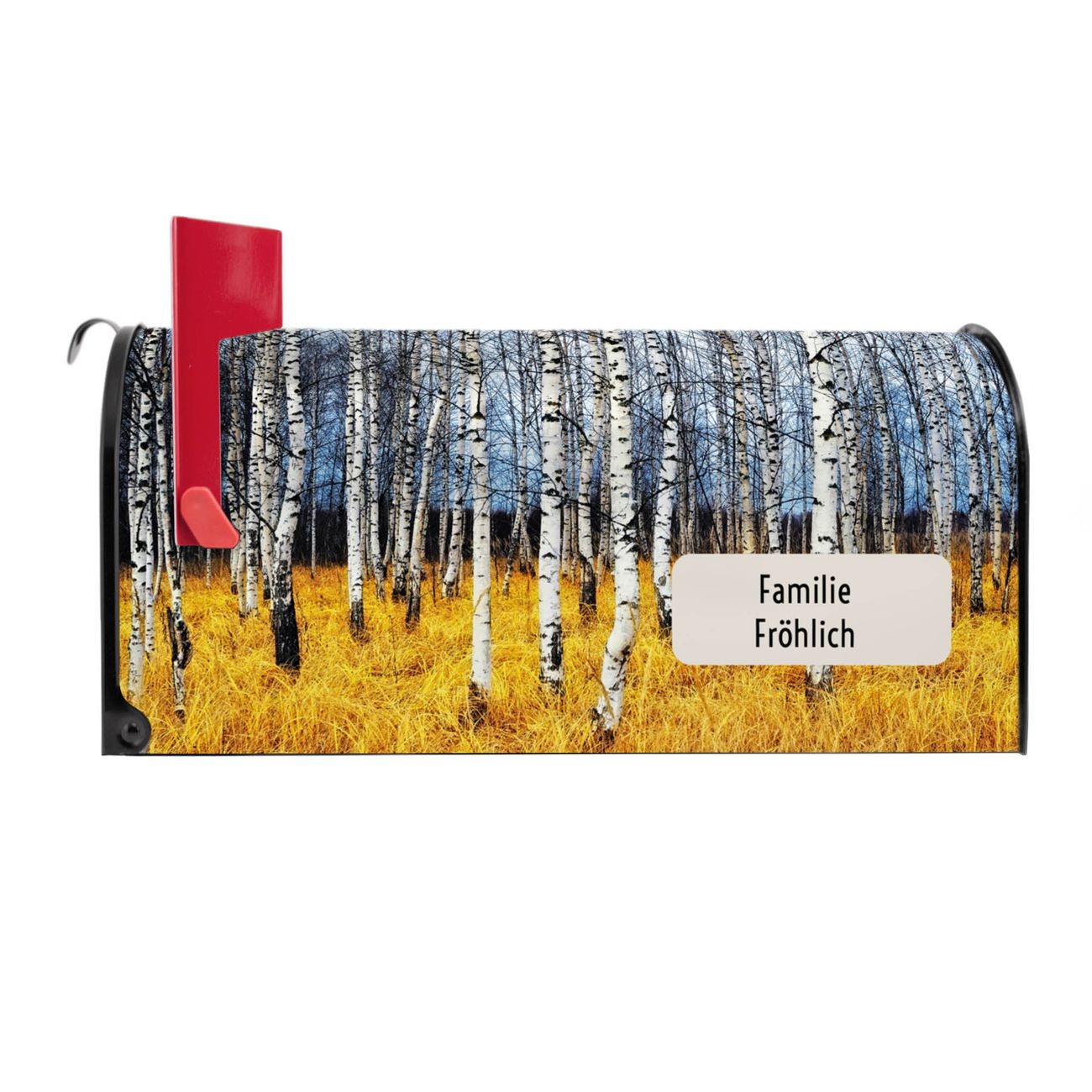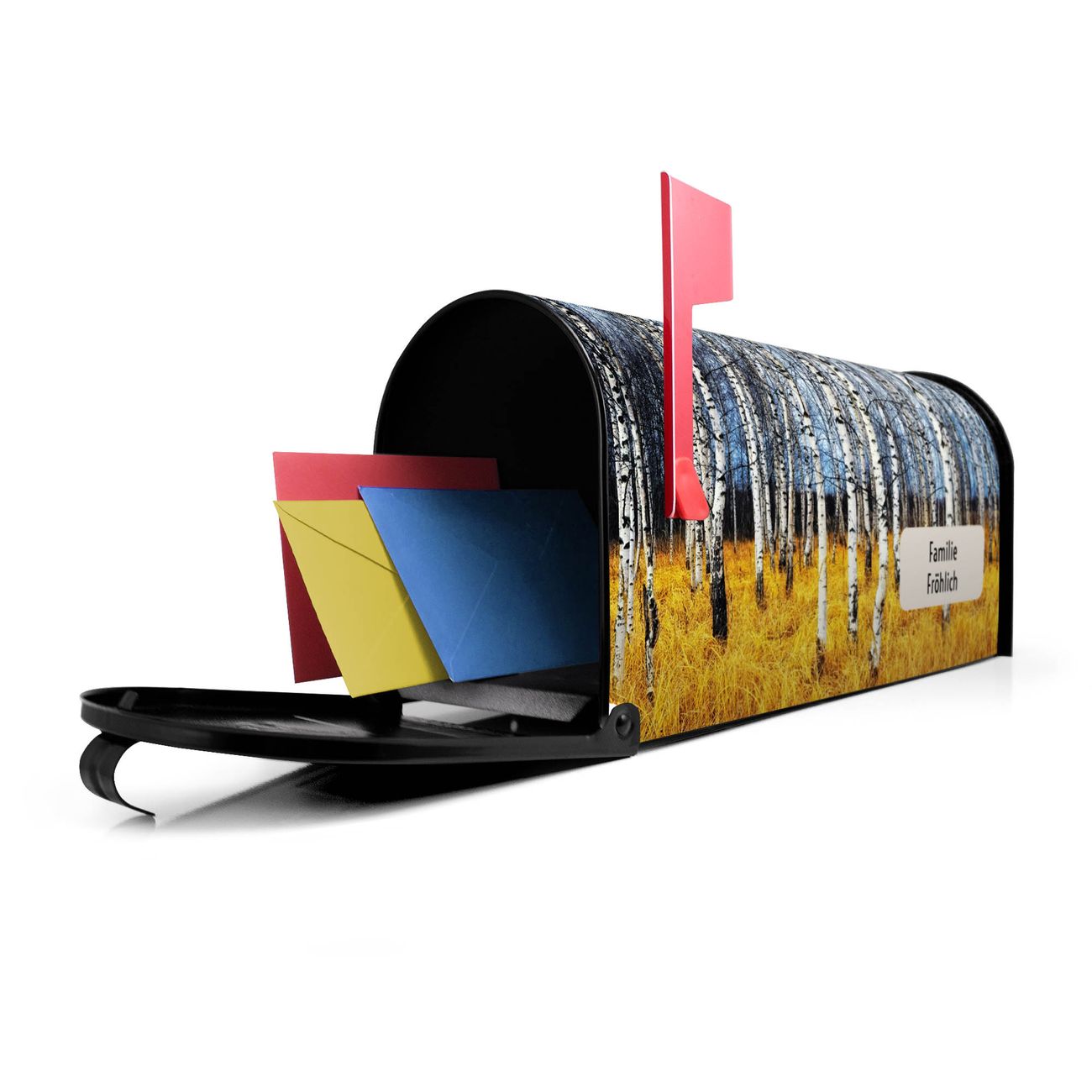 Der amerikanische Briefkasten von banjado mit Birkenhain Motiv bietet Ihnen ausreichend Fassungsvermögen, um große A4 Sendungen und Zeitschriften zu empfangen. Die typisch amerikanische rote Fahne zeigt Ihnen an, wenn Sie Post erhalten haben. Die US-Mailbox besteht aus verzinktem Stahlblech welches lackiert wurde und ist 48 x 22 x 16 CM (BxHxT) groß. Die Folie mit Motiv Birkenhain besteht aus einer wetter- und UV-resistenten Folie, die mit einem Schutzlaminat überzogen ist, sodass die US Mailbox zusätzlich vor Kratzern geschützt ist. An der Unterkante sind 4 Löcher je Seite um die Mailbox, typisch amerikanisch, an einem Holzpfahl oder einem Zaun zu befestigen. Auf Wunsch können Sie bei uns den passenden Standfuß oder die passende Wandhalterung kaufen um die US-Mailbox sicher zu befestigen. Wir bieten Ihnen ebenfalls Namensschilder, bereits beschriftet oder frei zu beschriften, und verschiedene selbst gestaltete Bitte-Keine-Werbung-Aufkleber.