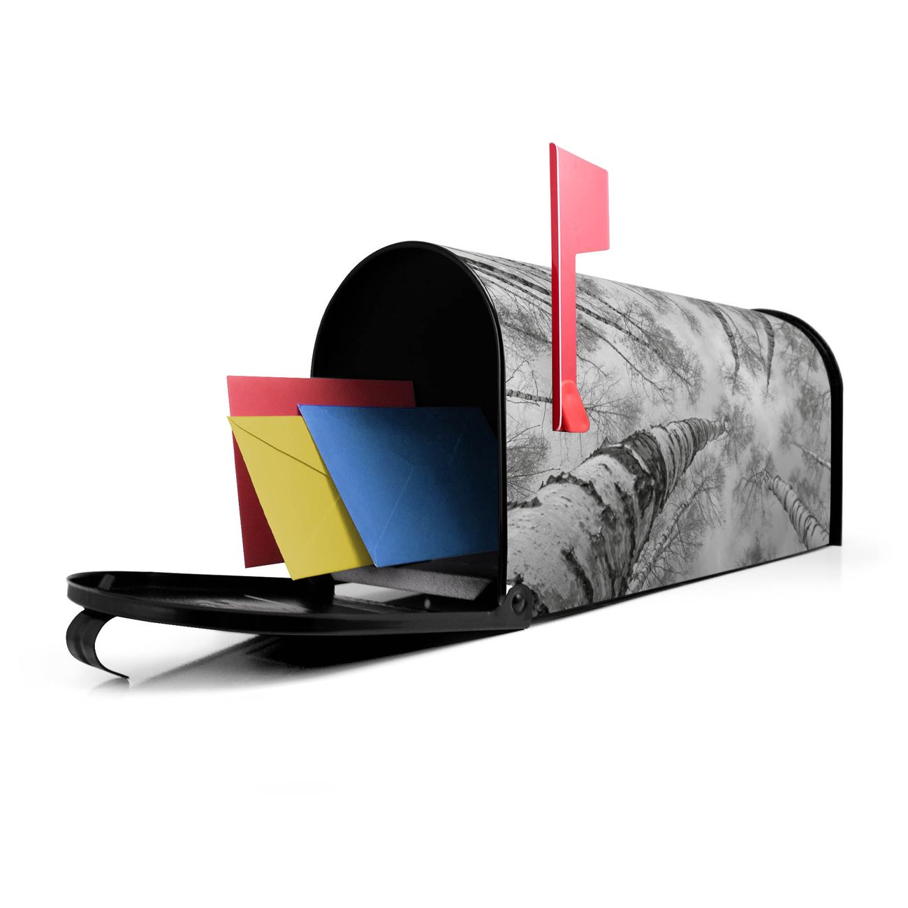 Der amerikanische Briefkasten von banjado mit Birkenwald Motiv bietet Ihnen ausreichend Fassungsvermögen, um große A4 Sendungen und Zeitschriften zu empfangen. Die typisch amerikanische rote Fahne zeigt Ihnen an, wenn Sie Post erhalten haben. Die US-Mailbox besteht aus verzinktem Stahlblech welches lackiert wurde und ist 48 x 22 x 16 CM (BxHxT) groß. Die Folie mit Motiv Birkenwald besteht aus einer wetter- und UV-resistenten Folie, die mit einem Schutzlaminat überzogen ist, sodass die US Mailbox zusätzlich vor Kratzern geschützt ist. An der Unterkante sind 4 Löcher je Seite um die Mailbox, typisch amerikanisch, an einem Holzpfahl oder einem Zaun zu befestigen. Auf Wunsch können Sie bei uns den passenden Standfuß oder die passende Wandhalterung kaufen um die US-Mailbox sicher zu befestigen. Wir bieten Ihnen ebenfalls Namensschilder, bereits beschriftet oder frei zu beschriften, und verschiedene selbst gestaltete Bitte-Keine-Werbung-Aufkleber.