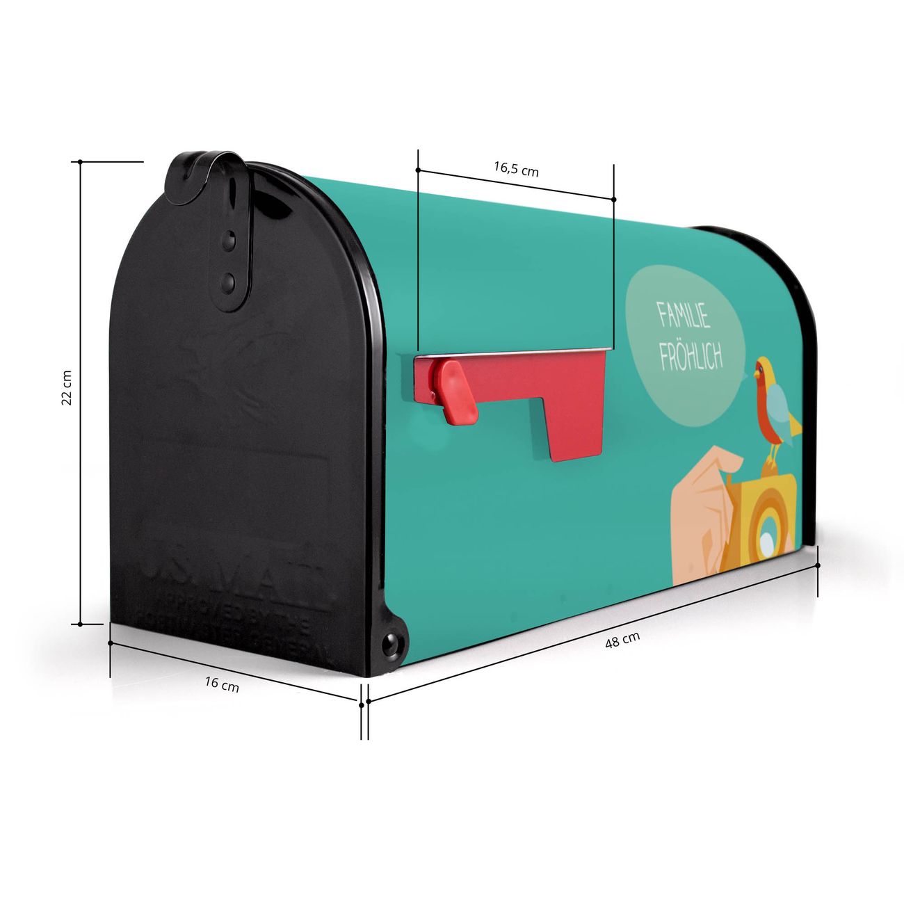 Der amerikanische Briefkasten von banjado mit Bitte Lächeln 2 Motiv bietet Ihnen ausreichend Fassungsvermögen, um große A4 Sendungen und Zeitschriften zu empfangen. Die typisch amerikanische rote Fahne zeigt Ihnen an, wenn Sie Post erhalten haben. Die US-Mailbox besteht aus verzinktem Stahlblech welches lackiert wurde und ist 48 x 22 x 16 CM (BxHxT) groß. Die Folie mit Motiv Bitte Lächeln 2 besteht aus einer wetter- und UV-resistenten Folie, die mit einem Schutzlaminat überzogen ist, sodass die US Mailbox zusätzlich vor Kratzern geschützt ist. An der Unterkante sind 4 Löcher je Seite um die Mailbox, typisch amerikanisch, an einem Holzpfahl oder einem Zaun zu befestigen. Auf Wunsch können Sie bei uns den passenden Standfuß oder die passende Wandhalterung kaufen um die US-Mailbox sicher zu befestigen. Wir bieten Ihnen ebenfalls Namensschilder, bereits beschriftet oder frei zu beschriften, und verschiedene selbst gestaltete Bitte-Keine-Werbung-Aufkleber.