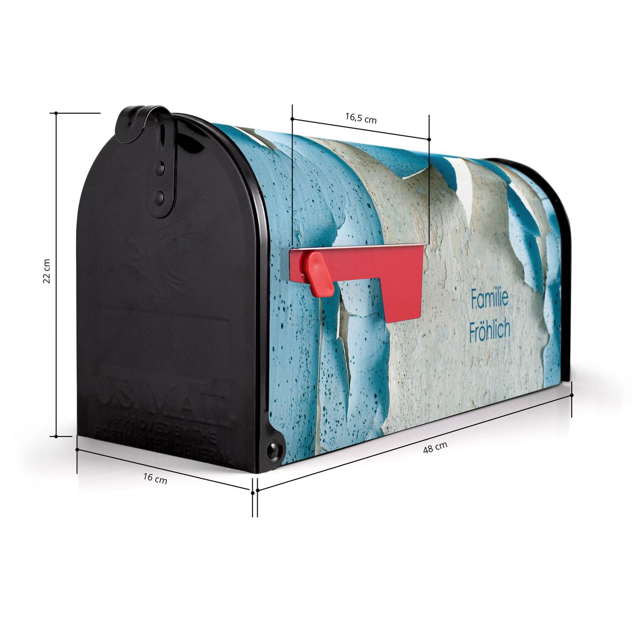 Der amerikanische Briefkasten von banjado mit Blätternde Farbe Motiv bietet Ihnen ausreichend Fassungsvermögen, um große A4 Sendungen und Zeitschriften zu empfangen. Die typisch amerikanische rote Fahne zeigt Ihnen an, wenn Sie Post erhalten haben. Die US-Mailbox besteht aus verzinktem Stahlblech welches lackiert wurde und ist 48 x 22 x 16 CM (BxHxT) groß. Die Folie mit Motiv Blätternde Farbe besteht aus einer wetter- und UV-resistenten Folie, die mit einem Schutzlaminat überzogen ist, sodass die US Mailbox zusätzlich vor Kratzern geschützt ist. An der Unterkante sind 4 Löcher je Seite um die Mailbox, typisch amerikanisch, an einem Holzpfahl oder einem Zaun zu befestigen. Auf Wunsch können Sie bei uns den passenden Standfuß oder die passende Wandhalterung kaufen um die US-Mailbox sicher zu befestigen. Wir bieten Ihnen ebenfalls Namensschilder, bereits beschriftet oder frei zu beschriften, und verschiedene selbst gestaltete Bitte-Keine-Werbung-Aufkleber.