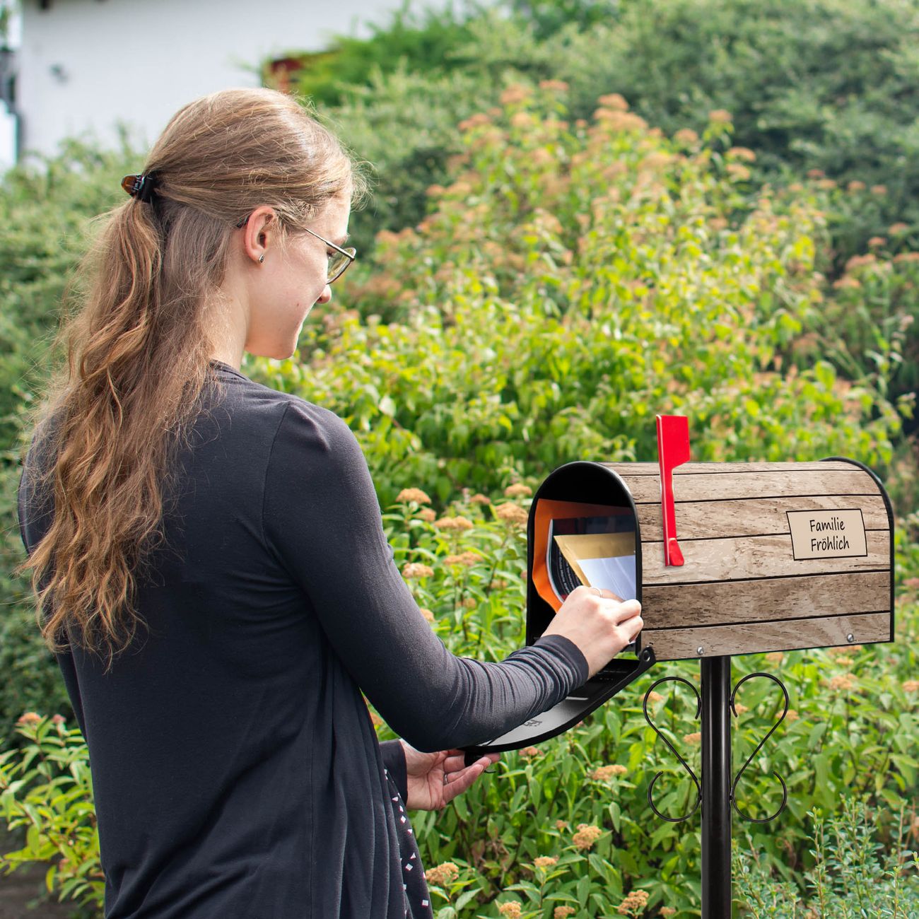 Der amerikanische Briefkasten von banjado mit Blasse Holzlatten Motiv bietet Ihnen ausreichend Fassungsvermögen, um große A4 Sendungen und Zeitschriften zu empfangen. Die typisch amerikanische rote Fahne zeigt Ihnen an, wenn Sie Post erhalten haben. Die US-Mailbox besteht aus verzinktem Stahlblech welches lackiert wurde und ist 48 x 22 x 16 CM (BxHxT) groß. Die Folie mit Motiv Blasse Holzlatten besteht aus einer wetter- und UV-resistenten Folie, die mit einem Schutzlaminat überzogen ist, sodass die US Mailbox zusätzlich vor Kratzern geschützt ist. An der Unterkante sind 4 Löcher je Seite um die Mailbox, typisch amerikanisch, an einem Holzpfahl oder einem Zaun zu befestigen. Auf Wunsch können Sie bei uns den passenden Standfuß oder die passende Wandhalterung kaufen um die US-Mailbox sicher zu befestigen. Wir bieten Ihnen ebenfalls Namensschilder, bereits beschriftet oder frei zu beschriften, und verschiedene selbst gestaltete Bitte-Keine-Werbung-Aufkleber.