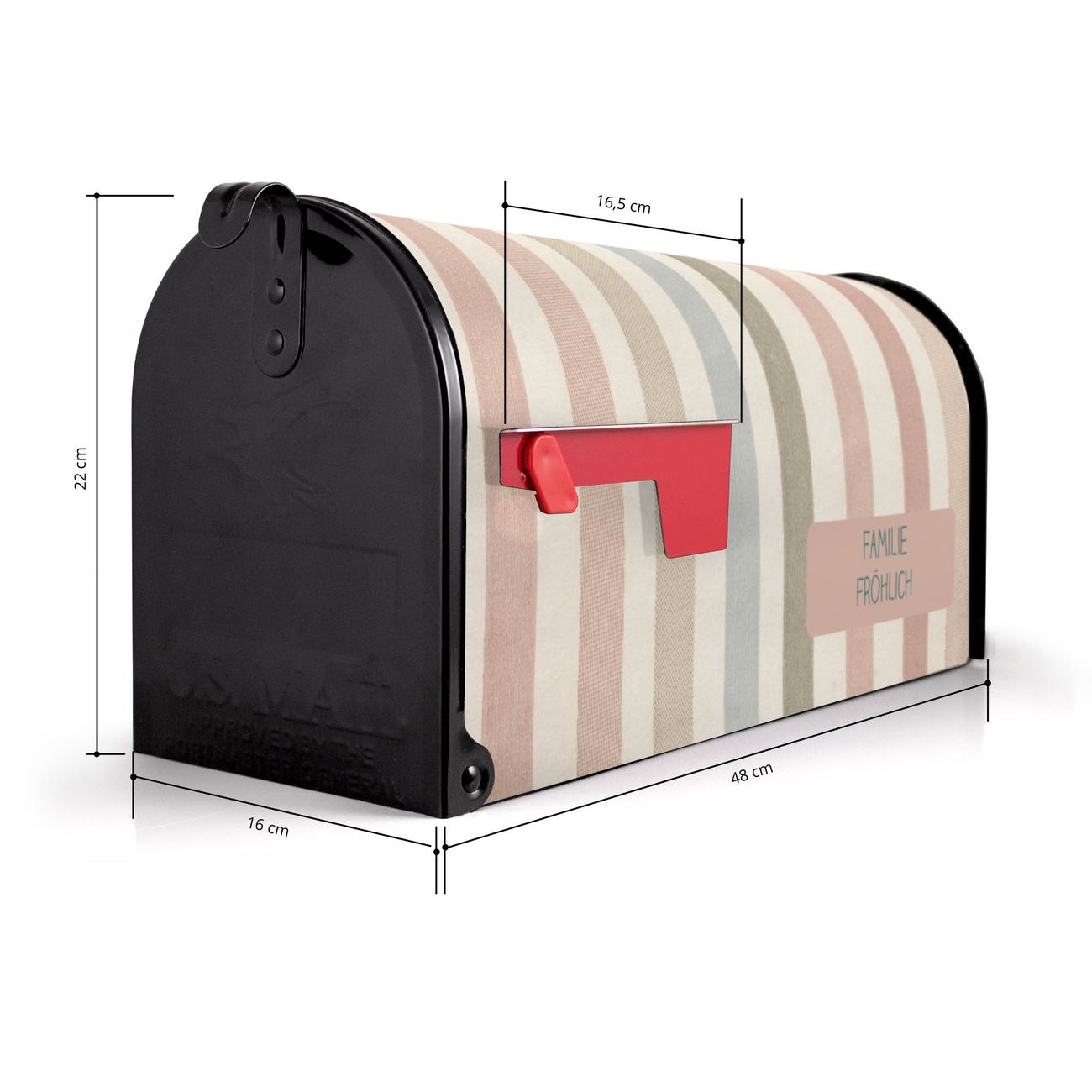 Der amerikanische Briefkasten von banjado mit Blasse Streifen Motiv bietet Ihnen ausreichend Fassungsvermögen, um große A4 Sendungen und Zeitschriften zu empfangen. Die typisch amerikanische rote Fahne zeigt Ihnen an, wenn Sie Post erhalten haben. Die US-Mailbox besteht aus verzinktem Stahlblech welches lackiert wurde und ist 48 x 22 x 16 CM (BxHxT) groß. Die Folie mit Motiv Blasse Streifen besteht aus einer wetter- und UV-resistenten Folie, die mit einem Schutzlaminat überzogen ist, sodass die US Mailbox zusätzlich vor Kratzern geschützt ist. An der Unterkante sind 4 Löcher je Seite um die Mailbox, typisch amerikanisch, an einem Holzpfahl oder einem Zaun zu befestigen. Auf Wunsch können Sie bei uns den passenden Standfuß oder die passende Wandhalterung kaufen um die US-Mailbox sicher zu befestigen. Wir bieten Ihnen ebenfalls Namensschilder, bereits beschriftet oder frei zu beschriften, und verschiedene selbst gestaltete Bitte-Keine-Werbung-Aufkleber.