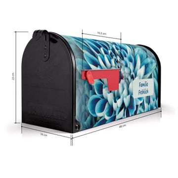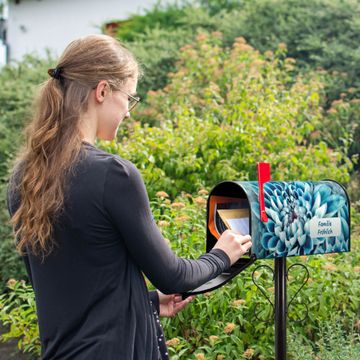 Der amerikanische Briefkasten von banjado mit Blaue Blüten Motiv bietet Ihnen ausreichend Fassungsvermögen, um große A4 Sendungen und Zeitschriften zu empfangen. Die typisch amerikanische rote Fahne zeigt Ihnen an, wenn Sie Post erhalten haben. Die US-Mailbox besteht aus verzinktem Stahlblech welches lackiert wurde und ist 48 x 22 x 16 CM (BxHxT) groß. Die Folie mit Motiv Blaue Blüten besteht aus einer wetter- und UV-resistenten Folie, die mit einem Schutzlaminat überzogen ist, sodass die US Mailbox zusätzlich vor Kratzern geschützt ist. An der Unterkante sind 4 Löcher je Seite um die Mailbox, typisch amerikanisch, an einem Holzpfahl oder einem Zaun zu befestigen. Auf Wunsch können Sie bei uns den passenden Standfuß oder die passende Wandhalterung kaufen um die US-Mailbox sicher zu befestigen. Wir bieten Ihnen ebenfalls Namensschilder, bereits beschriftet oder frei zu beschriften, und verschiedene selbst gestaltete Bitte-Keine-Werbung-Aufkleber.