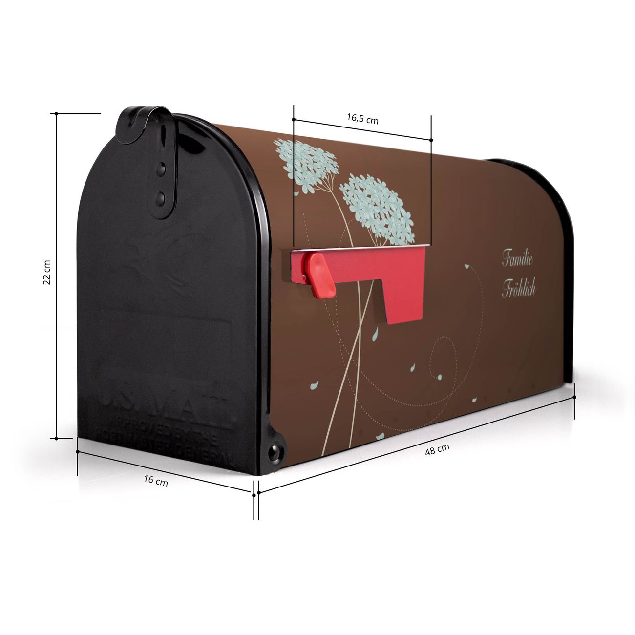 Der amerikanische Briefkasten von banjado mit WT Blaue Hortensie Motiv bietet Ihnen ausreichend Fassungsvermögen, um große A4 Sendungen und Zeitschriften zu empfangen. Die typisch amerikanische rote Fahne zeigt Ihnen an, wenn Sie Post erhalten haben. Die US-Mailbox besteht aus verzinktem Stahlblech welches lackiert wurde und ist 48 x 22 x 16 CM (BxHxT) groß. Die Folie mit Motiv WT Blaue Hortensie besteht aus einer wetter- und UV-resistenten Folie, die mit einem Schutzlaminat überzogen ist, sodass die US Mailbox zusätzlich vor Kratzern geschützt ist. An der Unterkante sind 4 Löcher je Seite um die Mailbox, typisch amerikanisch, an einem Holzpfahl oder einem Zaun zu befestigen. Auf Wunsch können Sie bei uns den passenden Standfuß oder die passende Wandhalterung kaufen um die US-Mailbox sicher zu befestigen. Wir bieten Ihnen ebenfalls Namensschilder, bereits beschriftet oder frei zu beschriften, und verschiedene selbst gestaltete Bitte-Keine-Werbung-Aufkleber.