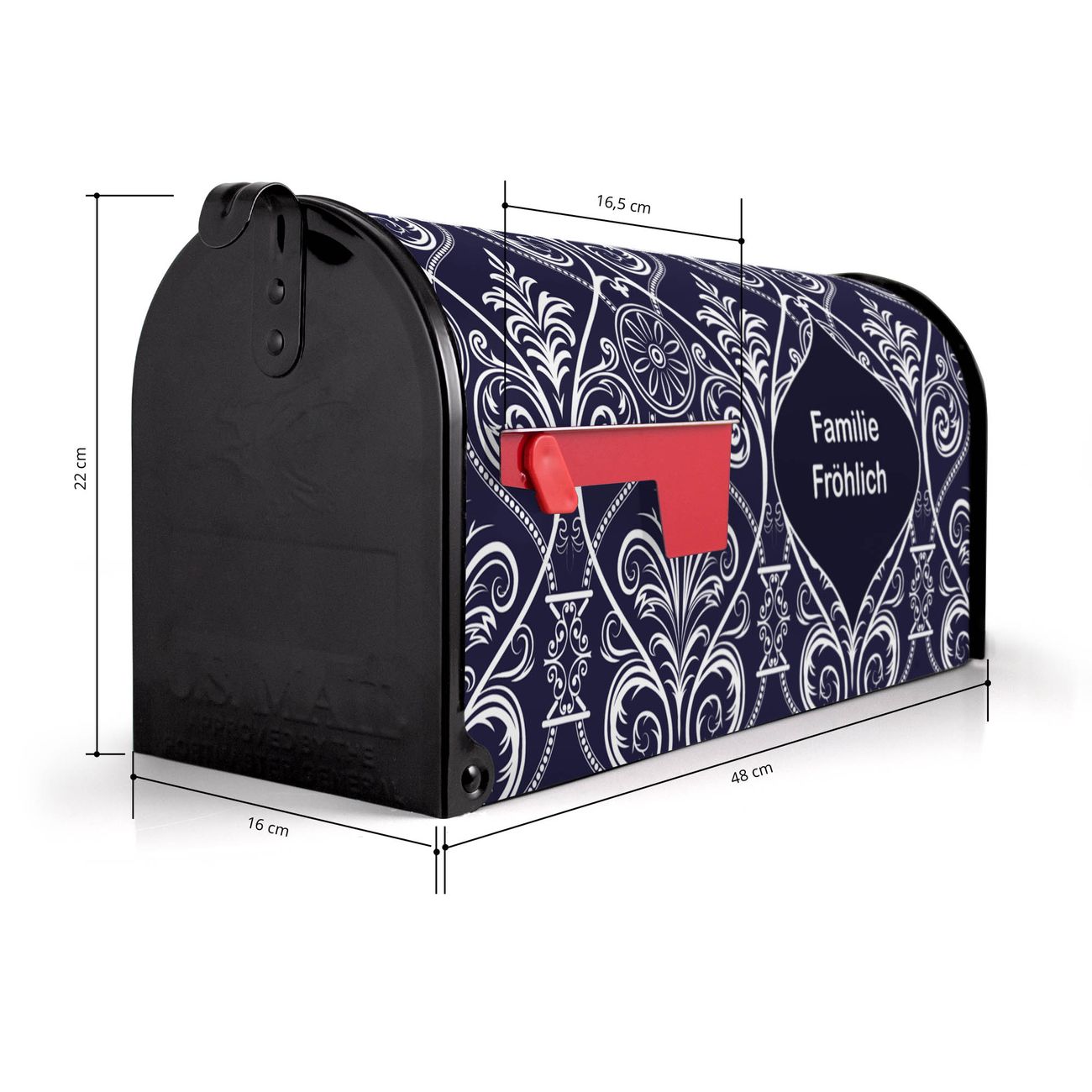 Der amerikanische Briefkasten von banjado mit Blaue Tapete Motiv bietet Ihnen ausreichend Fassungsvermögen, um große A4 Sendungen und Zeitschriften zu empfangen. Die typisch amerikanische rote Fahne zeigt Ihnen an, wenn Sie Post erhalten haben. Die US-Mailbox besteht aus verzinktem Stahlblech welches lackiert wurde und ist 48 x 22 x 16 CM (BxHxT) groß. Die Folie mit Motiv Blaue Tapete besteht aus einer wetter- und UV-resistenten Folie, die mit einem Schutzlaminat überzogen ist, sodass die US Mailbox zusätzlich vor Kratzern geschützt ist. An der Unterkante sind 4 Löcher je Seite um die Mailbox, typisch amerikanisch, an einem Holzpfahl oder einem Zaun zu befestigen. Auf Wunsch können Sie bei uns den passenden Standfuß oder die passende Wandhalterung kaufen um die US-Mailbox sicher zu befestigen. Wir bieten Ihnen ebenfalls Namensschilder, bereits beschriftet oder frei zu beschriften, und verschiedene selbst gestaltete Bitte-Keine-Werbung-Aufkleber.