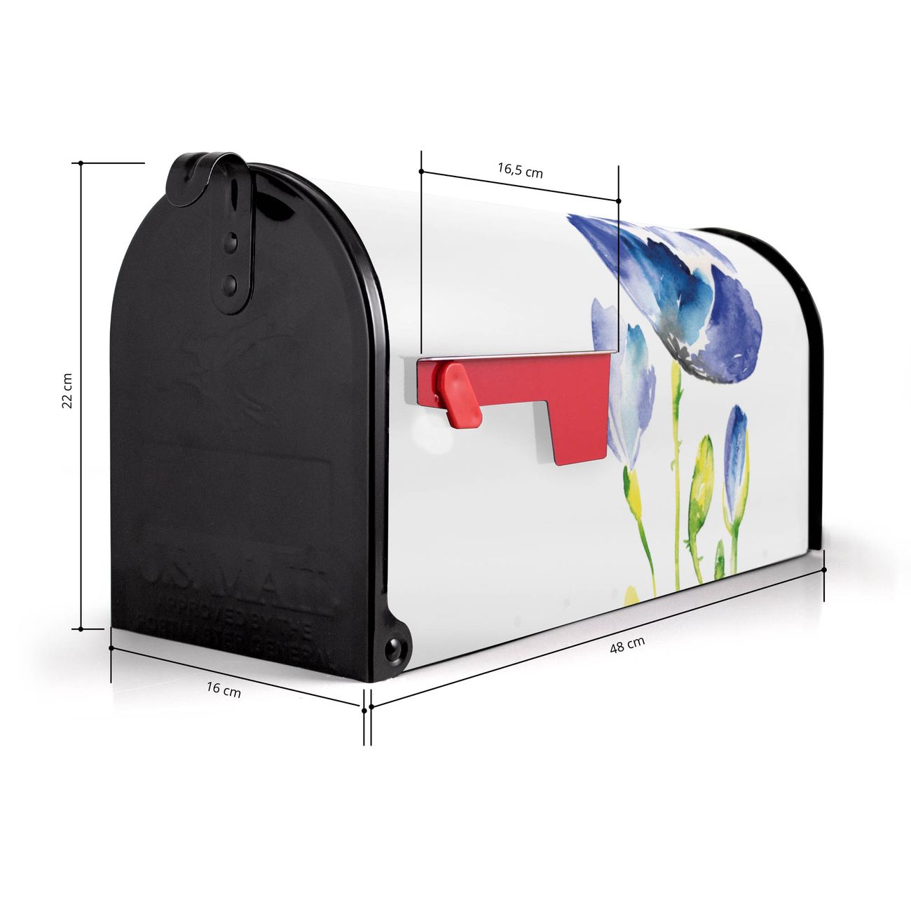 Der amerikanische Briefkasten von banjado mit Blauer Mohn Motiv bietet Ihnen ausreichend Fassungsvermögen, um große A4 Sendungen und Zeitschriften zu empfangen. Die typisch amerikanische rote Fahne zeigt Ihnen an, wenn Sie Post erhalten haben. Die US-Mailbox besteht aus verzinktem Stahlblech welches lackiert wurde und ist 48 x 22 x 16 CM (BxHxT) groß. Die Folie mit Motiv Blauer Mohn besteht aus einer wetter- und UV-resistenten Folie, die mit einem Schutzlaminat überzogen ist, sodass die US Mailbox zusätzlich vor Kratzern geschützt ist. An der Unterkante sind 4 Löcher je Seite um die Mailbox, typisch amerikanisch, an einem Holzpfahl oder einem Zaun zu befestigen. Auf Wunsch können Sie bei uns den passenden Standfuß oder die passende Wandhalterung kaufen um die US-Mailbox sicher zu befestigen. Wir bieten Ihnen ebenfalls Namensschilder, bereits beschriftet oder frei zu beschriften, und verschiedene selbst gestaltete Bitte-Keine-Werbung-Aufkleber.