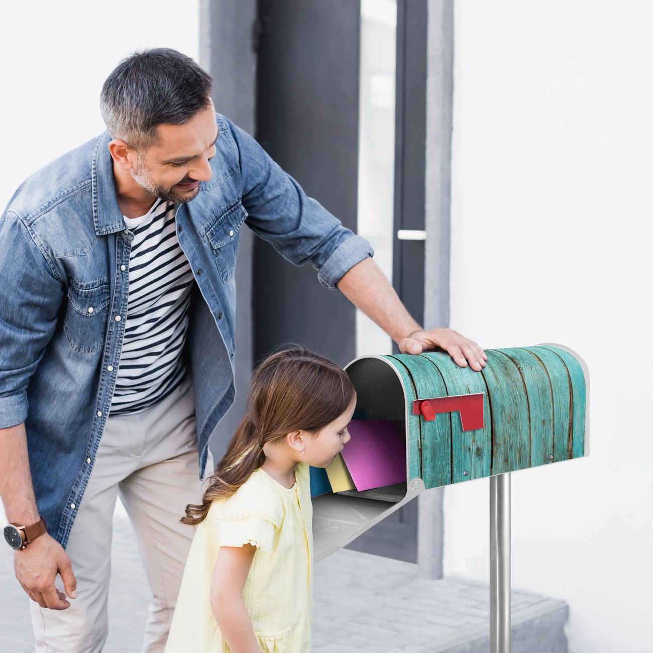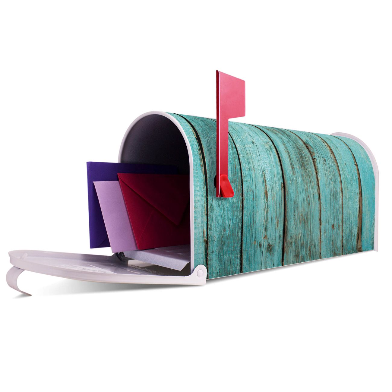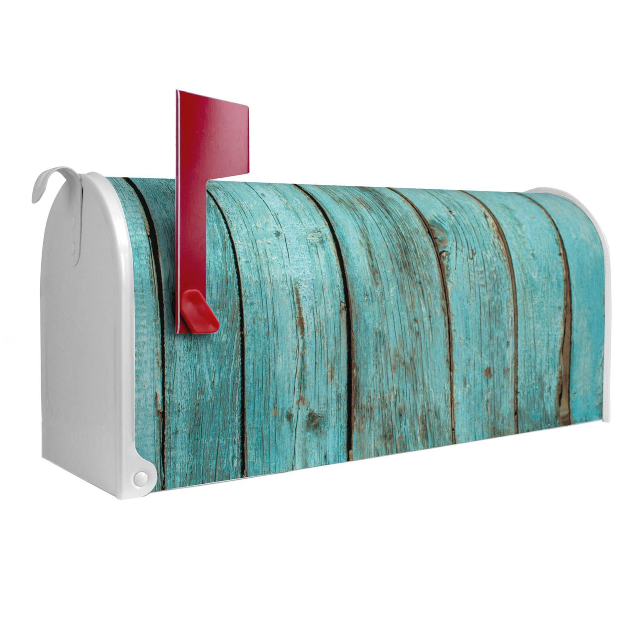 Der amerikanische Briefkasten von banjado mit Blaues Holz Motiv bietet Ihnen ausreichend Fassungsvermögen, um große A4 Sendungen und Zeitschriften zu empfangen. Die typisch amerikanische rote Fahne zeigt Ihnen an, wenn Sie Post erhalten haben. Die US-Mailbox besteht aus verzinktem Stahlblech welches lackiert wurde und ist 48 x 22 x 16 CM (BxHxT) groß. Die Folie mit Motiv Blaues Holz besteht aus einer wetter- und UV-resistenten Folie, die mit einem Schutzlaminat überzogen ist, sodass die US Mailbox zusätzlich vor Kratzern geschützt ist. An der Unterkante sind 4 Löcher je Seite um die Mailbox, typisch amerikanisch, an einem Holzpfahl oder einem Zaun zu befestigen. Auf Wunsch können Sie bei uns den passenden Standfuß oder die passende Wandhalterung kaufen um die US-Mailbox sicher zu befestigen. Wir bieten Ihnen ebenfalls Namensschilder, bereits beschriftet oder frei zu beschriften, und verschiedene selbst gestaltete Bitte-Keine-Werbung-Aufkleber.