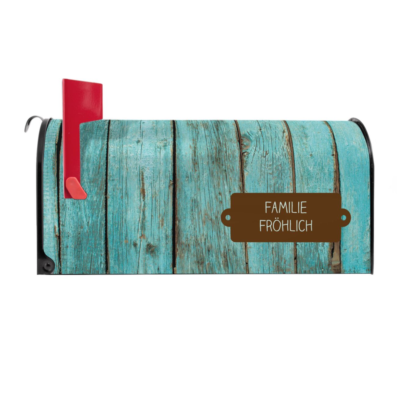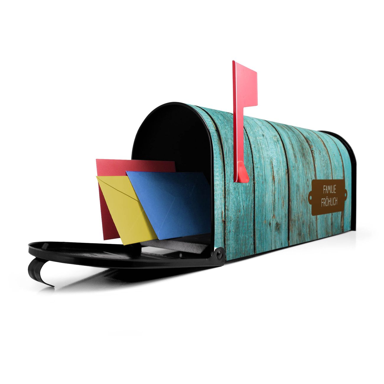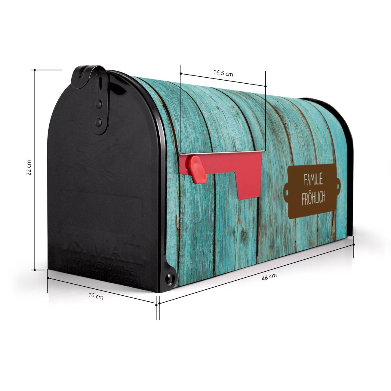 Der amerikanische Briefkasten von banjado mit Blaues Holz Motiv bietet Ihnen ausreichend Fassungsvermögen, um große A4 Sendungen und Zeitschriften zu empfangen. Die typisch amerikanische rote Fahne zeigt Ihnen an, wenn Sie Post erhalten haben. Die US-Mailbox besteht aus verzinktem Stahlblech welches lackiert wurde und ist 48 x 22 x 16 CM (BxHxT) groß. Die Folie mit Motiv Blaues Holz besteht aus einer wetter- und UV-resistenten Folie, die mit einem Schutzlaminat überzogen ist, sodass die US Mailbox zusätzlich vor Kratzern geschützt ist. An der Unterkante sind 4 Löcher je Seite um die Mailbox, typisch amerikanisch, an einem Holzpfahl oder einem Zaun zu befestigen. Auf Wunsch können Sie bei uns den passenden Standfuß oder die passende Wandhalterung kaufen um die US-Mailbox sicher zu befestigen. Wir bieten Ihnen ebenfalls Namensschilder, bereits beschriftet oder frei zu beschriften, und verschiedene selbst gestaltete Bitte-Keine-Werbung-Aufkleber.