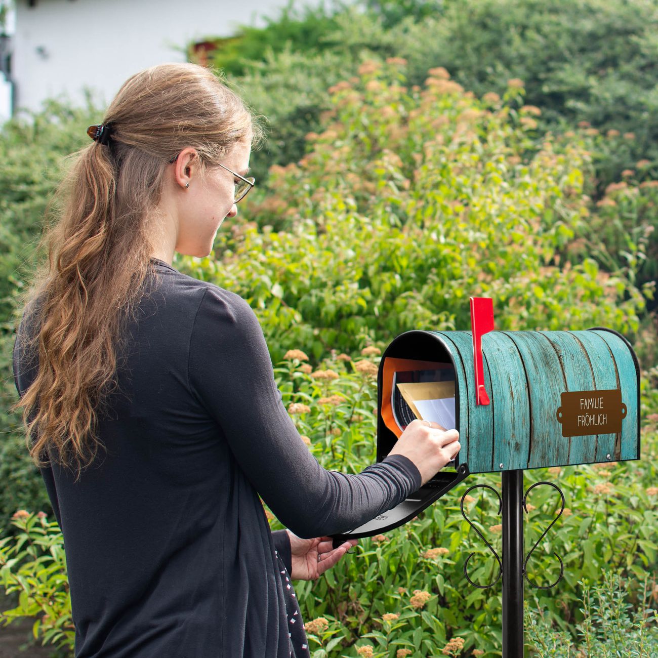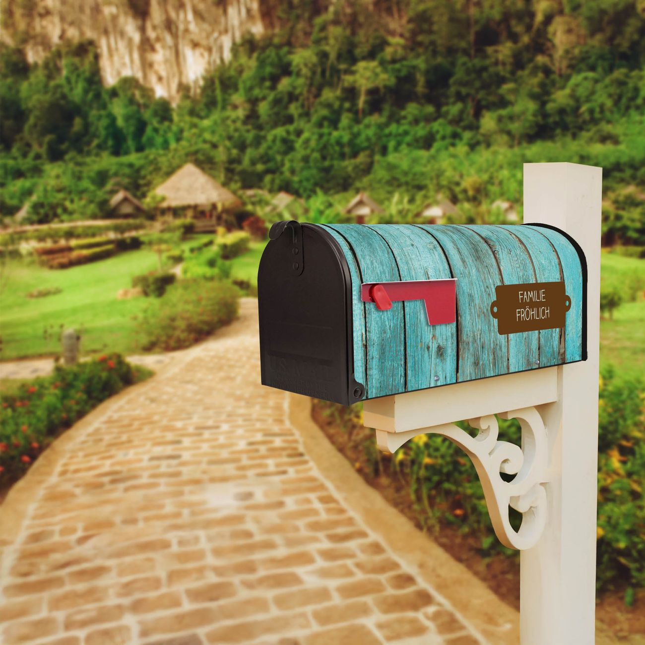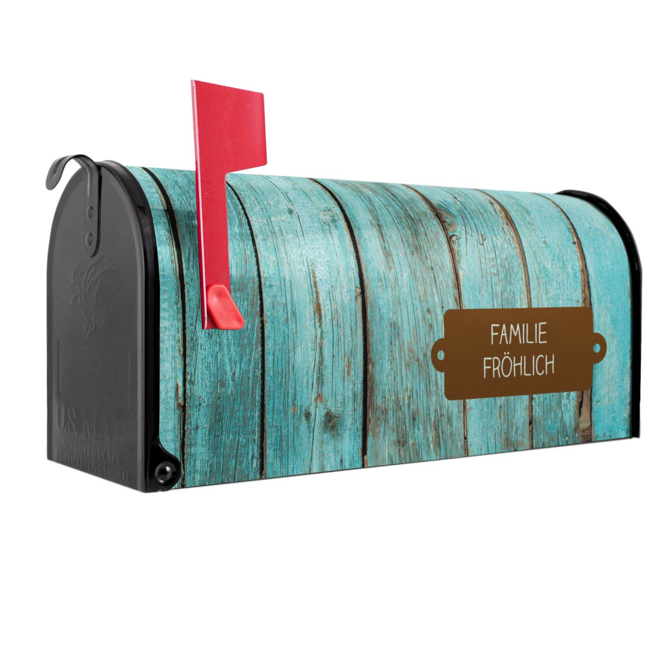 Der amerikanische Briefkasten von banjado mit Blaues Holz Motiv bietet Ihnen ausreichend Fassungsvermögen, um große A4 Sendungen und Zeitschriften zu empfangen. Die typisch amerikanische rote Fahne zeigt Ihnen an, wenn Sie Post erhalten haben. Die US-Mailbox besteht aus verzinktem Stahlblech welches lackiert wurde und ist 48 x 22 x 16 CM (BxHxT) groß. Die Folie mit Motiv Blaues Holz besteht aus einer wetter- und UV-resistenten Folie, die mit einem Schutzlaminat überzogen ist, sodass die US Mailbox zusätzlich vor Kratzern geschützt ist. An der Unterkante sind 4 Löcher je Seite um die Mailbox, typisch amerikanisch, an einem Holzpfahl oder einem Zaun zu befestigen. Auf Wunsch können Sie bei uns den passenden Standfuß oder die passende Wandhalterung kaufen um die US-Mailbox sicher zu befestigen. Wir bieten Ihnen ebenfalls Namensschilder, bereits beschriftet oder frei zu beschriften, und verschiedene selbst gestaltete Bitte-Keine-Werbung-Aufkleber.