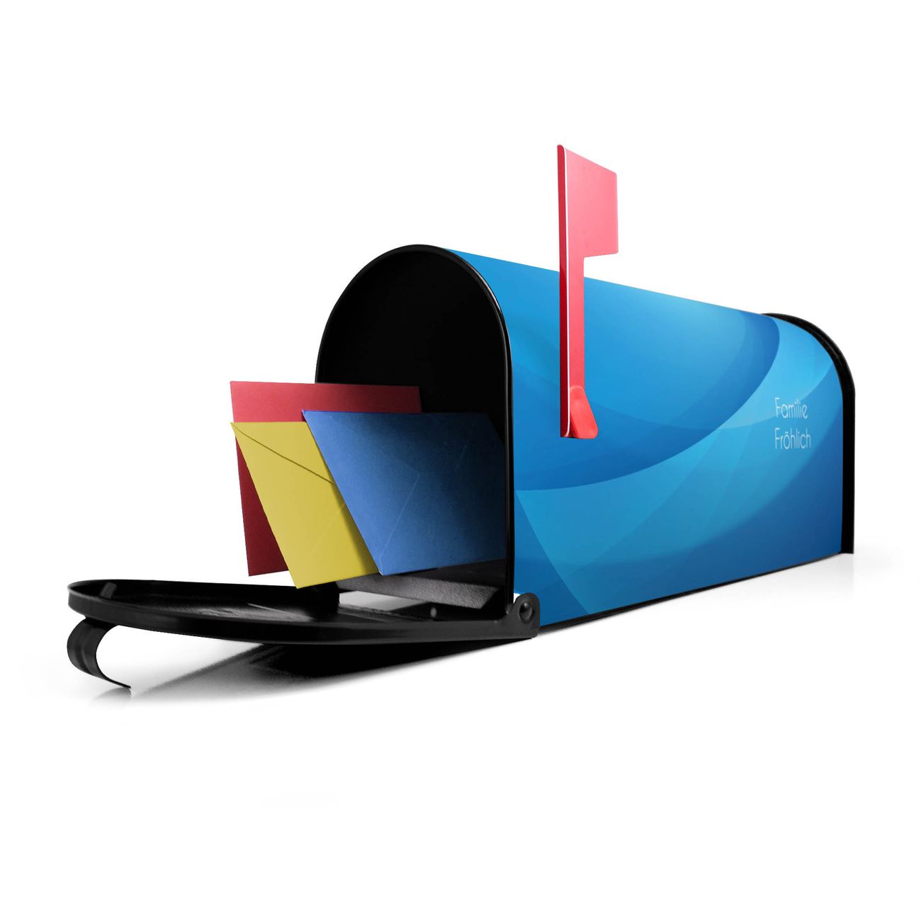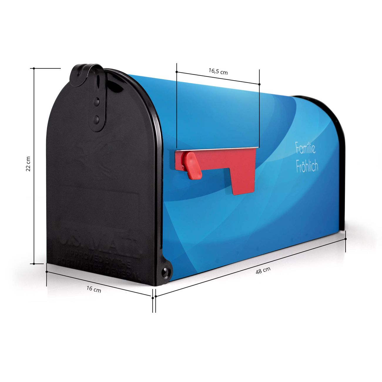 Der amerikanische Briefkasten von banjado mit Blaues Licht Motiv bietet Ihnen ausreichend Fassungsvermögen, um große A4 Sendungen und Zeitschriften zu empfangen. Die typisch amerikanische rote Fahne zeigt Ihnen an, wenn Sie Post erhalten haben. Die US-Mailbox besteht aus verzinktem Stahlblech welches lackiert wurde und ist 48 x 22 x 16 CM (BxHxT) groß. Die Folie mit Motiv Blaues Licht besteht aus einer wetter- und UV-resistenten Folie, die mit einem Schutzlaminat überzogen ist, sodass die US Mailbox zusätzlich vor Kratzern geschützt ist. An der Unterkante sind 4 Löcher je Seite um die Mailbox, typisch amerikanisch, an einem Holzpfahl oder einem Zaun zu befestigen. Auf Wunsch können Sie bei uns den passenden Standfuß oder die passende Wandhalterung kaufen um die US-Mailbox sicher zu befestigen. Wir bieten Ihnen ebenfalls Namensschilder, bereits beschriftet oder frei zu beschriften, und verschiedene selbst gestaltete Bitte-Keine-Werbung-Aufkleber.