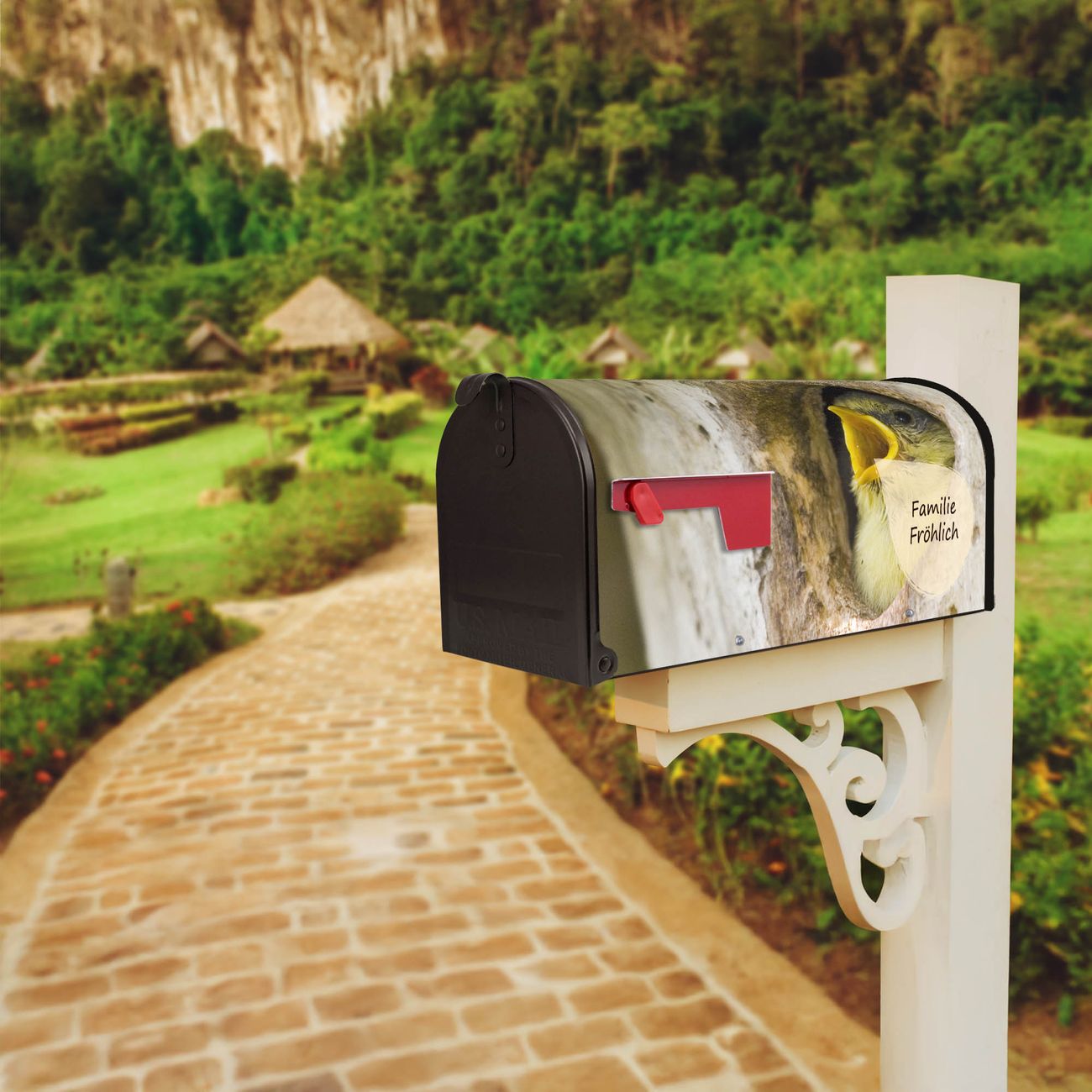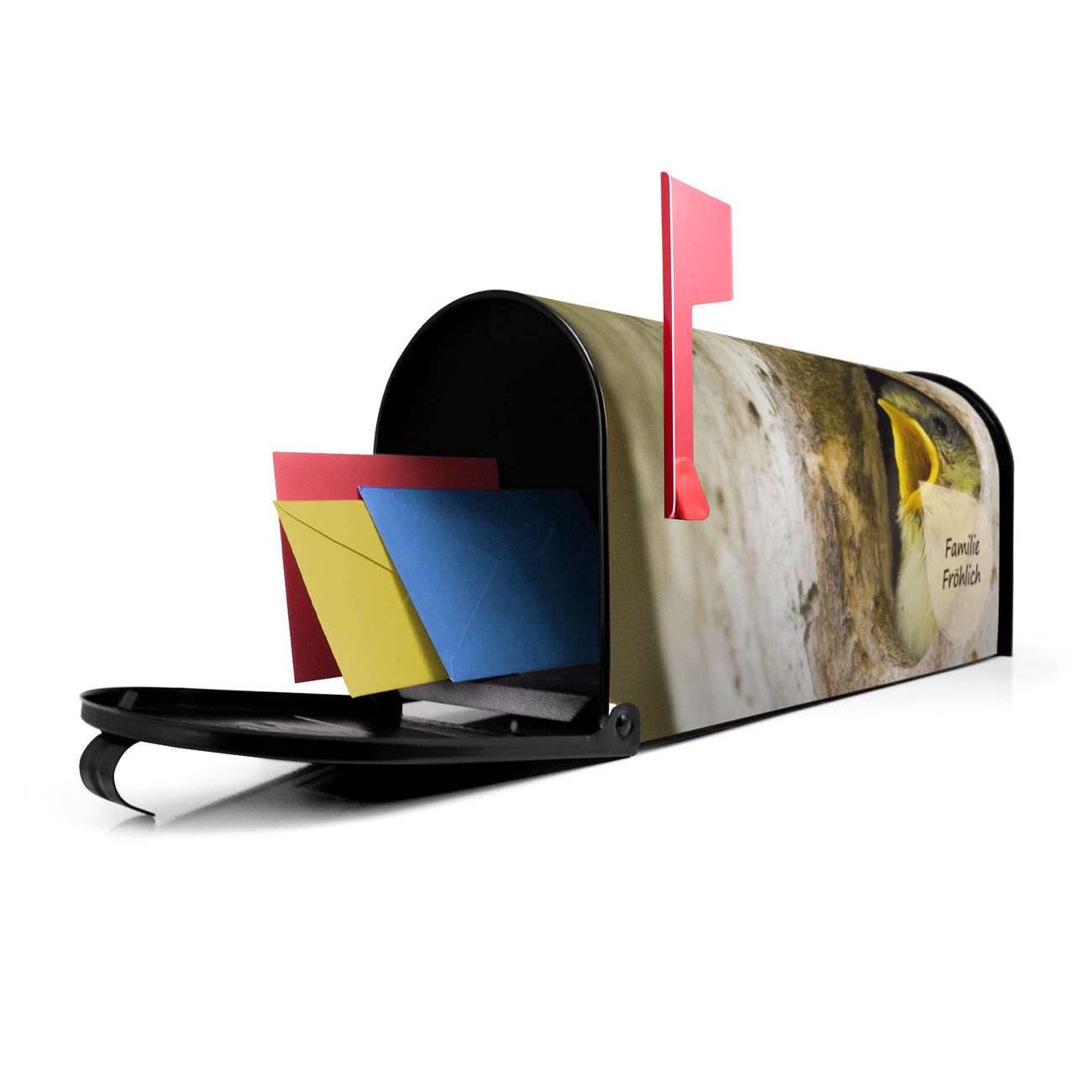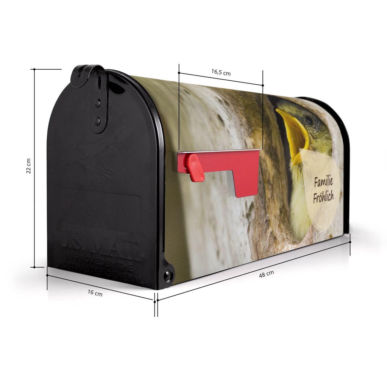 Der amerikanische Briefkasten von banjado mit Blaumeise Motiv bietet Ihnen ausreichend Fassungsvermögen, um große A4 Sendungen und Zeitschriften zu empfangen. Die typisch amerikanische rote Fahne zeigt Ihnen an, wenn Sie Post erhalten haben. Die US-Mailbox besteht aus verzinktem Stahlblech welches lackiert wurde und ist 48 x 22 x 16 CM (BxHxT) groß. Die Folie mit Motiv Blaumeise besteht aus einer wetter- und UV-resistenten Folie, die mit einem Schutzlaminat überzogen ist, sodass die US Mailbox zusätzlich vor Kratzern geschützt ist. An der Unterkante sind 4 Löcher je Seite um die Mailbox, typisch amerikanisch, an einem Holzpfahl oder einem Zaun zu befestigen. Auf Wunsch können Sie bei uns den passenden Standfuß oder die passende Wandhalterung kaufen um die US-Mailbox sicher zu befestigen. Wir bieten Ihnen ebenfalls Namensschilder, bereits beschriftet oder frei zu beschriften, und verschiedene selbst gestaltete Bitte-Keine-Werbung-Aufkleber.