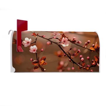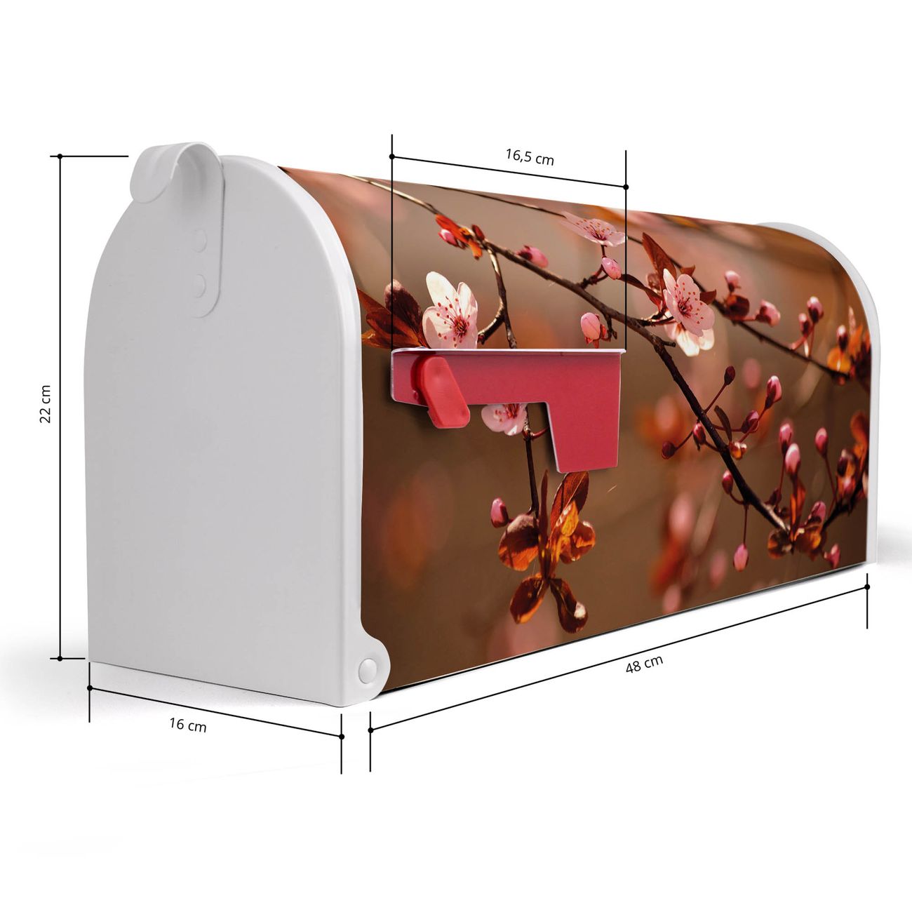 Der amerikanische Briefkasten von banjado mit Blühender Kirschzweig Motiv bietet Ihnen ausreichend Fassungsvermögen, um große A4 Sendungen und Zeitschriften zu empfangen. Die typisch amerikanische rote Fahne zeigt Ihnen an, wenn Sie Post erhalten haben. Die US-Mailbox besteht aus verzinktem Stahlblech welches lackiert wurde und ist 48 x 22 x 16 CM (BxHxT) groß. Die Folie mit Motiv Blühender Kirschzweig besteht aus einer wetter- und UV-resistenten Folie, die mit einem Schutzlaminat überzogen ist, sodass die US Mailbox zusätzlich vor Kratzern geschützt ist. An der Unterkante sind 4 Löcher je Seite um die Mailbox, typisch amerikanisch, an einem Holzpfahl oder einem Zaun zu befestigen. Auf Wunsch können Sie bei uns den passenden Standfuß oder die passende Wandhalterung kaufen um die US-Mailbox sicher zu befestigen. Wir bieten Ihnen ebenfalls Namensschilder, bereits beschriftet oder frei zu beschriften, und verschiedene selbst gestaltete Bitte-Keine-Werbung-Aufkleber.