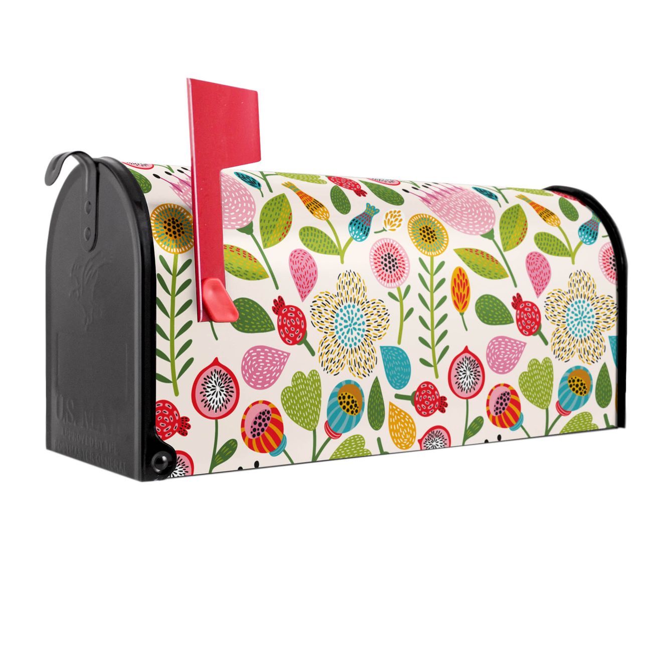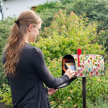 Der amerikanische Briefkasten von banjado mit Blumen Naiv Motiv bietet Ihnen ausreichend Fassungsvermögen, um große A4 Sendungen und Zeitschriften zu empfangen. Die typisch amerikanische rote Fahne zeigt Ihnen an, wenn Sie Post erhalten haben. Die US-Mailbox besteht aus verzinktem Stahlblech welches lackiert wurde und ist 48 x 22 x 16 CM (BxHxT) groß. Die Folie mit Motiv Blumen Naiv besteht aus einer wetter- und UV-resistenten Folie, die mit einem Schutzlaminat überzogen ist, sodass die US Mailbox zusätzlich vor Kratzern geschützt ist. An der Unterkante sind 4 Löcher je Seite um die Mailbox, typisch amerikanisch, an einem Holzpfahl oder einem Zaun zu befestigen. Auf Wunsch können Sie bei uns den passenden Standfuß oder die passende Wandhalterung kaufen um die US-Mailbox sicher zu befestigen. Wir bieten Ihnen ebenfalls Namensschilder, bereits beschriftet oder frei zu beschriften, und verschiedene selbst gestaltete Bitte-Keine-Werbung-Aufkleber.