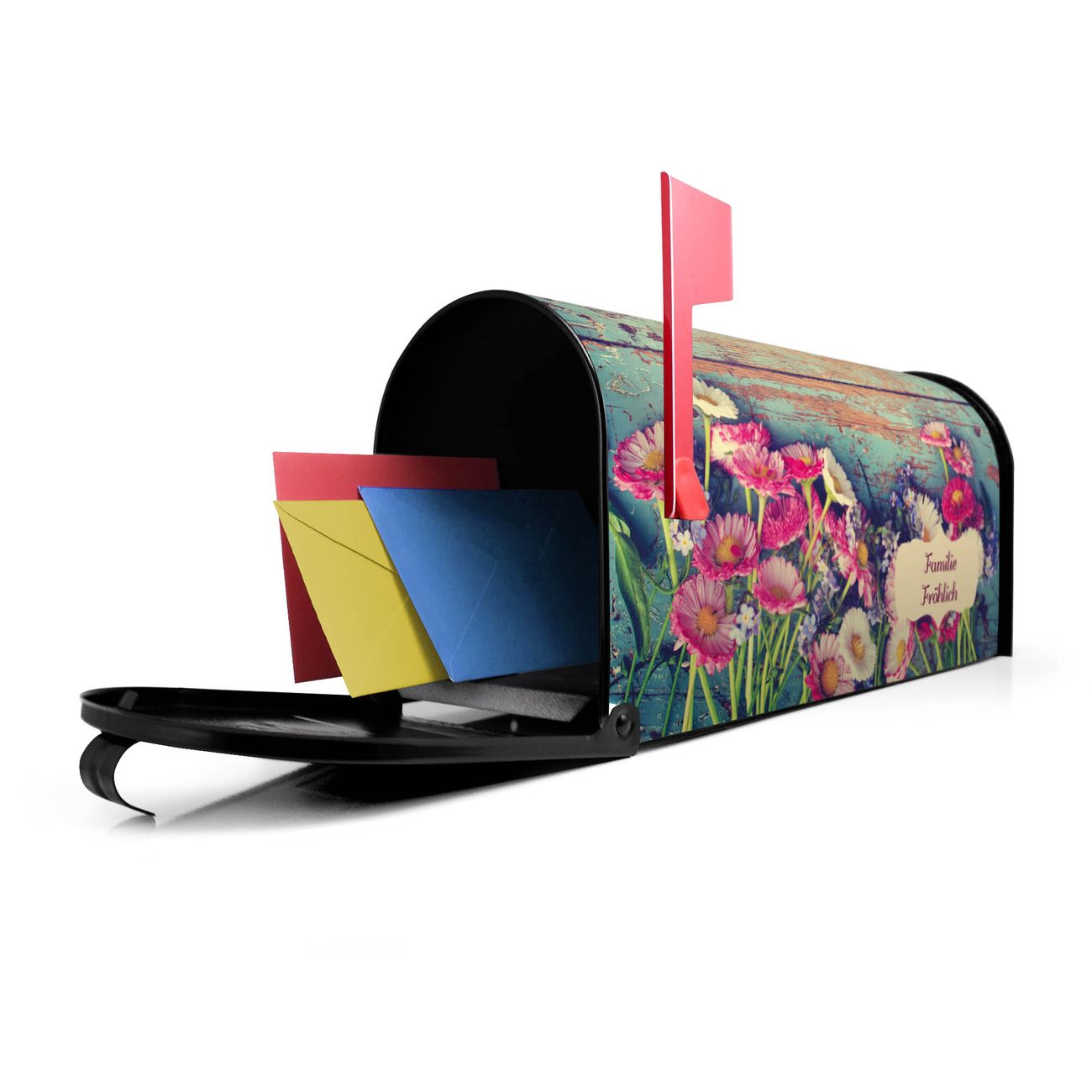 Der amerikanische Briefkasten von banjado mit Blumenpfücken Motiv bietet Ihnen ausreichend Fassungsvermögen, um große A4 Sendungen und Zeitschriften zu empfangen. Die typisch amerikanische rote Fahne zeigt Ihnen an, wenn Sie Post erhalten haben. Die US-Mailbox besteht aus verzinktem Stahlblech welches lackiert wurde und ist 48 x 22 x 16 CM (BxHxT) groß. Die Folie mit Motiv Blumenpfücken besteht aus einer wetter- und UV-resistenten Folie, die mit einem Schutzlaminat überzogen ist, sodass die US Mailbox zusätzlich vor Kratzern geschützt ist. An der Unterkante sind 4 Löcher je Seite um die Mailbox, typisch amerikanisch, an einem Holzpfahl oder einem Zaun zu befestigen. Auf Wunsch können Sie bei uns den passenden Standfuß oder die passende Wandhalterung kaufen um die US-Mailbox sicher zu befestigen. Wir bieten Ihnen ebenfalls Namensschilder, bereits beschriftet oder frei zu beschriften, und verschiedene selbst gestaltete Bitte-Keine-Werbung-Aufkleber.