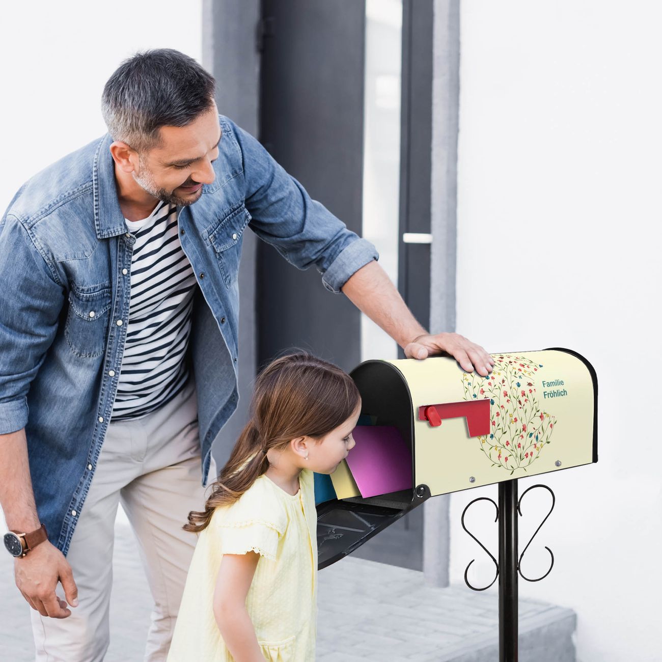 Unser amerikanischer Briefkasten mit dem Motiv Blumenreigen hat ein sehr ansprechendes und ausgefallenes Design, ist in der Grundfarbe weiß, grün oder schwarz erhältlich. Damit entlocken Sie Ihren Nachbarn und dem Postboten immer wieder ein Lächeln. Die Mailbox ist ein Original Import aus Mississippi USA und wird von unserer kleinen Manufaktur in Sachsen von Hand veredelt. Die US-Mailbox bietet ausreichend Platz auch für große Sendungen, eine Fahne die Ihnen Post anzeigt, wetterfestes und äußerst stabiles Material - so macht Post empfangen Freude.
