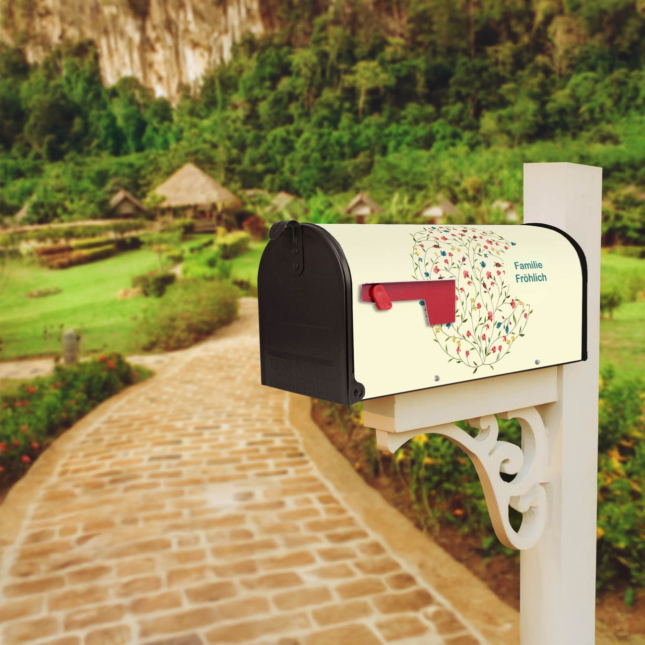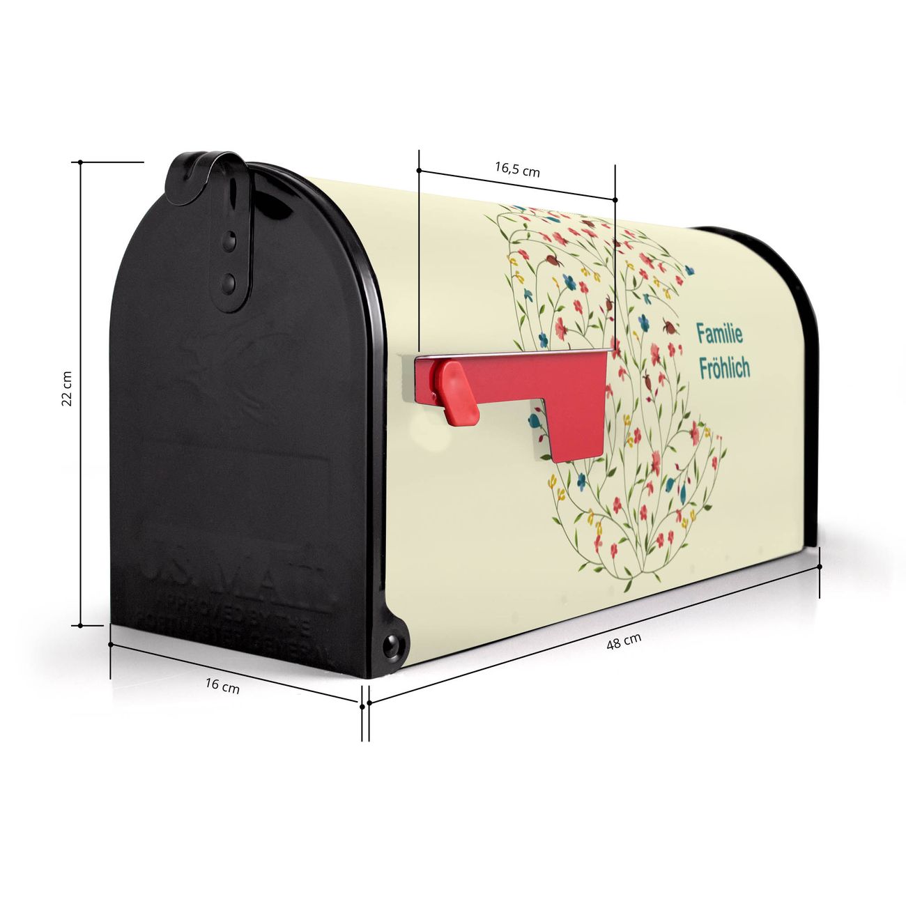 Der amerikanische Briefkasten von banjado mit Blumenreigen Motiv bietet Ihnen ausreichend Fassungsvermögen, um große A4 Sendungen und Zeitschriften zu empfangen. Die typisch amerikanische rote Fahne zeigt Ihnen an, wenn Sie Post erhalten haben. Die US-Mailbox besteht aus verzinktem Stahlblech welches lackiert wurde und ist 48 x 22 x 16 CM (BxHxT) groß. Die Folie mit Motiv Blumenreigen besteht aus einer wetter- und UV-resistenten Folie, die mit einem Schutzlaminat überzogen ist, sodass die US Mailbox zusätzlich vor Kratzern geschützt ist. An der Unterkante sind 4 Löcher je Seite um die Mailbox, typisch amerikanisch, an einem Holzpfahl oder einem Zaun zu befestigen. Auf Wunsch können Sie bei uns den passenden Standfuß oder die passende Wandhalterung kaufen um die US-Mailbox sicher zu befestigen. Wir bieten Ihnen ebenfalls Namensschilder, bereits beschriftet oder frei zu beschriften, und verschiedene selbst gestaltete Bitte-Keine-Werbung-Aufkleber.