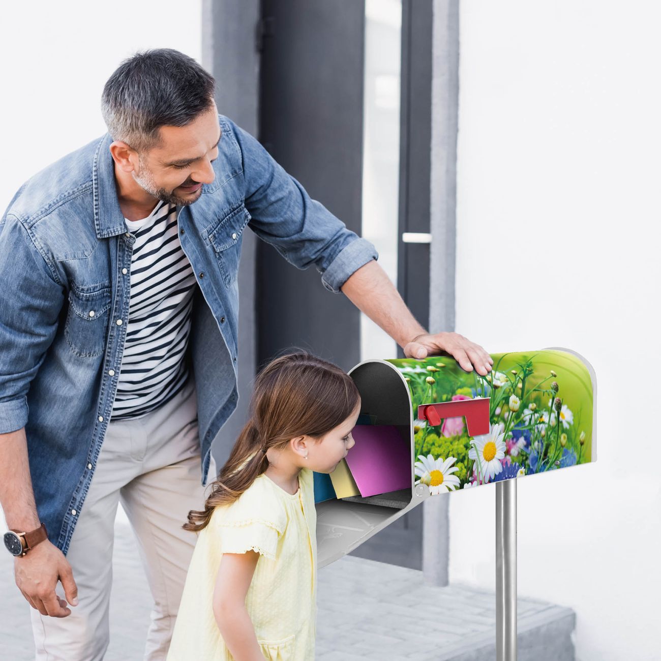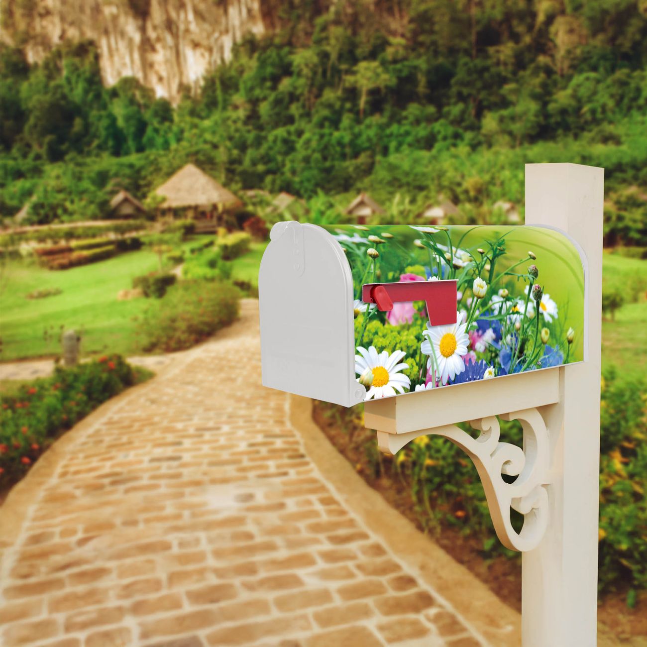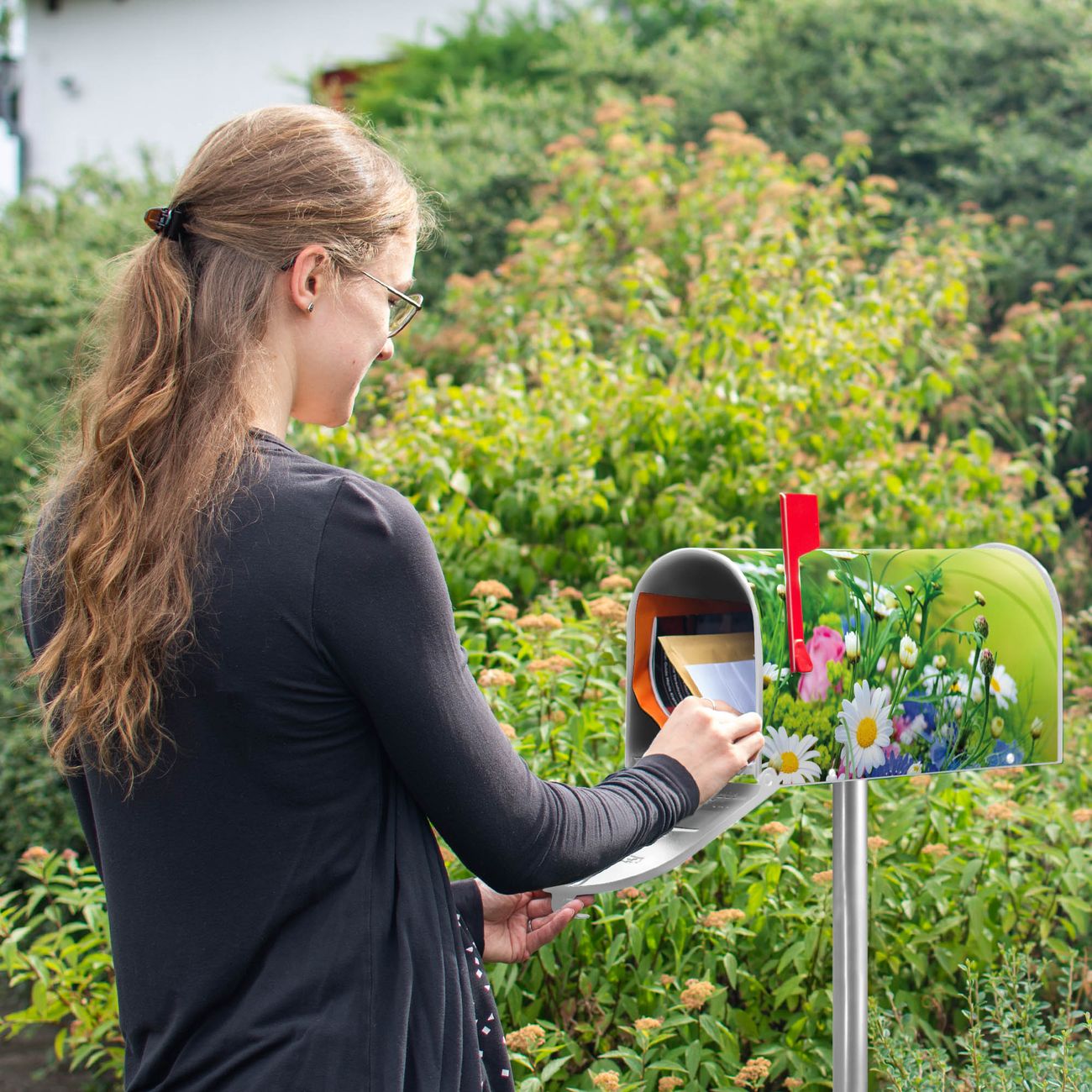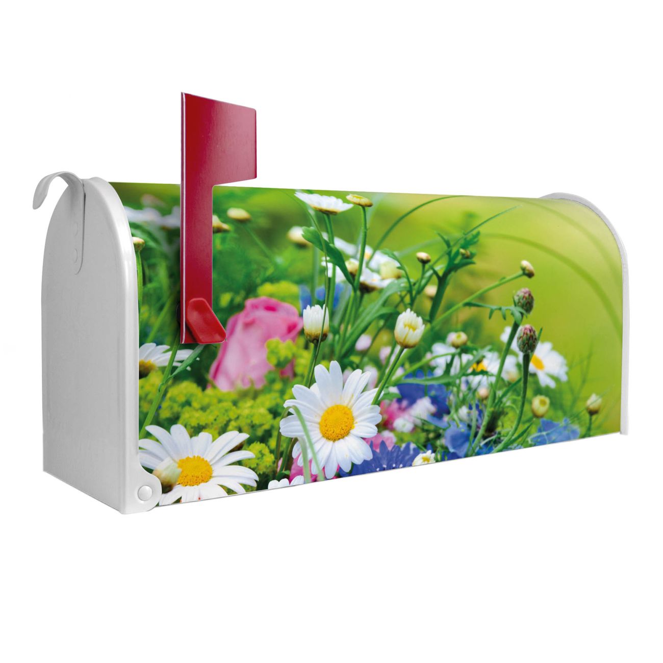 Der amerikanische Briefkasten von banjado mit Blumenstrauß Motiv bietet Ihnen ausreichend Fassungsvermögen, um große A4 Sendungen und Zeitschriften zu empfangen. Die typisch amerikanische rote Fahne zeigt Ihnen an, wenn Sie Post erhalten haben. Die US-Mailbox besteht aus verzinktem Stahlblech welches lackiert wurde und ist 48 x 22 x 16 CM (BxHxT) groß. Die Folie mit Motiv Blumenstrauß besteht aus einer wetter- und UV-resistenten Folie, die mit einem Schutzlaminat überzogen ist, sodass die US Mailbox zusätzlich vor Kratzern geschützt ist. An der Unterkante sind 4 Löcher je Seite um die Mailbox, typisch amerikanisch, an einem Holzpfahl oder einem Zaun zu befestigen. Auf Wunsch können Sie bei uns den passenden Standfuß oder die passende Wandhalterung kaufen um die US-Mailbox sicher zu befestigen. Wir bieten Ihnen ebenfalls Namensschilder, bereits beschriftet oder frei zu beschriften, und verschiedene selbst gestaltete Bitte-Keine-Werbung-Aufkleber.