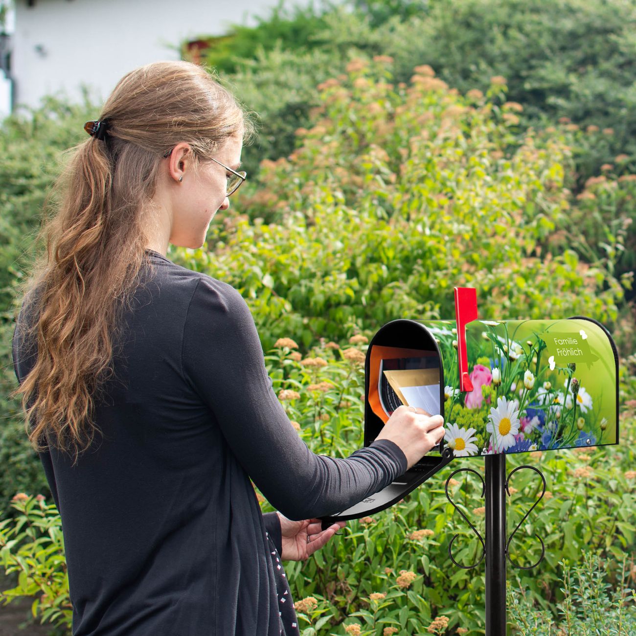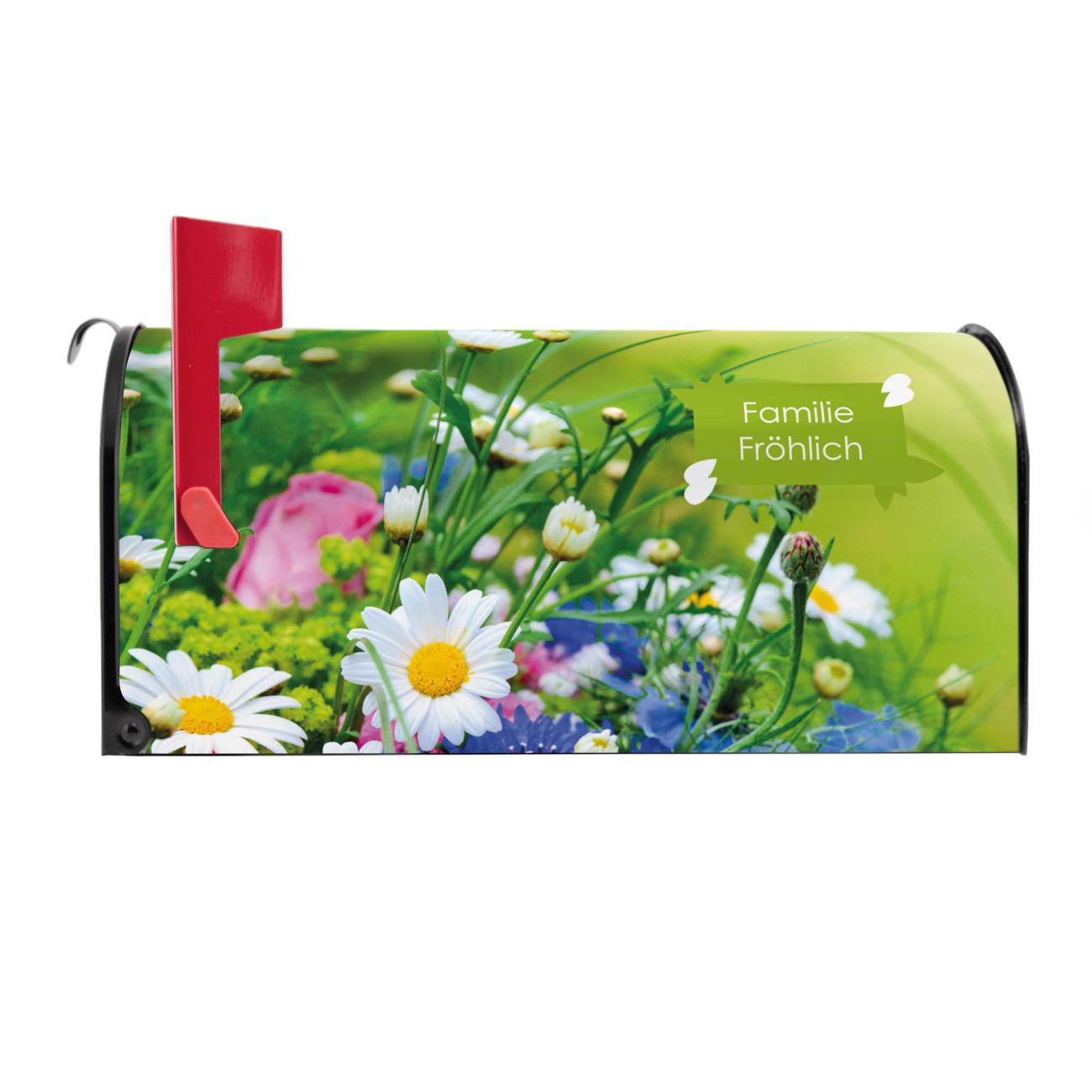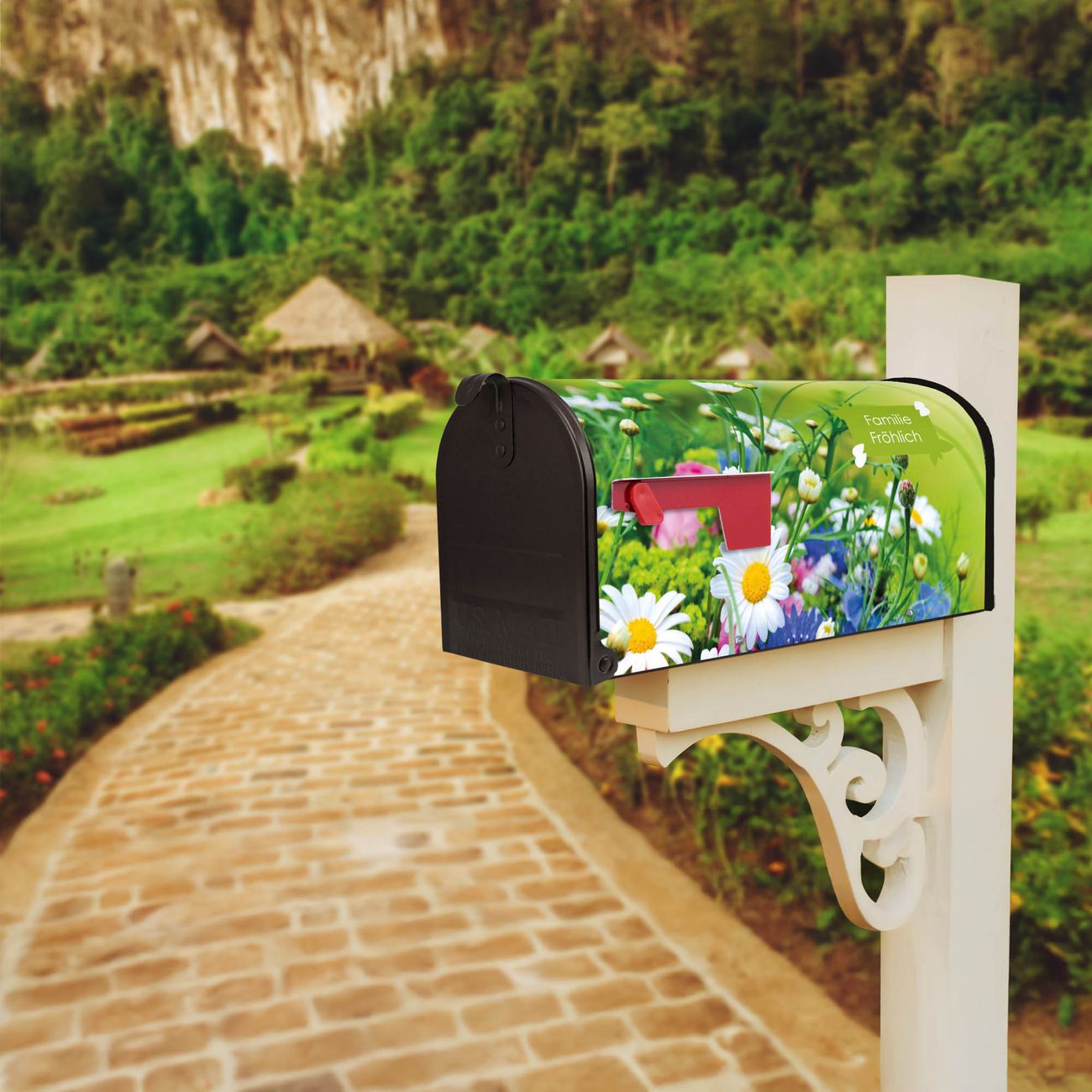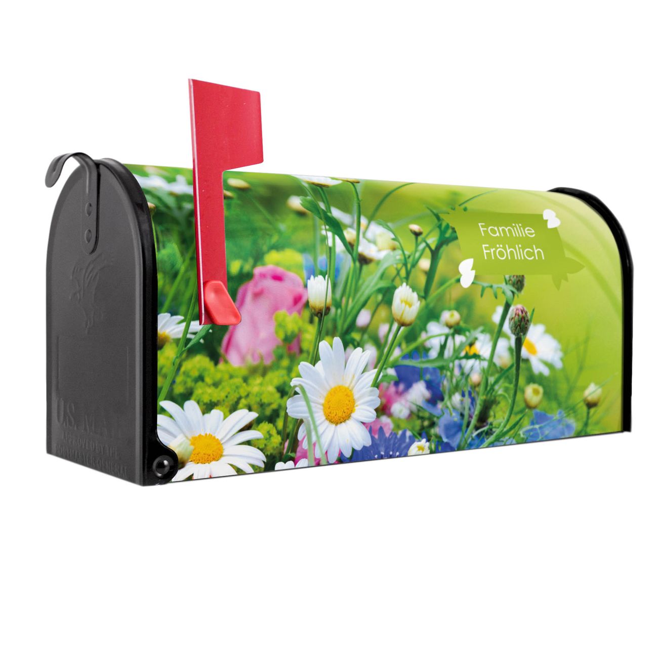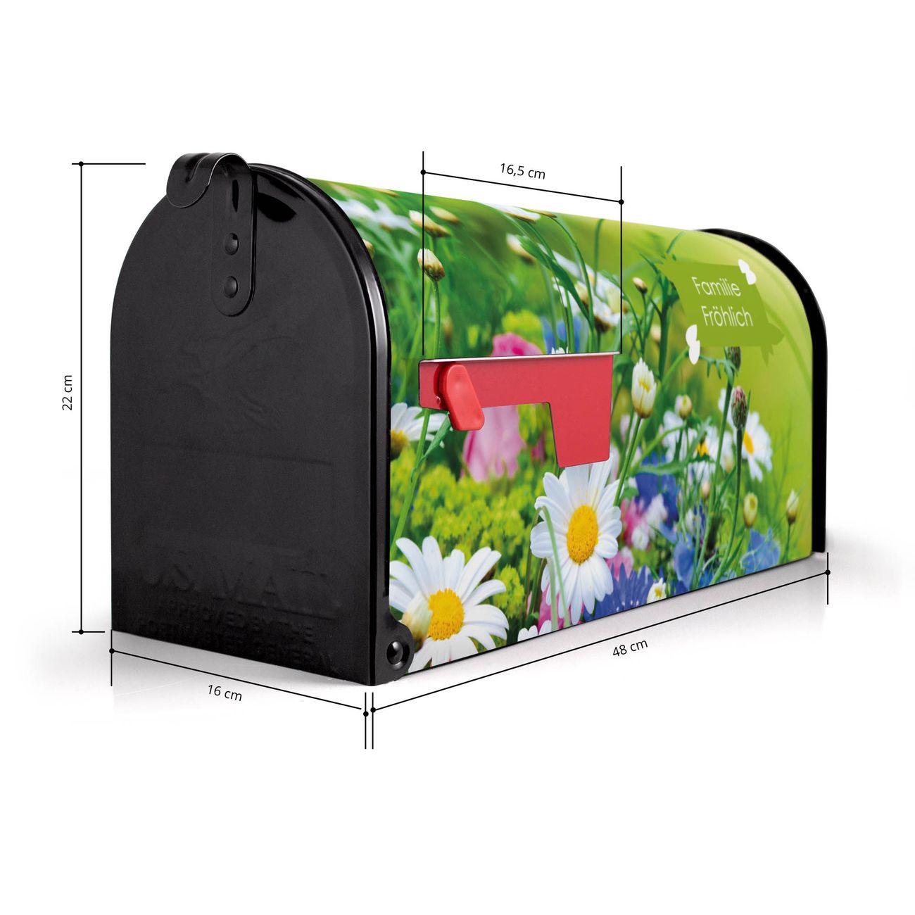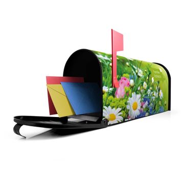 Der amerikanische Briefkasten von banjado mit Blumenstrauß Motiv bietet Ihnen ausreichend Fassungsvermögen, um große A4 Sendungen und Zeitschriften zu empfangen. Die typisch amerikanische rote Fahne zeigt Ihnen an, wenn Sie Post erhalten haben. Die US-Mailbox besteht aus verzinktem Stahlblech welches lackiert wurde und ist 48 x 22 x 16 CM (BxHxT) groß. Die Folie mit Motiv Blumenstrauß besteht aus einer wetter- und UV-resistenten Folie, die mit einem Schutzlaminat überzogen ist, sodass die US Mailbox zusätzlich vor Kratzern geschützt ist. An der Unterkante sind 4 Löcher je Seite um die Mailbox, typisch amerikanisch, an einem Holzpfahl oder einem Zaun zu befestigen. Auf Wunsch können Sie bei uns den passenden Standfuß oder die passende Wandhalterung kaufen um die US-Mailbox sicher zu befestigen. Wir bieten Ihnen ebenfalls Namensschilder, bereits beschriftet oder frei zu beschriften, und verschiedene selbst gestaltete Bitte-Keine-Werbung-Aufkleber.
