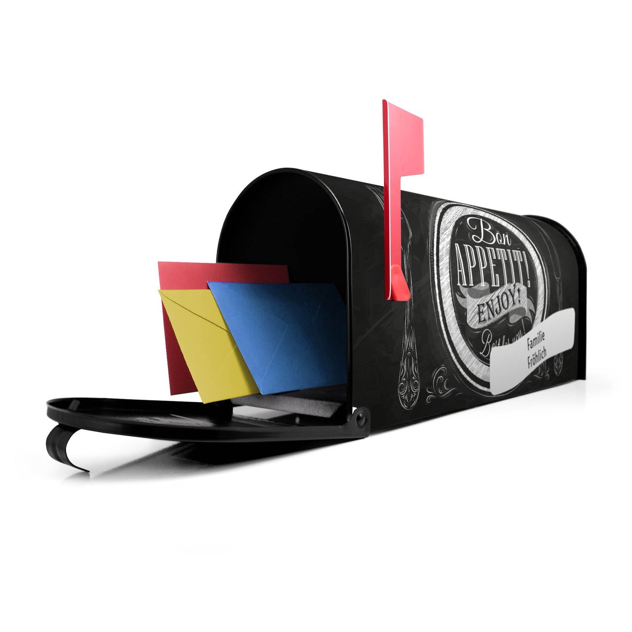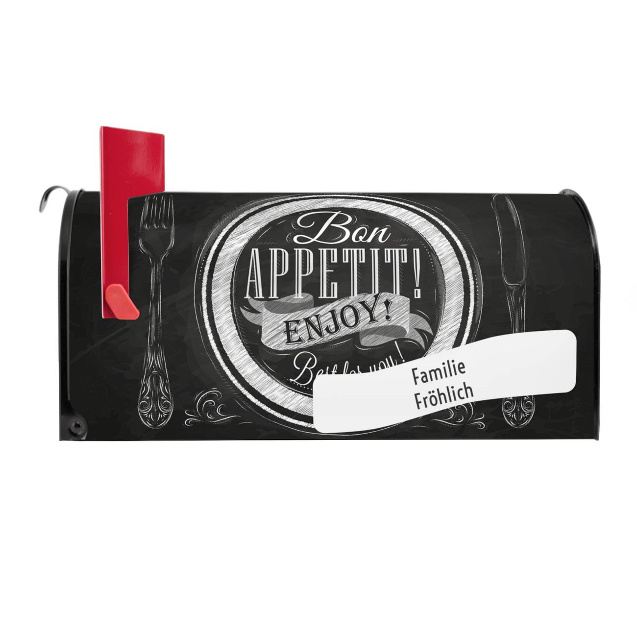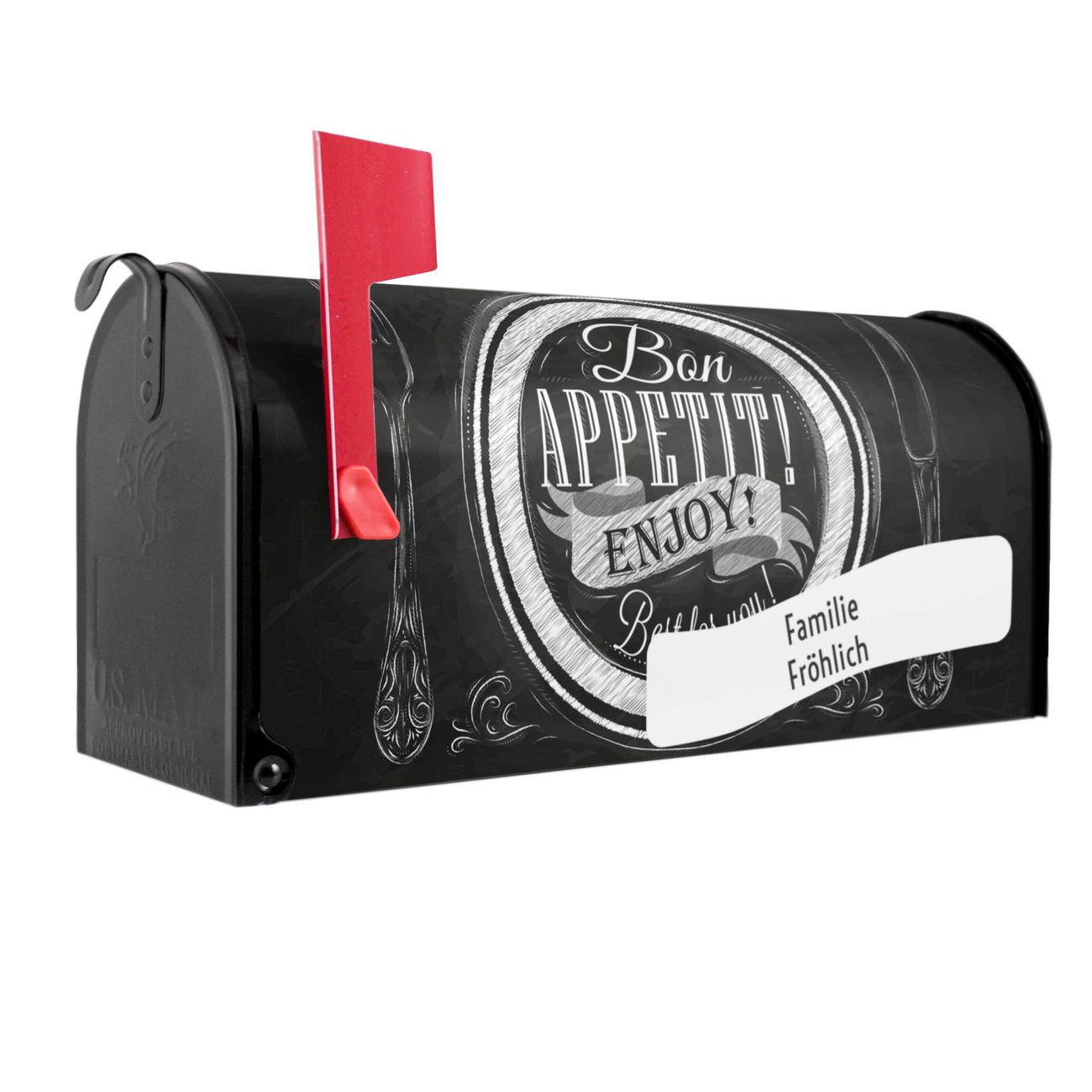 Unser amerikanischer Briefkasten mit dem Motiv Bon Appetit hat ein sehr ansprechendes und ausgefallenes Design, ist in der Grundfarbe weiß, grün oder schwarz erhältlich. Damit entlocken Sie Ihren Nachbarn und dem Postboten immer wieder ein Lächeln. Die Mailbox ist ein Original Import aus Mississippi USA und wird von unserer kleinen Manufaktur in Sachsen von Hand veredelt. Die US-Mailbox bietet ausreichend Platz auch für große Sendungen, eine Fahne die Ihnen Post anzeigt, wetterfestes und äußerst stabiles Material - so macht Post empfangen Freude.