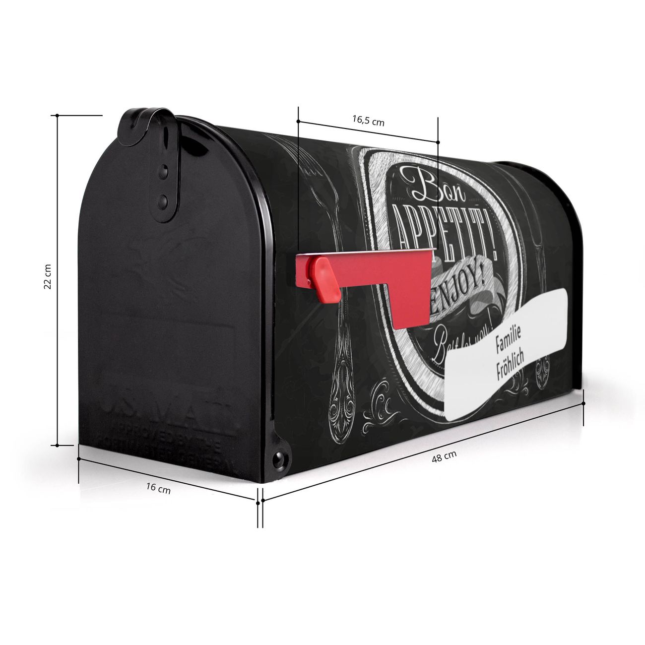 Der amerikanische Briefkasten von banjado mit Bon Appetit Motiv bietet Ihnen ausreichend Fassungsvermögen, um große A4 Sendungen und Zeitschriften zu empfangen. Die typisch amerikanische rote Fahne zeigt Ihnen an, wenn Sie Post erhalten haben. Die US-Mailbox besteht aus verzinktem Stahlblech welches lackiert wurde und ist 48 x 22 x 16 CM (BxHxT) groß. Die Folie mit Motiv Bon Appetit besteht aus einer wetter- und UV-resistenten Folie, die mit einem Schutzlaminat überzogen ist, sodass die US Mailbox zusätzlich vor Kratzern geschützt ist. An der Unterkante sind 4 Löcher je Seite um die Mailbox, typisch amerikanisch, an einem Holzpfahl oder einem Zaun zu befestigen. Auf Wunsch können Sie bei uns den passenden Standfuß oder die passende Wandhalterung kaufen um die US-Mailbox sicher zu befestigen. Wir bieten Ihnen ebenfalls Namensschilder, bereits beschriftet oder frei zu beschriften, und verschiedene selbst gestaltete Bitte-Keine-Werbung-Aufkleber.