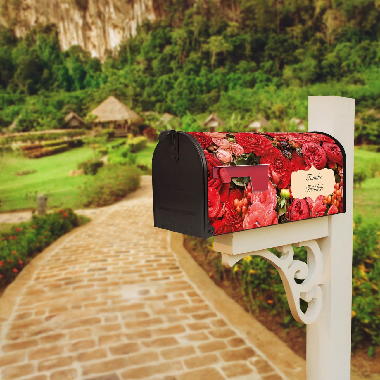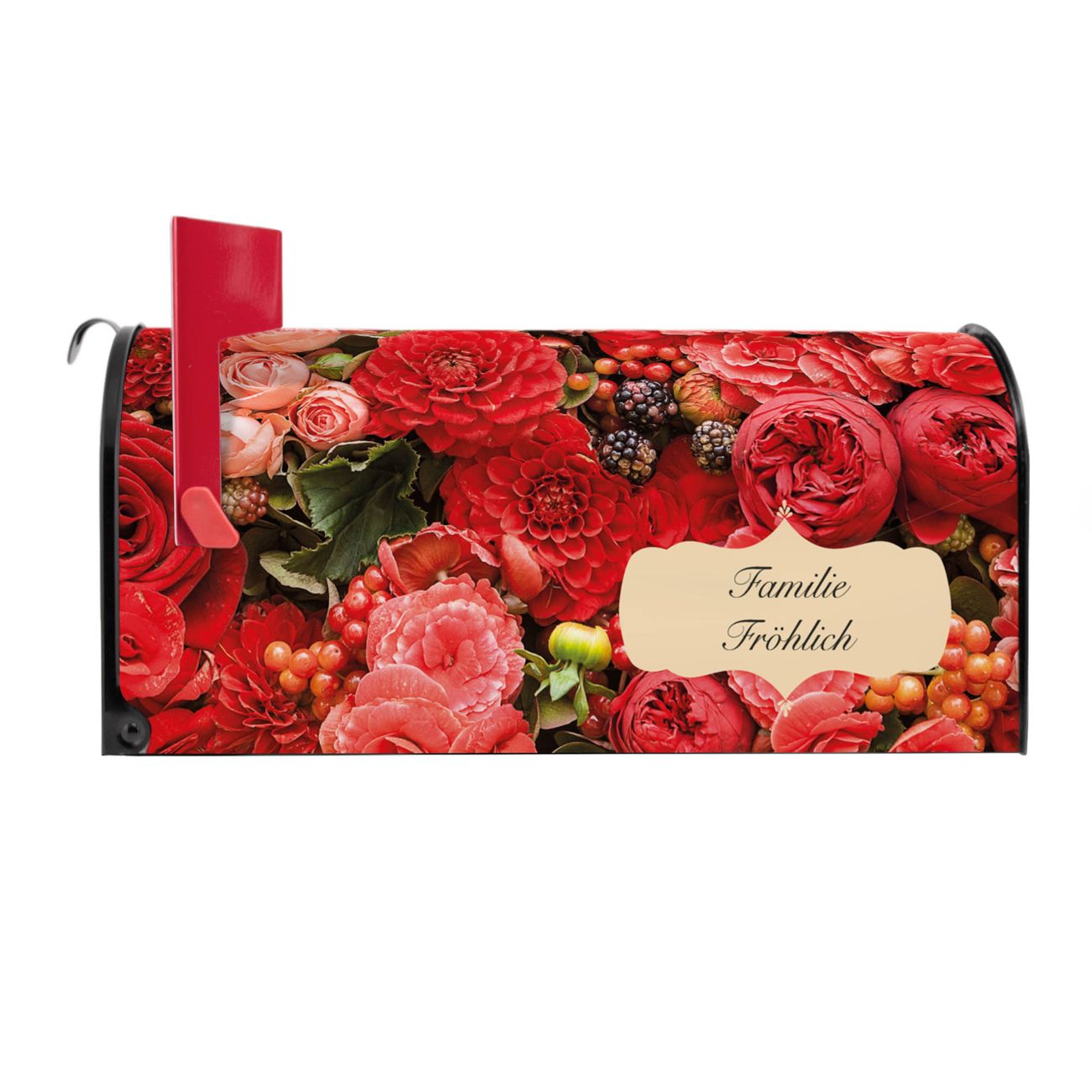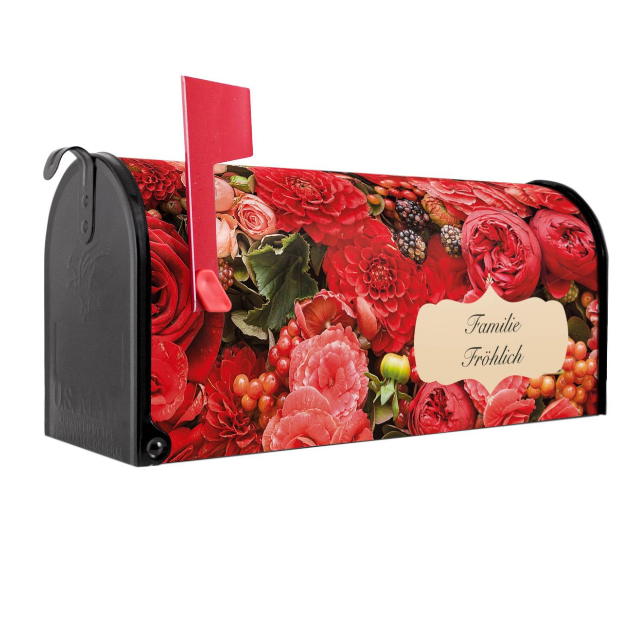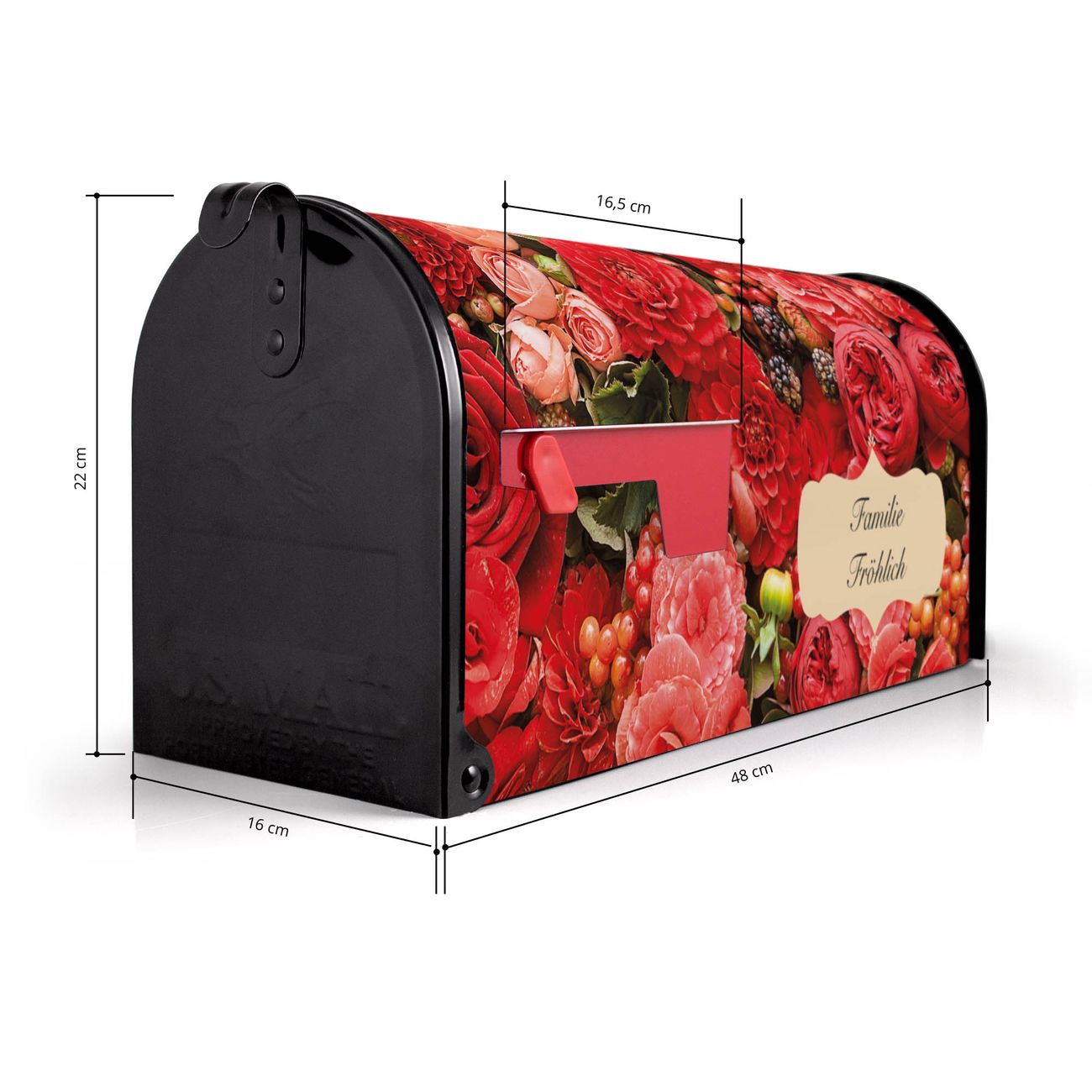 Der amerikanische Briefkasten von banjado mit Bouquet in Rot Motiv bietet Ihnen ausreichend Fassungsvermögen, um große A4 Sendungen und Zeitschriften zu empfangen. Die typisch amerikanische rote Fahne zeigt Ihnen an, wenn Sie Post erhalten haben. Die US-Mailbox besteht aus verzinktem Stahlblech welches lackiert wurde und ist 48 x 22 x 16 CM (BxHxT) groß. Die Folie mit Motiv Bouquet in Rot besteht aus einer wetter- und UV-resistenten Folie, die mit einem Schutzlaminat überzogen ist, sodass die US Mailbox zusätzlich vor Kratzern geschützt ist. An der Unterkante sind 4 Löcher je Seite um die Mailbox, typisch amerikanisch, an einem Holzpfahl oder einem Zaun zu befestigen. Auf Wunsch können Sie bei uns den passenden Standfuß oder die passende Wandhalterung kaufen um die US-Mailbox sicher zu befestigen. Wir bieten Ihnen ebenfalls Namensschilder, bereits beschriftet oder frei zu beschriften, und verschiedene selbst gestaltete Bitte-Keine-Werbung-Aufkleber.