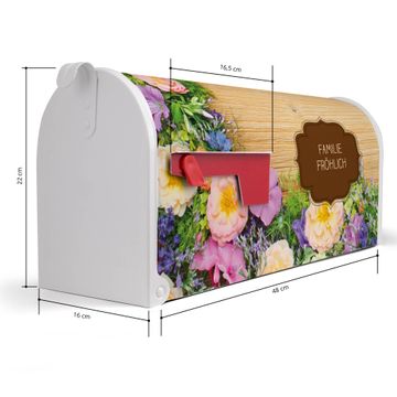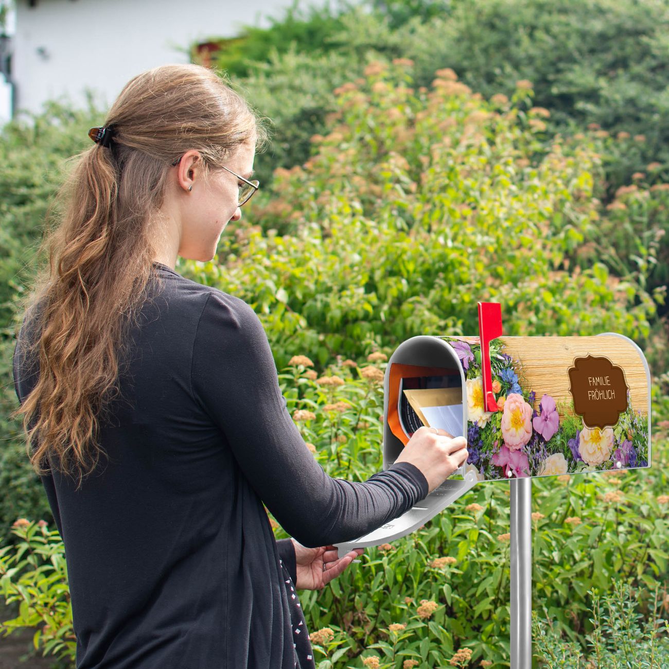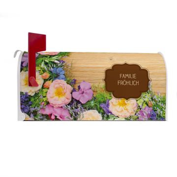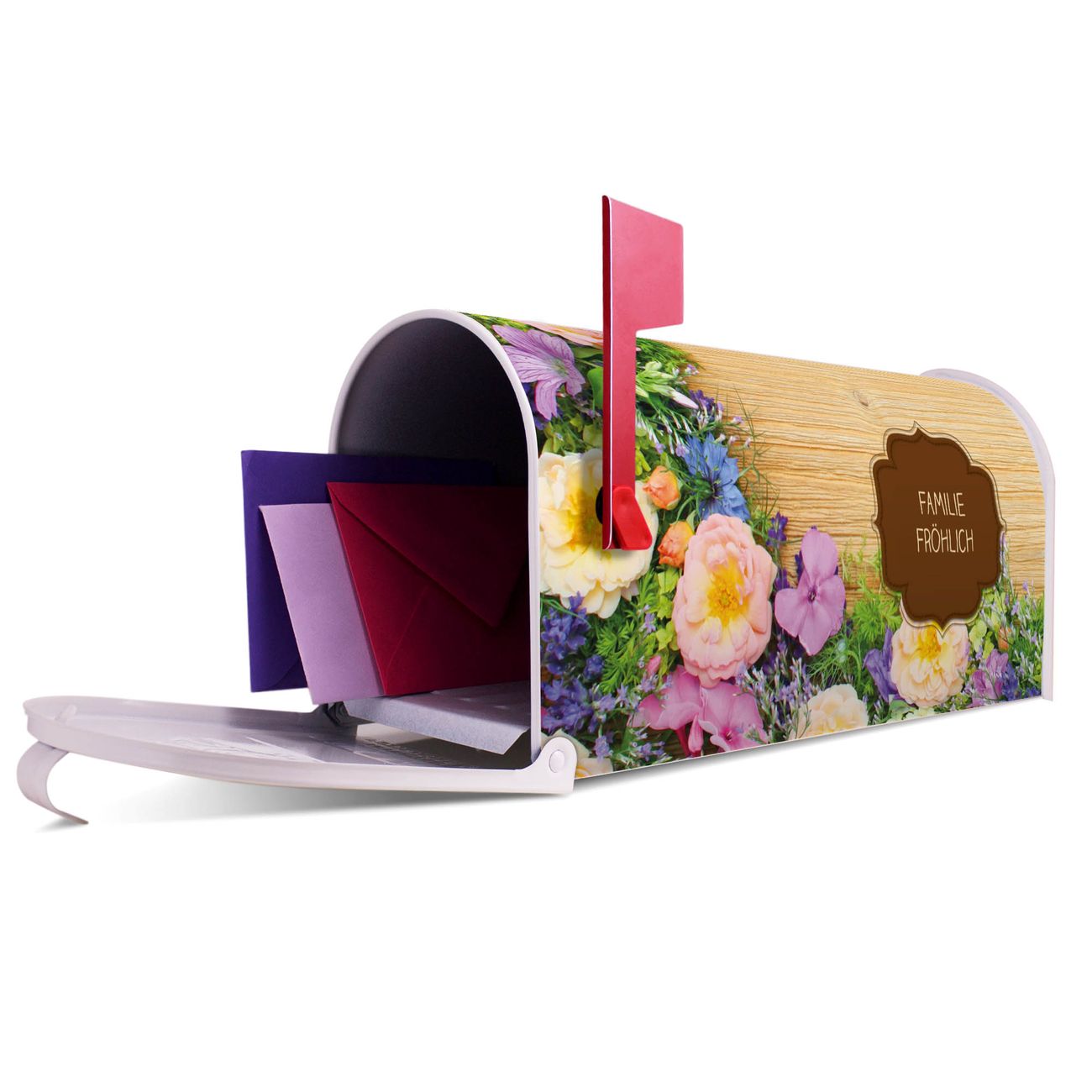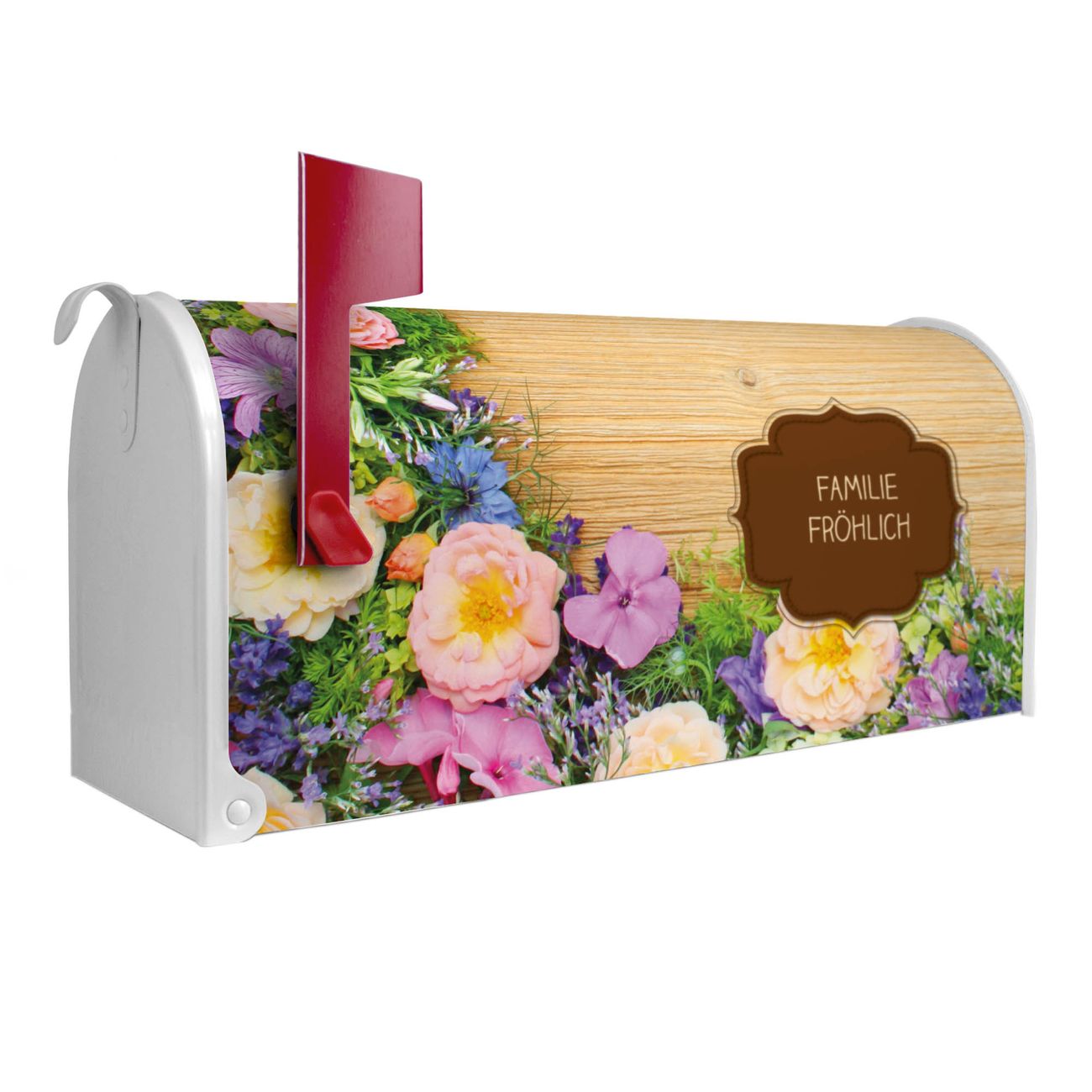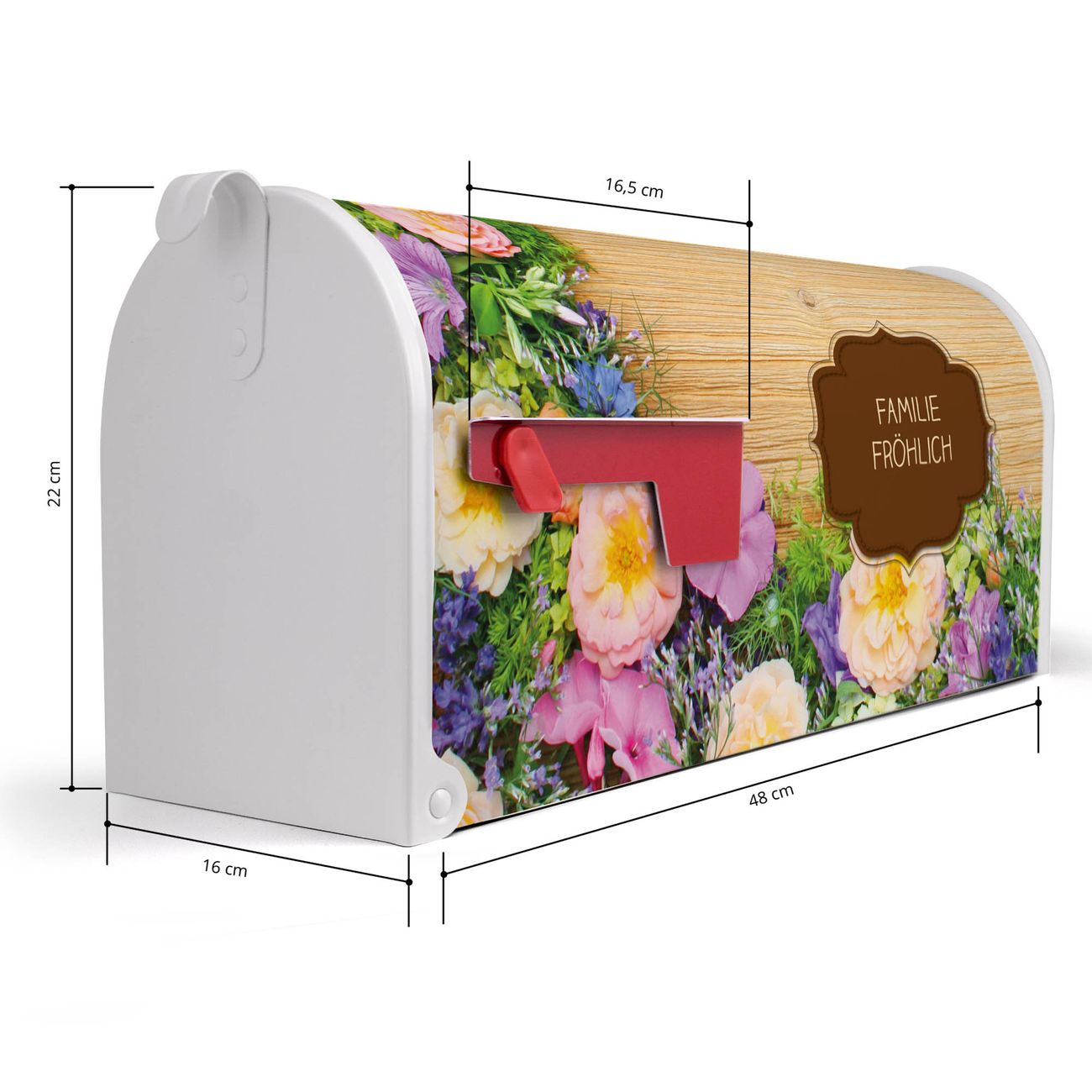 Der amerikanische Briefkasten von banjado mit WT Bouquet Motiv bietet Ihnen ausreichend Fassungsvermögen, um große A4 Sendungen und Zeitschriften zu empfangen. Die typisch amerikanische rote Fahne zeigt Ihnen an, wenn Sie Post erhalten haben. Die US-Mailbox besteht aus verzinktem Stahlblech welches lackiert wurde und ist 48 x 22 x 16 CM (BxHxT) groß. Die Folie mit Motiv WT Bouquet besteht aus einer wetter- und UV-resistenten Folie, die mit einem Schutzlaminat überzogen ist, sodass die US Mailbox zusätzlich vor Kratzern geschützt ist. An der Unterkante sind 4 Löcher je Seite um die Mailbox, typisch amerikanisch, an einem Holzpfahl oder einem Zaun zu befestigen. Auf Wunsch können Sie bei uns den passenden Standfuß oder die passende Wandhalterung kaufen um die US-Mailbox sicher zu befestigen. Wir bieten Ihnen ebenfalls Namensschilder, bereits beschriftet oder frei zu beschriften, und verschiedene selbst gestaltete Bitte-Keine-Werbung-Aufkleber.