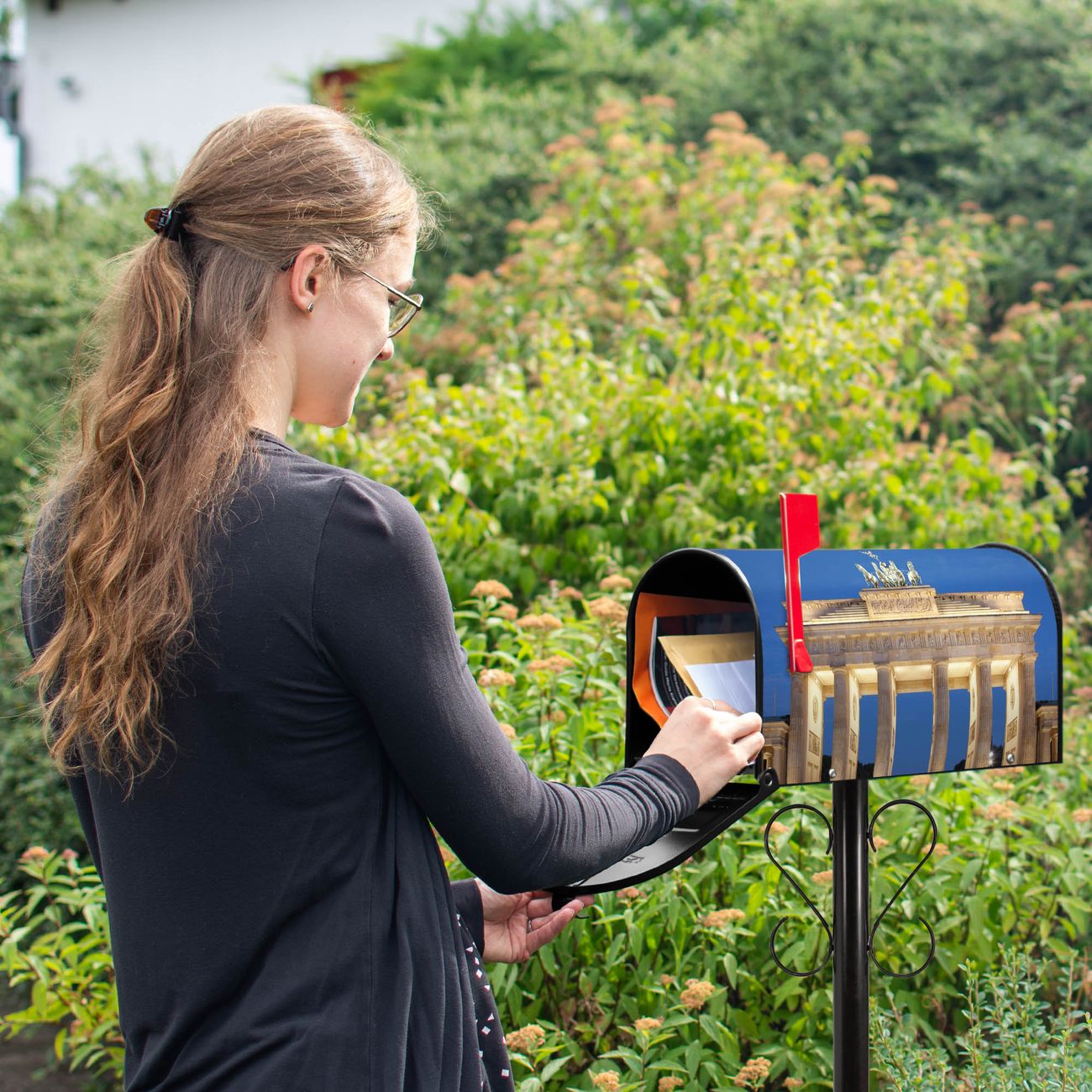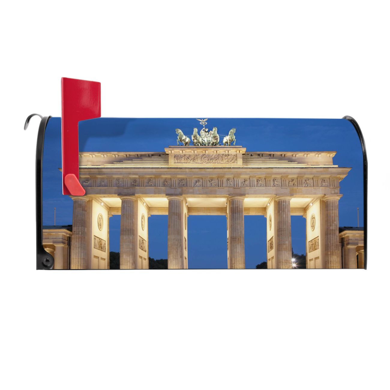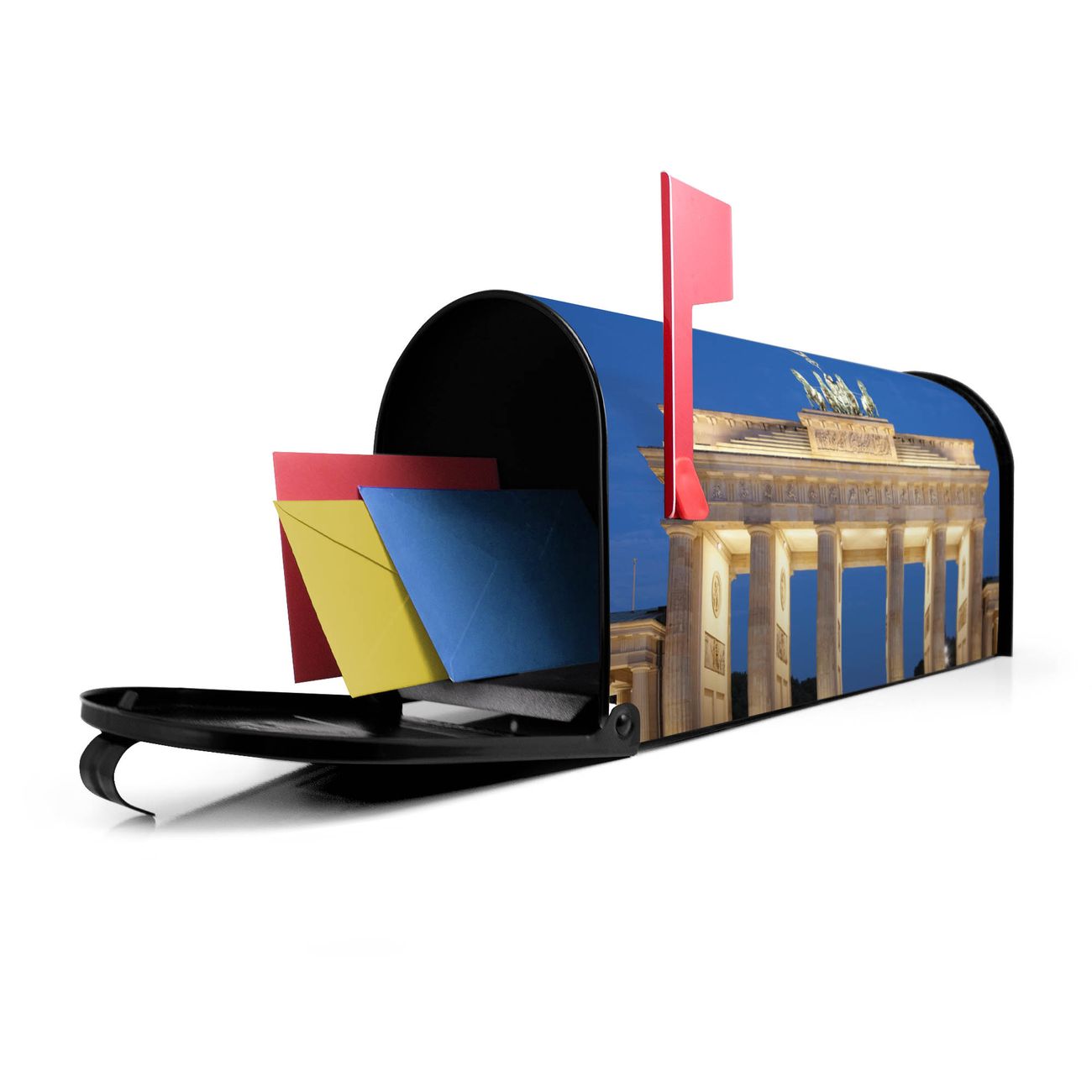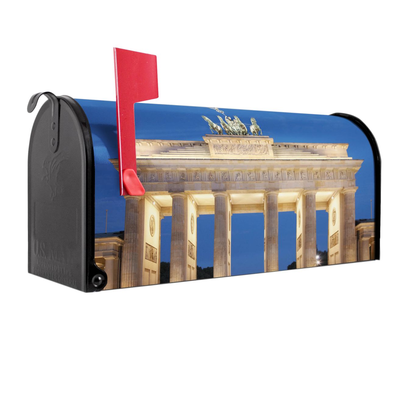 Der amerikanische Briefkasten von banjado mit Brandenburger Tor 2 Motiv bietet Ihnen ausreichend Fassungsvermögen, um große A4 Sendungen und Zeitschriften zu empfangen. Die typisch amerikanische rote Fahne zeigt Ihnen an, wenn Sie Post erhalten haben. Die US-Mailbox besteht aus verzinktem Stahlblech welches lackiert wurde und ist 48 x 22 x 16 CM (BxHxT) groß. Die Folie mit Motiv Brandenburger Tor 2 besteht aus einer wetter- und UV-resistenten Folie, die mit einem Schutzlaminat überzogen ist, sodass die US Mailbox zusätzlich vor Kratzern geschützt ist. An der Unterkante sind 4 Löcher je Seite um die Mailbox, typisch amerikanisch, an einem Holzpfahl oder einem Zaun zu befestigen. Auf Wunsch können Sie bei uns den passenden Standfuß oder die passende Wandhalterung kaufen um die US-Mailbox sicher zu befestigen. Wir bieten Ihnen ebenfalls Namensschilder, bereits beschriftet oder frei zu beschriften, und verschiedene selbst gestaltete Bitte-Keine-Werbung-Aufkleber.