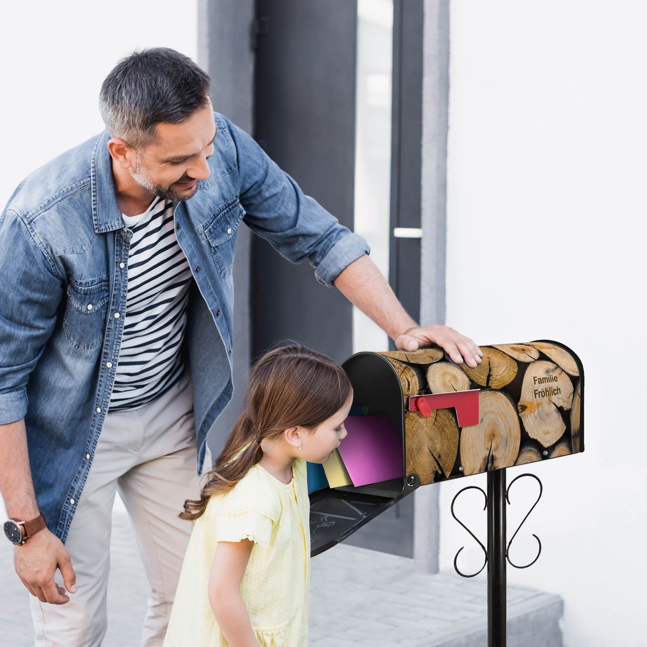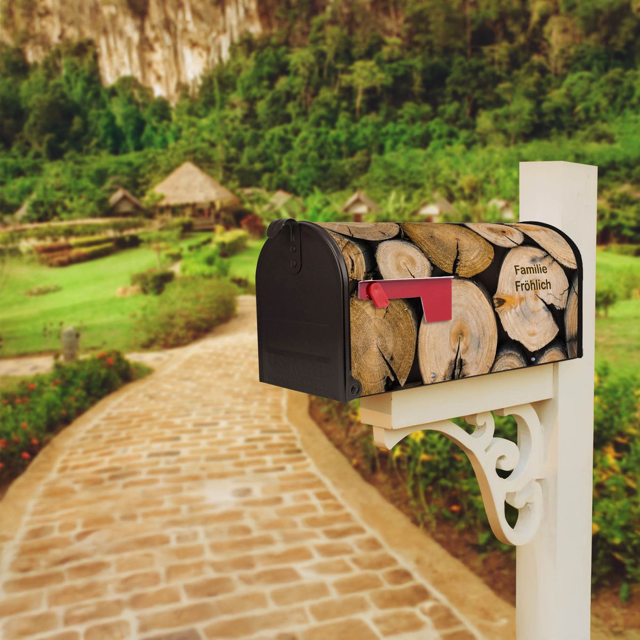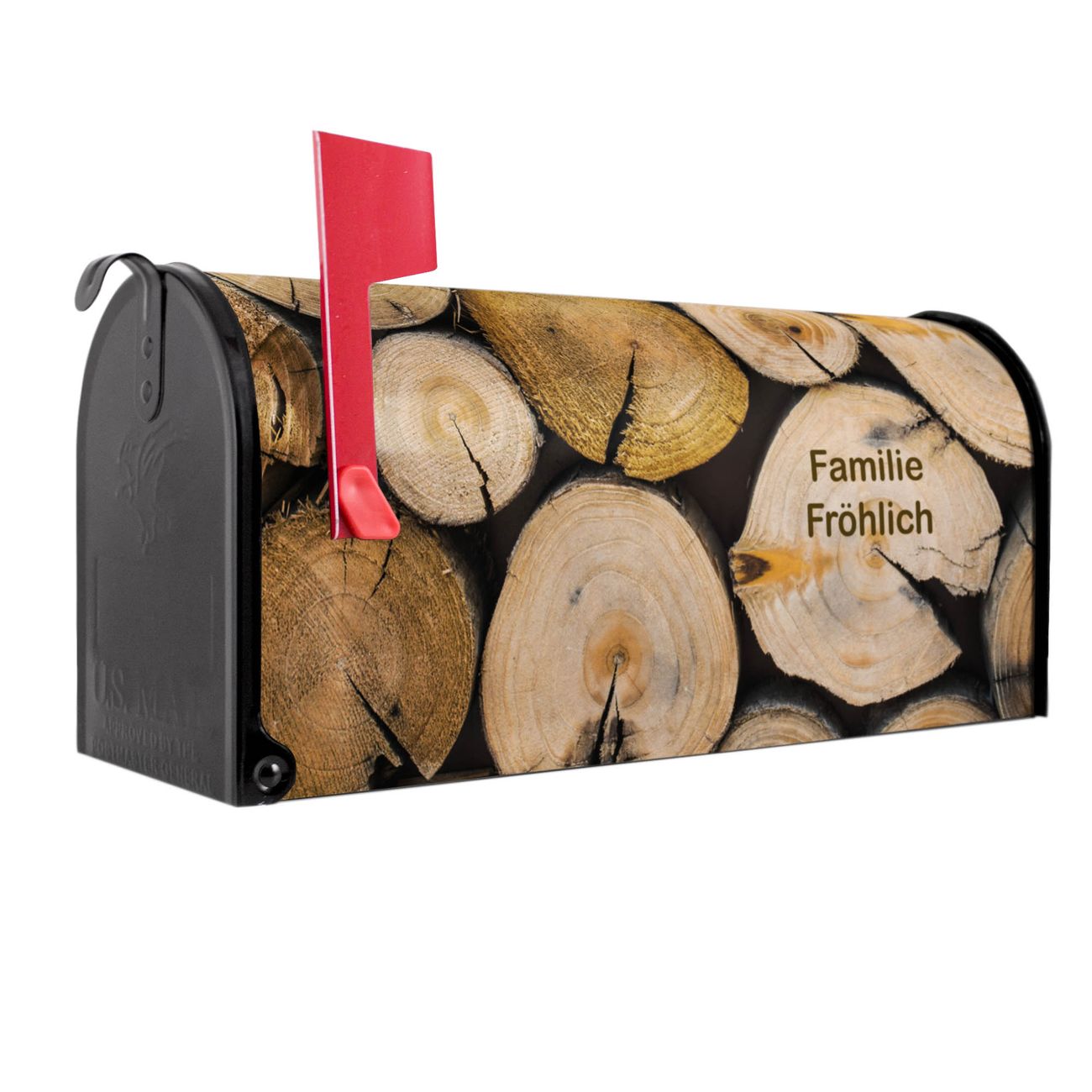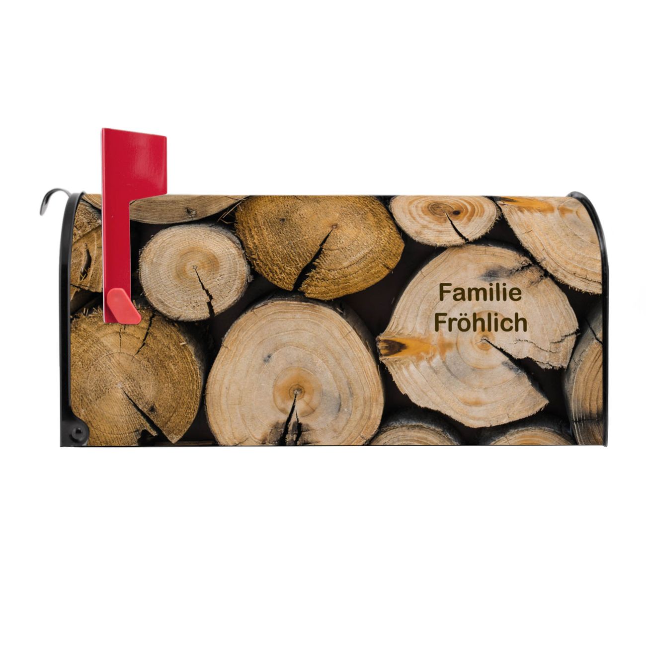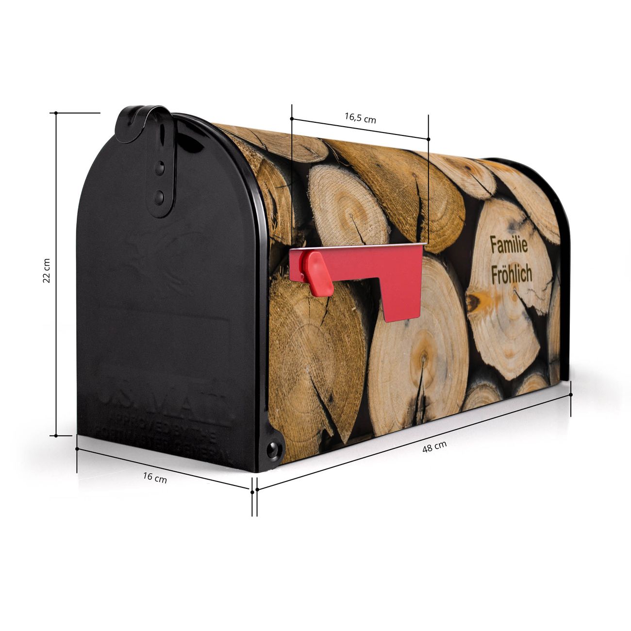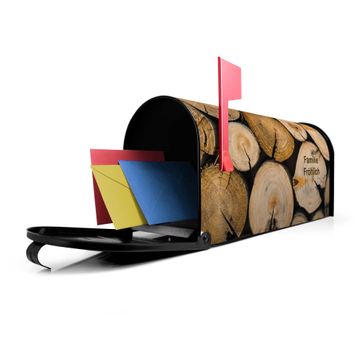 Der amerikanische Briefkasten von banjado mit Brennholz Motiv bietet Ihnen ausreichend Fassungsvermögen, um große A4 Sendungen und Zeitschriften zu empfangen. Die typisch amerikanische rote Fahne zeigt Ihnen an, wenn Sie Post erhalten haben. Die US-Mailbox besteht aus verzinktem Stahlblech welches lackiert wurde und ist 48 x 22 x 16 CM (BxHxT) groß. Die Folie mit Motiv Brennholz besteht aus einer wetter- und UV-resistenten Folie, die mit einem Schutzlaminat überzogen ist, sodass die US Mailbox zusätzlich vor Kratzern geschützt ist. An der Unterkante sind 4 Löcher je Seite um die Mailbox, typisch amerikanisch, an einem Holzpfahl oder einem Zaun zu befestigen. Auf Wunsch können Sie bei uns den passenden Standfuß oder die passende Wandhalterung kaufen um die US-Mailbox sicher zu befestigen. Wir bieten Ihnen ebenfalls Namensschilder, bereits beschriftet oder frei zu beschriften, und verschiedene selbst gestaltete Bitte-Keine-Werbung-Aufkleber.
