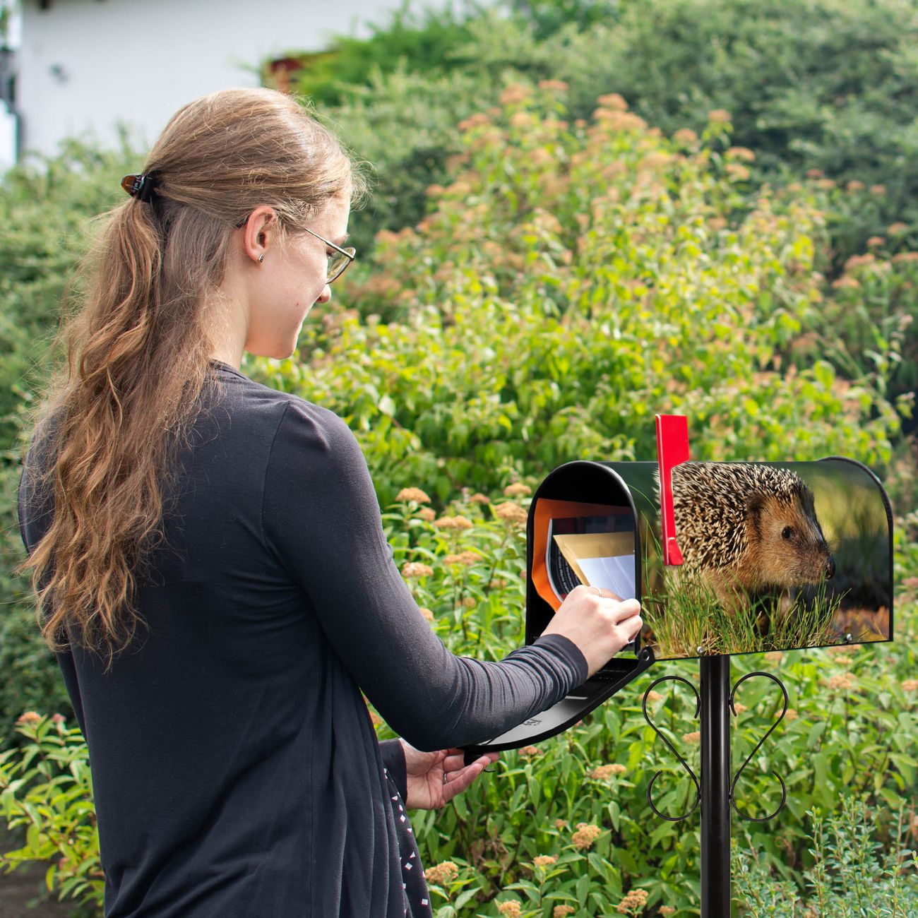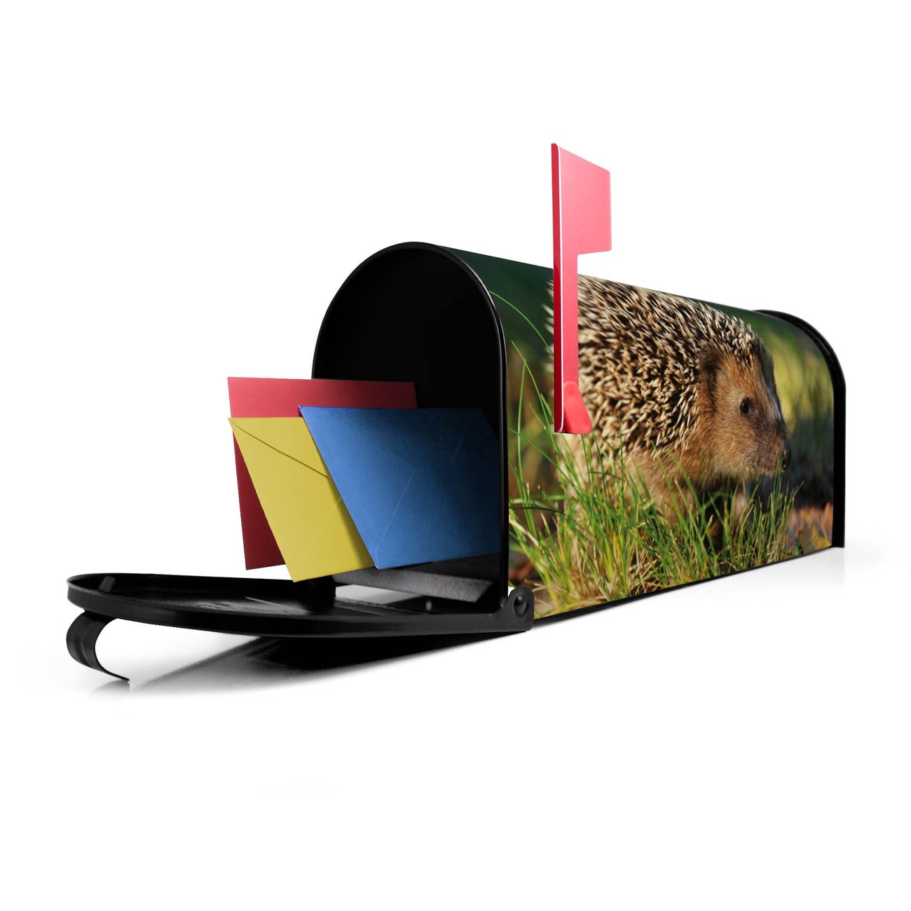 Der amerikanische Briefkasten von banjado mit Bruno Motiv bietet Ihnen ausreichend Fassungsvermögen, um große A4 Sendungen und Zeitschriften zu empfangen. Die typisch amerikanische rote Fahne zeigt Ihnen an, wenn Sie Post erhalten haben. Die US-Mailbox besteht aus verzinktem Stahlblech welches lackiert wurde und ist 48 x 22 x 16 CM (BxHxT) groß. Die Folie mit Motiv Bruno besteht aus einer wetter- und UV-resistenten Folie, die mit einem Schutzlaminat überzogen ist, sodass die US Mailbox zusätzlich vor Kratzern geschützt ist. An der Unterkante sind 4 Löcher je Seite um die Mailbox, typisch amerikanisch, an einem Holzpfahl oder einem Zaun zu befestigen. Auf Wunsch können Sie bei uns den passenden Standfuß oder die passende Wandhalterung kaufen um die US-Mailbox sicher zu befestigen. Wir bieten Ihnen ebenfalls Namensschilder, bereits beschriftet oder frei zu beschriften, und verschiedene selbst gestaltete Bitte-Keine-Werbung-Aufkleber.