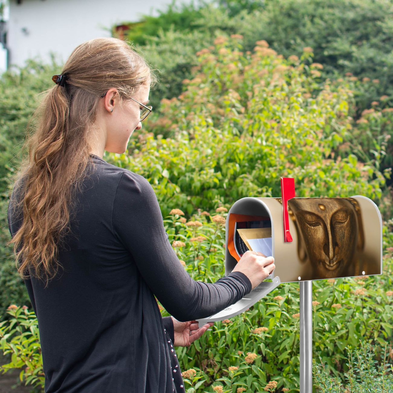 Der amerikanische Briefkasten von banjado mit Buddha Gold Motiv bietet Ihnen ausreichend Fassungsvermögen, um große A4 Sendungen und Zeitschriften zu empfangen. Die typisch amerikanische rote Fahne zeigt Ihnen an, wenn Sie Post erhalten haben. Die US-Mailbox besteht aus verzinktem Stahlblech welches lackiert wurde und ist 48 x 22 x 16 CM (BxHxT) groß. Die Folie mit Motiv Buddha Gold besteht aus einer wetter- und UV-resistenten Folie, die mit einem Schutzlaminat überzogen ist, sodass die US Mailbox zusätzlich vor Kratzern geschützt ist. An der Unterkante sind 4 Löcher je Seite um die Mailbox, typisch amerikanisch, an einem Holzpfahl oder einem Zaun zu befestigen. Auf Wunsch können Sie bei uns den passenden Standfuß oder die passende Wandhalterung kaufen um die US-Mailbox sicher zu befestigen. Wir bieten Ihnen ebenfalls Namensschilder, bereits beschriftet oder frei zu beschriften, und verschiedene selbst gestaltete Bitte-Keine-Werbung-Aufkleber.