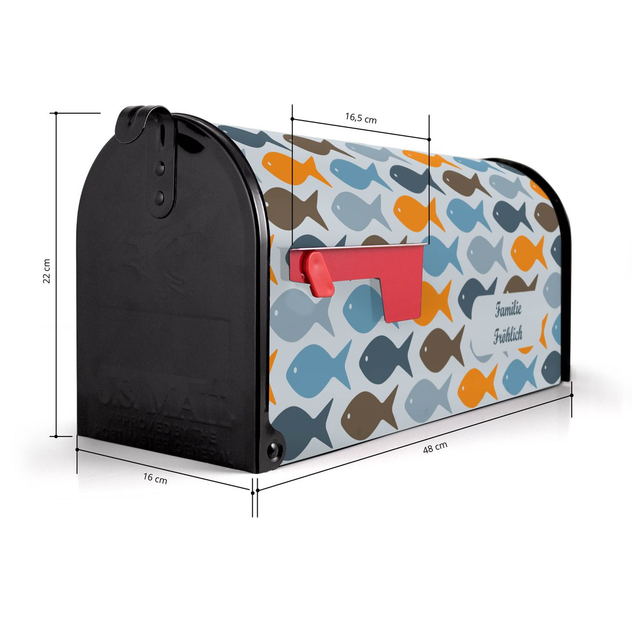 Der amerikanische Briefkasten von banjado mit Bunte Fische Motiv bietet Ihnen ausreichend Fassungsvermögen, um große A4 Sendungen und Zeitschriften zu empfangen. Die typisch amerikanische rote Fahne zeigt Ihnen an, wenn Sie Post erhalten haben. Die US-Mailbox besteht aus verzinktem Stahlblech welches lackiert wurde und ist 48 x 22 x 16 CM (BxHxT) groß. Die Folie mit Motiv Bunte Fische besteht aus einer wetter- und UV-resistenten Folie, die mit einem Schutzlaminat überzogen ist, sodass die US Mailbox zusätzlich vor Kratzern geschützt ist. An der Unterkante sind 4 Löcher je Seite um die Mailbox, typisch amerikanisch, an einem Holzpfahl oder einem Zaun zu befestigen. Auf Wunsch können Sie bei uns den passenden Standfuß oder die passende Wandhalterung kaufen um die US-Mailbox sicher zu befestigen. Wir bieten Ihnen ebenfalls Namensschilder, bereits beschriftet oder frei zu beschriften, und verschiedene selbst gestaltete Bitte-Keine-Werbung-Aufkleber.