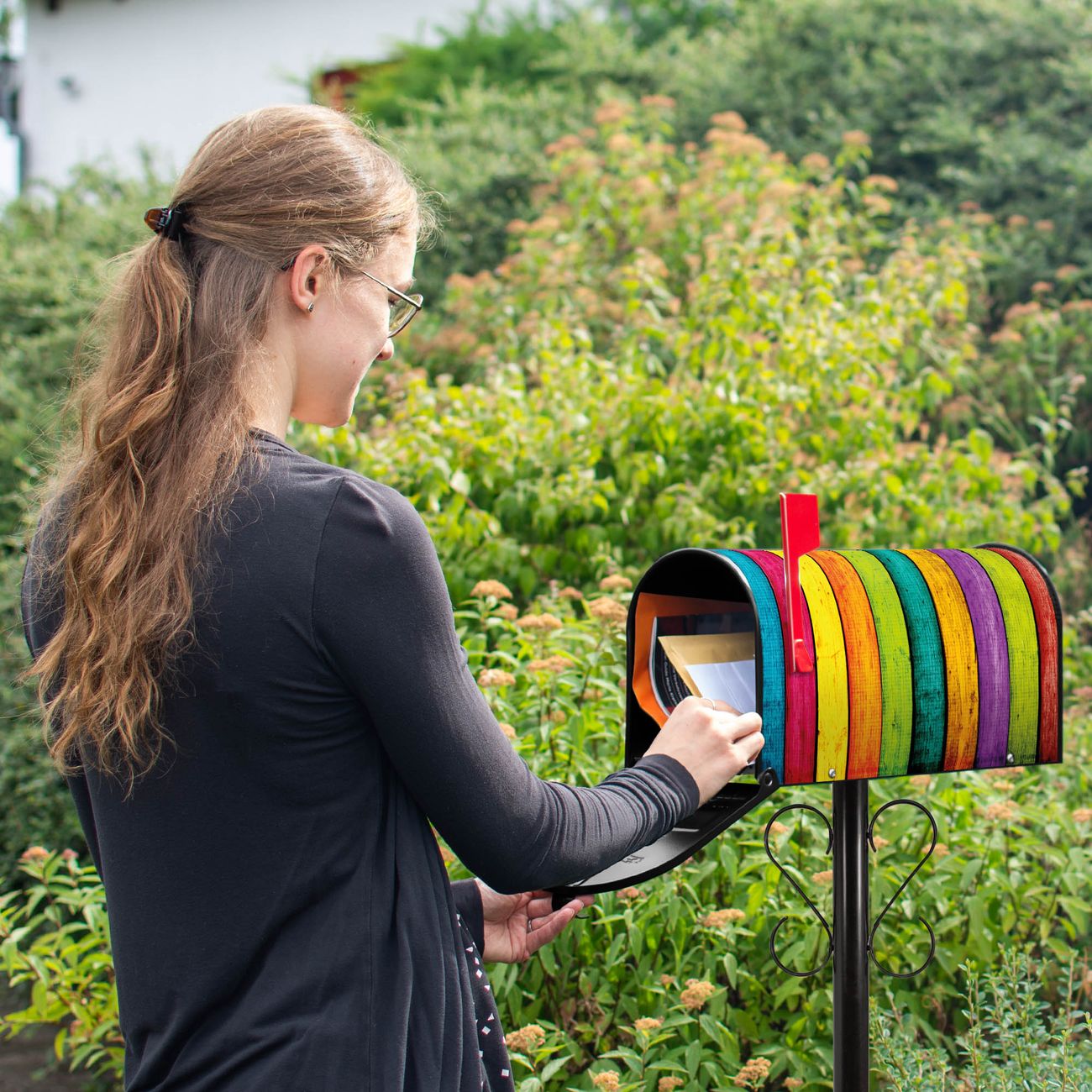 Unser amerikanischer Briefkasten mit dem Motiv Bunte Holzlatten hat ein sehr ansprechendes und ausgefallenes Design, ist in der Grundfarbe weiß, grün oder schwarz erhältlich. Damit entlocken Sie Ihren Nachbarn und dem Postboten immer wieder ein Lächeln. Die Mailbox ist ein Original Import aus Mississippi USA und wird von unserer kleinen Manufaktur in Sachsen von Hand veredelt. Die US-Mailbox bietet ausreichend Platz auch für große Sendungen, eine Fahne die Ihnen Post anzeigt, wetterfestes und äußerst stabiles Material - so macht Post empfangen Freude.