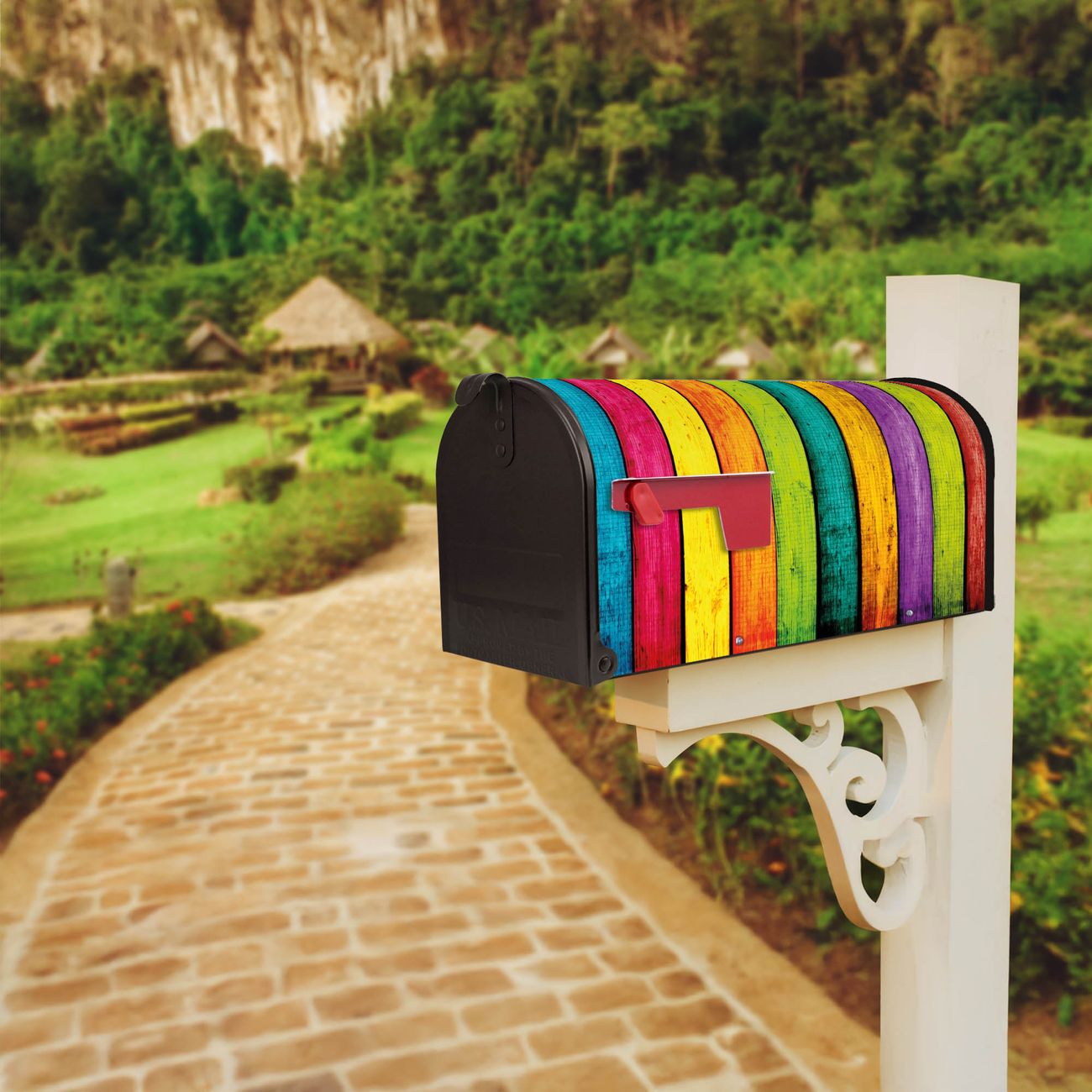 Der amerikanische Briefkasten von banjado mit Bunte Holzlatten Motiv bietet Ihnen ausreichend Fassungsvermögen, um große A4 Sendungen und Zeitschriften zu empfangen. Die typisch amerikanische rote Fahne zeigt Ihnen an, wenn Sie Post erhalten haben. Die US-Mailbox besteht aus verzinktem Stahlblech welches lackiert wurde und ist 48 x 22 x 16 CM (BxHxT) groß. Die Folie mit Motiv Bunte Holzlatten besteht aus einer wetter- und UV-resistenten Folie, die mit einem Schutzlaminat überzogen ist, sodass die US Mailbox zusätzlich vor Kratzern geschützt ist. An der Unterkante sind 4 Löcher je Seite um die Mailbox, typisch amerikanisch, an einem Holzpfahl oder einem Zaun zu befestigen. Auf Wunsch können Sie bei uns den passenden Standfuß oder die passende Wandhalterung kaufen um die US-Mailbox sicher zu befestigen. Wir bieten Ihnen ebenfalls Namensschilder, bereits beschriftet oder frei zu beschriften, und verschiedene selbst gestaltete Bitte-Keine-Werbung-Aufkleber.