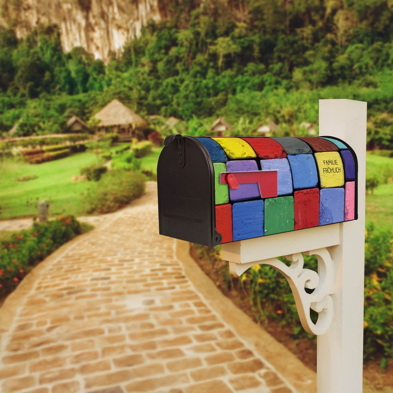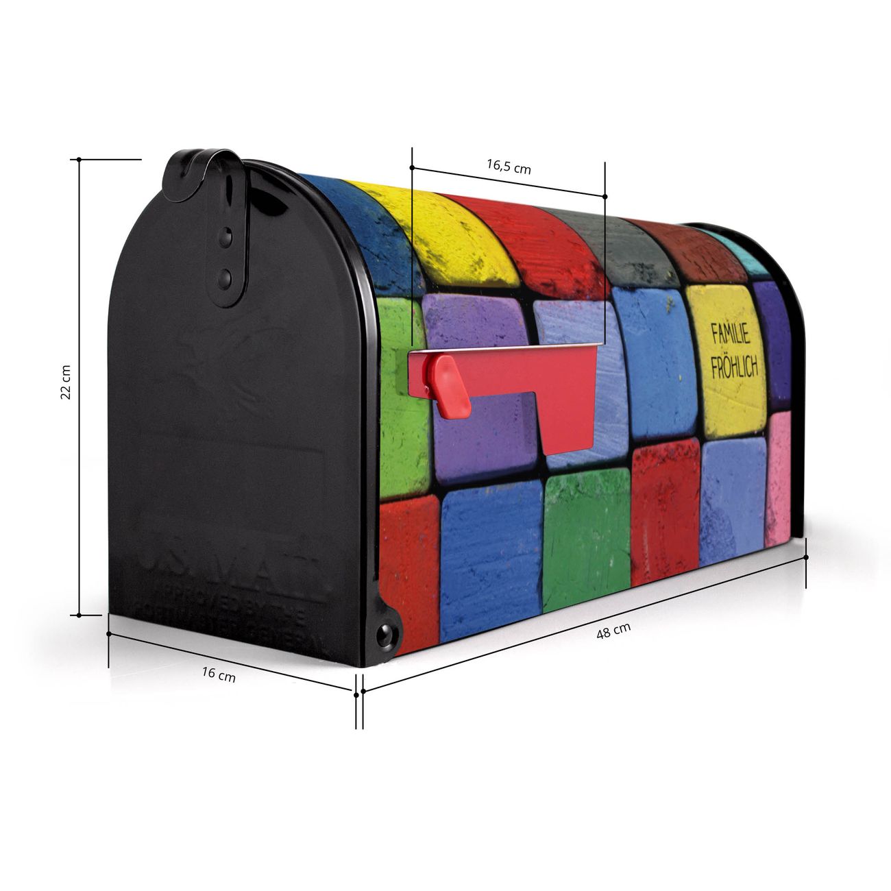 Der amerikanische Briefkasten von banjado mit Bunte Kreide Motiv bietet Ihnen ausreichend Fassungsvermögen, um große A4 Sendungen und Zeitschriften zu empfangen. Die typisch amerikanische rote Fahne zeigt Ihnen an, wenn Sie Post erhalten haben. Die US-Mailbox besteht aus verzinktem Stahlblech welches lackiert wurde und ist 48 x 22 x 16 CM (BxHxT) groß. Die Folie mit Motiv Bunte Kreide besteht aus einer wetter- und UV-resistenten Folie, die mit einem Schutzlaminat überzogen ist, sodass die US Mailbox zusätzlich vor Kratzern geschützt ist. An der Unterkante sind 4 Löcher je Seite um die Mailbox, typisch amerikanisch, an einem Holzpfahl oder einem Zaun zu befestigen. Auf Wunsch können Sie bei uns den passenden Standfuß oder die passende Wandhalterung kaufen um die US-Mailbox sicher zu befestigen. Wir bieten Ihnen ebenfalls Namensschilder, bereits beschriftet oder frei zu beschriften, und verschiedene selbst gestaltete Bitte-Keine-Werbung-Aufkleber.