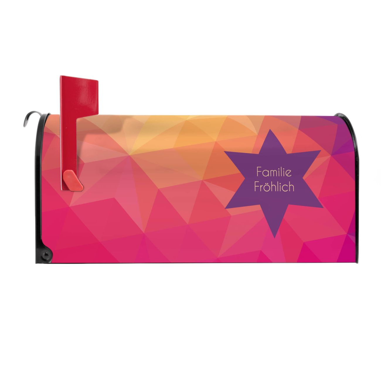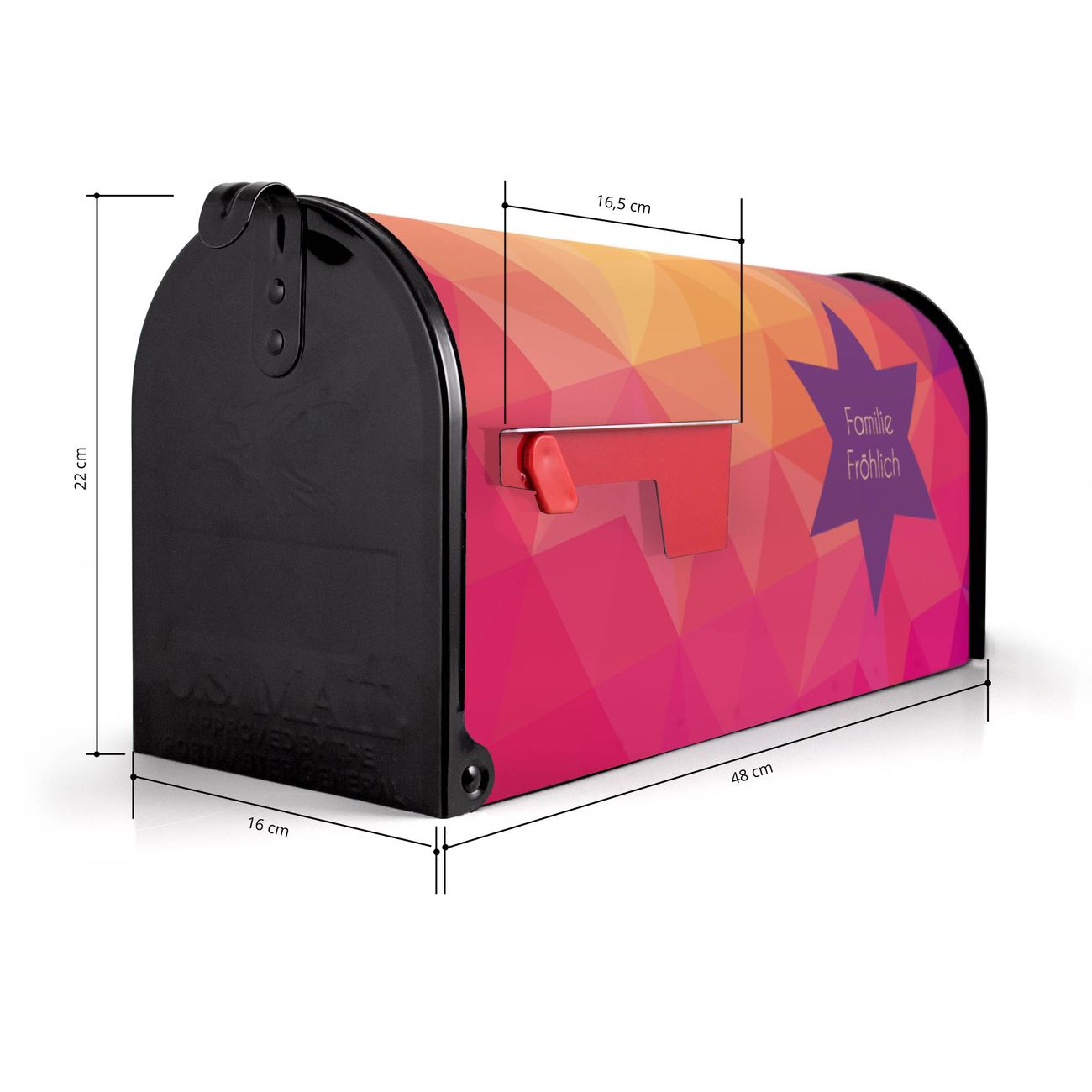 Der amerikanische Briefkasten von banjado mit Bunte Kristalle Motiv bietet Ihnen ausreichend Fassungsvermögen, um große A4 Sendungen und Zeitschriften zu empfangen. Die typisch amerikanische rote Fahne zeigt Ihnen an, wenn Sie Post erhalten haben. Die US-Mailbox besteht aus verzinktem Stahlblech welches lackiert wurde und ist 48 x 22 x 16 CM (BxHxT) groß. Die Folie mit Motiv Bunte Kristalle besteht aus einer wetter- und UV-resistenten Folie, die mit einem Schutzlaminat überzogen ist, sodass die US Mailbox zusätzlich vor Kratzern geschützt ist. An der Unterkante sind 4 Löcher je Seite um die Mailbox, typisch amerikanisch, an einem Holzpfahl oder einem Zaun zu befestigen. Auf Wunsch können Sie bei uns den passenden Standfuß oder die passende Wandhalterung kaufen um die US-Mailbox sicher zu befestigen. Wir bieten Ihnen ebenfalls Namensschilder, bereits beschriftet oder frei zu beschriften, und verschiedene selbst gestaltete Bitte-Keine-Werbung-Aufkleber.