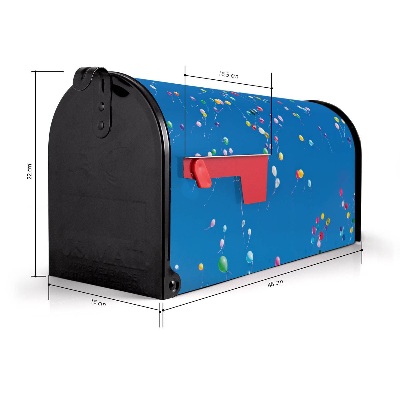 Der amerikanische Briefkasten von banjado mit Bunte Luftballons Motiv bietet Ihnen ausreichend Fassungsvermögen, um große A4 Sendungen und Zeitschriften zu empfangen. Die typisch amerikanische rote Fahne zeigt Ihnen an, wenn Sie Post erhalten haben. Die US-Mailbox besteht aus verzinktem Stahlblech welches lackiert wurde und ist 48 x 22 x 16 CM (BxHxT) groß. Die Folie mit Motiv Bunte Luftballons besteht aus einer wetter- und UV-resistenten Folie, die mit einem Schutzlaminat überzogen ist, sodass die US Mailbox zusätzlich vor Kratzern geschützt ist. An der Unterkante sind 4 Löcher je Seite um die Mailbox, typisch amerikanisch, an einem Holzpfahl oder einem Zaun zu befestigen. Auf Wunsch können Sie bei uns den passenden Standfuß oder die passende Wandhalterung kaufen um die US-Mailbox sicher zu befestigen. Wir bieten Ihnen ebenfalls Namensschilder, bereits beschriftet oder frei zu beschriften, und verschiedene selbst gestaltete Bitte-Keine-Werbung-Aufkleber.