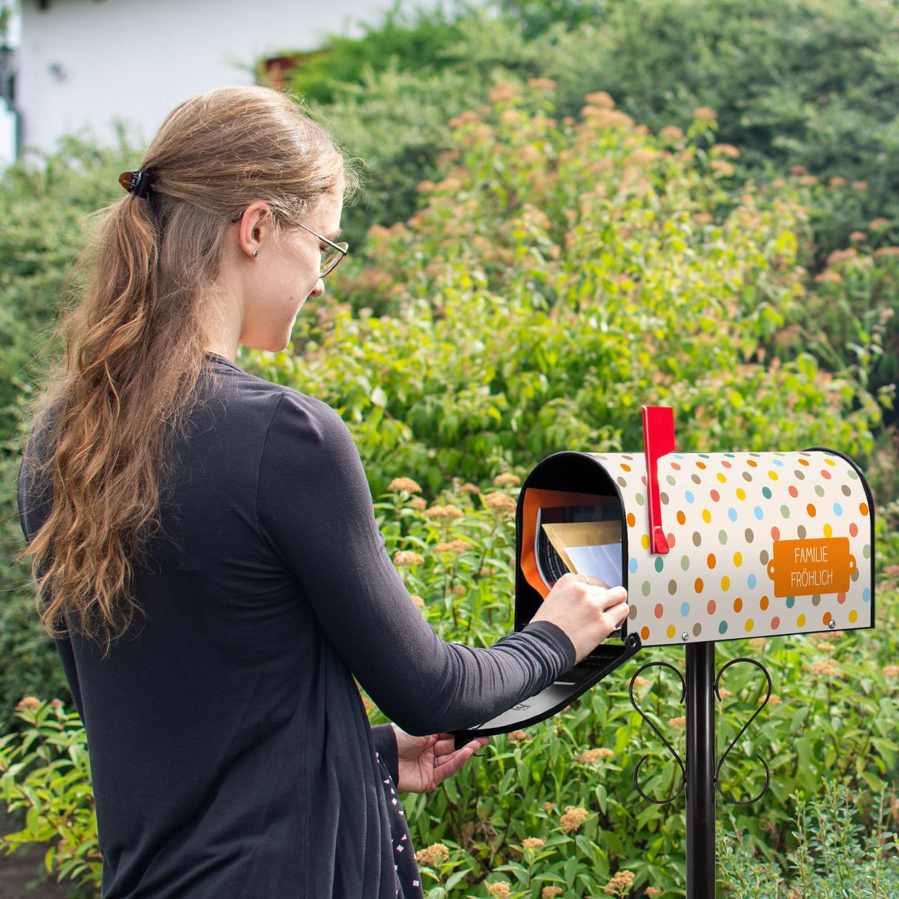 Unser amerikanischer Briefkasten mit dem Motiv Bunte Punkte hat ein sehr ansprechendes und ausgefallenes Design, ist in der Grundfarbe weiß, grün oder schwarz erhältlich. Damit entlocken Sie Ihren Nachbarn und dem Postboten immer wieder ein Lächeln. Die Mailbox ist ein Original Import aus Mississippi USA und wird von unserer kleinen Manufaktur in Sachsen von Hand veredelt. Die US-Mailbox bietet ausreichend Platz auch für große Sendungen, eine Fahne die Ihnen Post anzeigt, wetterfestes und äußerst stabiles Material - so macht Post empfangen Freude.