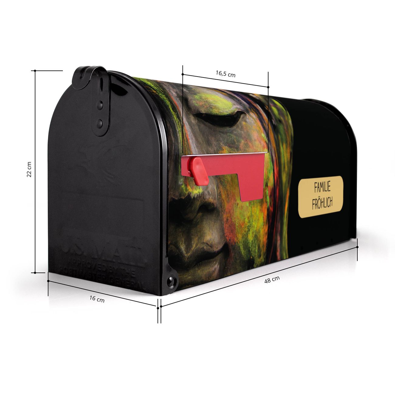 Der amerikanische Briefkasten von banjado mit Bunter Buddha Motiv bietet Ihnen ausreichend Fassungsvermögen, um große A4 Sendungen und Zeitschriften zu empfangen. Die typisch amerikanische rote Fahne zeigt Ihnen an, wenn Sie Post erhalten haben. Die US-Mailbox besteht aus verzinktem Stahlblech welches lackiert wurde und ist 48 x 22 x 16 CM (BxHxT) groß. Die Folie mit Motiv Bunter Buddha besteht aus einer wetter- und UV-resistenten Folie, die mit einem Schutzlaminat überzogen ist, sodass die US Mailbox zusätzlich vor Kratzern geschützt ist. An der Unterkante sind 4 Löcher je Seite um die Mailbox, typisch amerikanisch, an einem Holzpfahl oder einem Zaun zu befestigen. Auf Wunsch können Sie bei uns den passenden Standfuß oder die passende Wandhalterung kaufen um die US-Mailbox sicher zu befestigen. Wir bieten Ihnen ebenfalls Namensschilder, bereits beschriftet oder frei zu beschriften, und verschiedene selbst gestaltete Bitte-Keine-Werbung-Aufkleber.