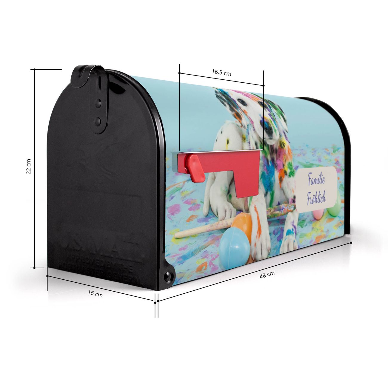 Der amerikanische Briefkasten von banjado mit Bunter Dalmatiner Motiv bietet Ihnen ausreichend Fassungsvermögen, um große A4 Sendungen und Zeitschriften zu empfangen. Die typisch amerikanische rote Fahne zeigt Ihnen an, wenn Sie Post erhalten haben. Die US-Mailbox besteht aus verzinktem Stahlblech welches lackiert wurde und ist 48 x 22 x 16 CM (BxHxT) groß. Die Folie mit Motiv Bunter Dalmatiner besteht aus einer wetter- und UV-resistenten Folie, die mit einem Schutzlaminat überzogen ist, sodass die US Mailbox zusätzlich vor Kratzern geschützt ist. An der Unterkante sind 4 Löcher je Seite um die Mailbox, typisch amerikanisch, an einem Holzpfahl oder einem Zaun zu befestigen. Auf Wunsch können Sie bei uns den passenden Standfuß oder die passende Wandhalterung kaufen um die US-Mailbox sicher zu befestigen. Wir bieten Ihnen ebenfalls Namensschilder, bereits beschriftet oder frei zu beschriften, und verschiedene selbst gestaltete Bitte-Keine-Werbung-Aufkleber.