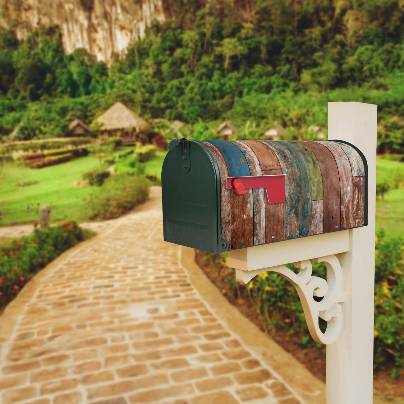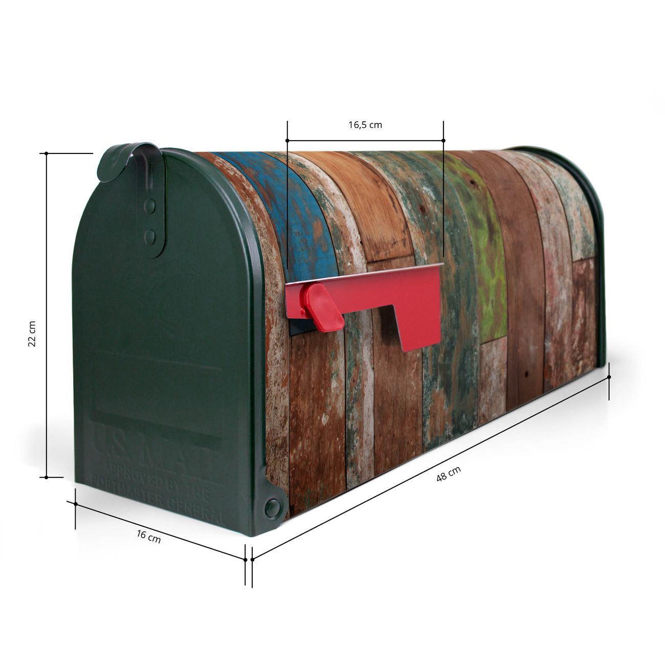 Der amerikanische Briefkasten von banjado mit Buntes Holz Motiv bietet Ihnen ausreichend Fassungsvermögen, um große A4 Sendungen und Zeitschriften zu empfangen. Die typisch amerikanische rote Fahne zeigt Ihnen an, wenn Sie Post erhalten haben. Die US-Mailbox besteht aus verzinktem Stahlblech welches lackiert wurde und ist 48 x 22 x 16 CM (BxHxT) groß. Die Folie mit Motiv Buntes Holz besteht aus einer wetter- und UV-resistenten Folie, die mit einem Schutzlaminat überzogen ist, sodass die US Mailbox zusätzlich vor Kratzern geschützt ist. An der Unterkante sind 4 Löcher je Seite um die Mailbox, typisch amerikanisch, an einem Holzpfahl oder einem Zaun zu befestigen. Auf Wunsch können Sie bei uns den passenden Standfuß oder die passende Wandhalterung kaufen um die US-Mailbox sicher zu befestigen. Wir bieten Ihnen ebenfalls Namensschilder, bereits beschriftet oder frei zu beschriften, und verschiedene selbst gestaltete Bitte-Keine-Werbung-Aufkleber.