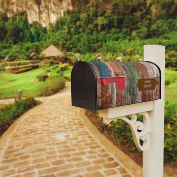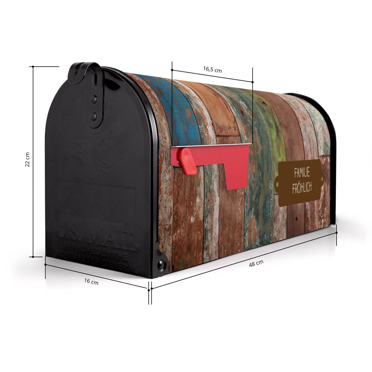 Der amerikanische Briefkasten von banjado mit Buntes Holz Motiv bietet Ihnen ausreichend Fassungsvermögen, um große A4 Sendungen und Zeitschriften zu empfangen. Die typisch amerikanische rote Fahne zeigt Ihnen an, wenn Sie Post erhalten haben. Die US-Mailbox besteht aus verzinktem Stahlblech welches lackiert wurde und ist 48 x 22 x 16 CM (BxHxT) groß. Die Folie mit Motiv Buntes Holz besteht aus einer wetter- und UV-resistenten Folie, die mit einem Schutzlaminat überzogen ist, sodass die US Mailbox zusätzlich vor Kratzern geschützt ist. An der Unterkante sind 4 Löcher je Seite um die Mailbox, typisch amerikanisch, an einem Holzpfahl oder einem Zaun zu befestigen. Auf Wunsch können Sie bei uns den passenden Standfuß oder die passende Wandhalterung kaufen um die US-Mailbox sicher zu befestigen. Wir bieten Ihnen ebenfalls Namensschilder, bereits beschriftet oder frei zu beschriften, und verschiedene selbst gestaltete Bitte-Keine-Werbung-Aufkleber.