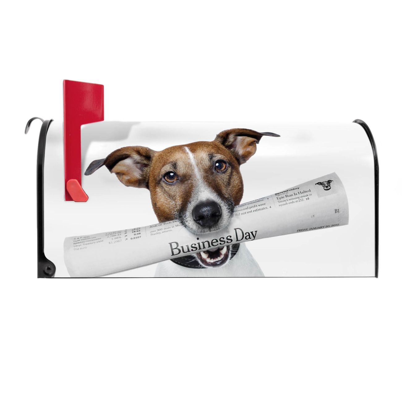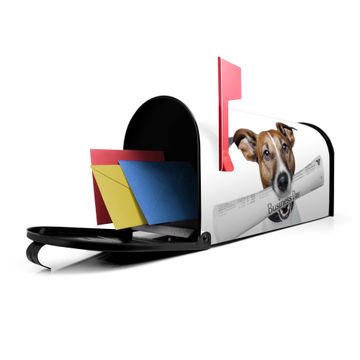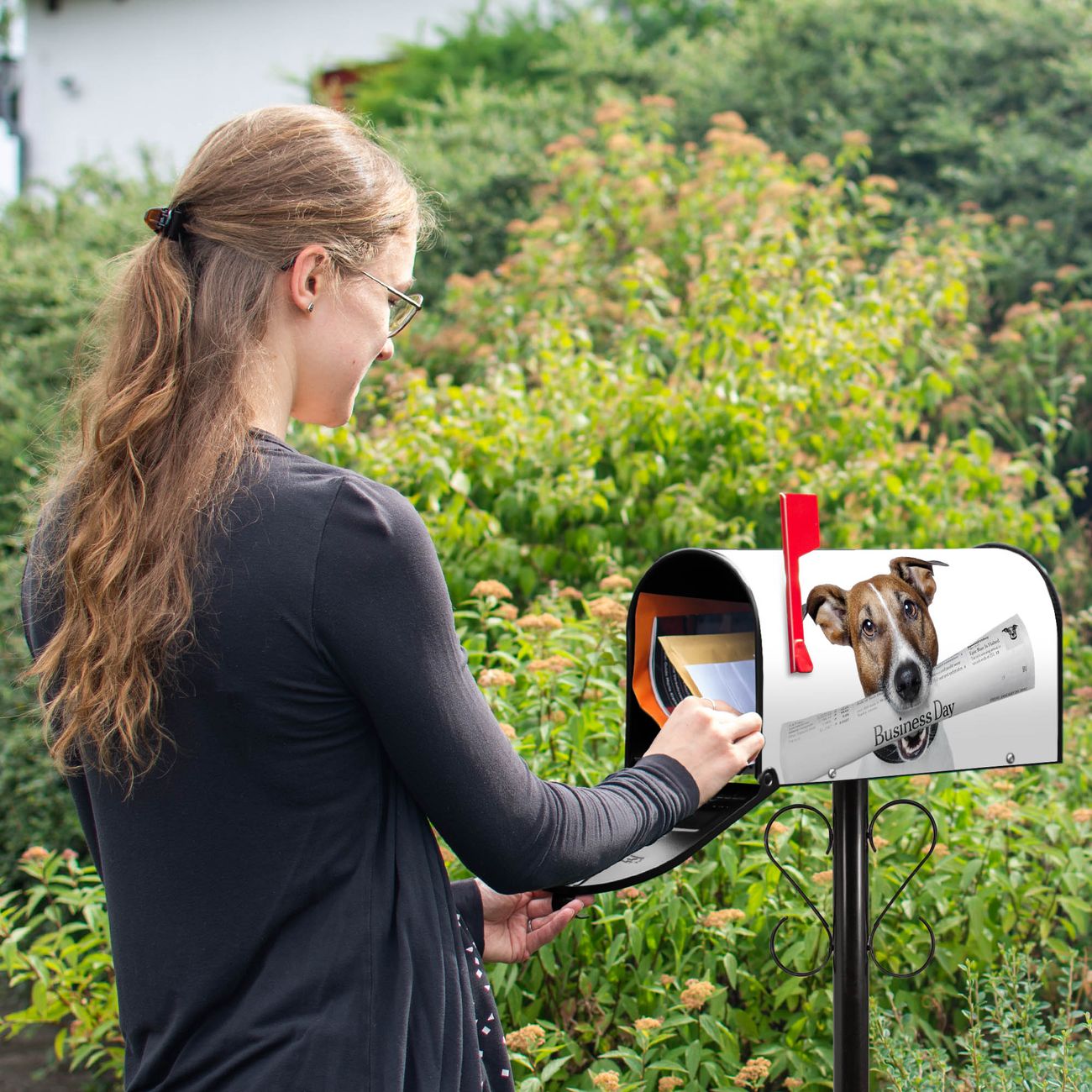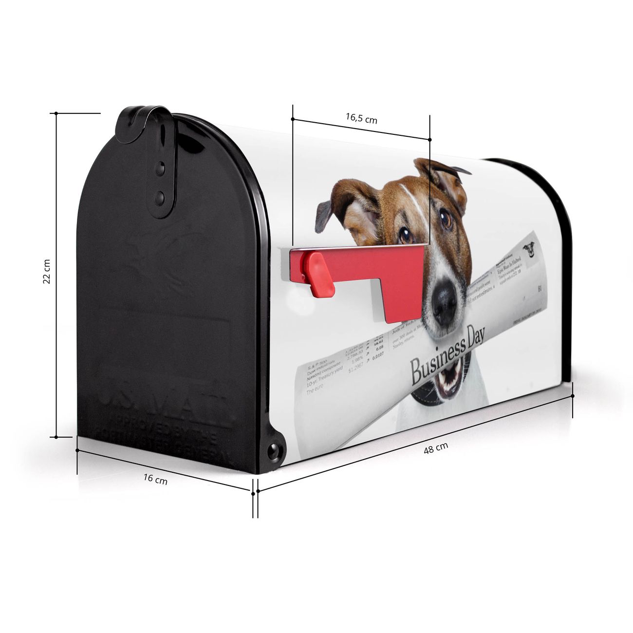 Der amerikanische Briefkasten von banjado mit Business Day Motiv bietet Ihnen ausreichend Fassungsvermögen, um große A4 Sendungen und Zeitschriften zu empfangen. Die typisch amerikanische rote Fahne zeigt Ihnen an, wenn Sie Post erhalten haben. Die US-Mailbox besteht aus verzinktem Stahlblech welches lackiert wurde und ist 48 x 22 x 16 CM (BxHxT) groß. Die Folie mit Motiv Business Day besteht aus einer wetter- und UV-resistenten Folie, die mit einem Schutzlaminat überzogen ist, sodass die US Mailbox zusätzlich vor Kratzern geschützt ist. An der Unterkante sind 4 Löcher je Seite um die Mailbox, typisch amerikanisch, an einem Holzpfahl oder einem Zaun zu befestigen. Auf Wunsch können Sie bei uns den passenden Standfuß oder die passende Wandhalterung kaufen um die US-Mailbox sicher zu befestigen. Wir bieten Ihnen ebenfalls Namensschilder, bereits beschriftet oder frei zu beschriften, und verschiedene selbst gestaltete Bitte-Keine-Werbung-Aufkleber.