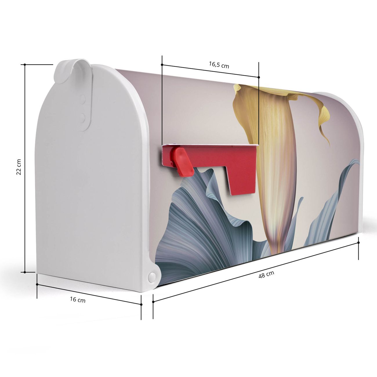 Der amerikanische Briefkasten von banjado mit Calla Motiv bietet Ihnen ausreichend Fassungsvermögen, um große A4 Sendungen und Zeitschriften zu empfangen. Die typisch amerikanische rote Fahne zeigt Ihnen an, wenn Sie Post erhalten haben. Die US-Mailbox besteht aus verzinktem Stahlblech welches lackiert wurde und ist 48 x 22 x 16 CM (BxHxT) groß. Die Folie mit Motiv Calla besteht aus einer wetter- und UV-resistenten Folie, die mit einem Schutzlaminat überzogen ist, sodass die US Mailbox zusätzlich vor Kratzern geschützt ist. An der Unterkante sind 4 Löcher je Seite um die Mailbox, typisch amerikanisch, an einem Holzpfahl oder einem Zaun zu befestigen. Auf Wunsch können Sie bei uns den passenden Standfuß oder die passende Wandhalterung kaufen um die US-Mailbox sicher zu befestigen. Wir bieten Ihnen ebenfalls Namensschilder, bereits beschriftet oder frei zu beschriften, und verschiedene selbst gestaltete Bitte-Keine-Werbung-Aufkleber.