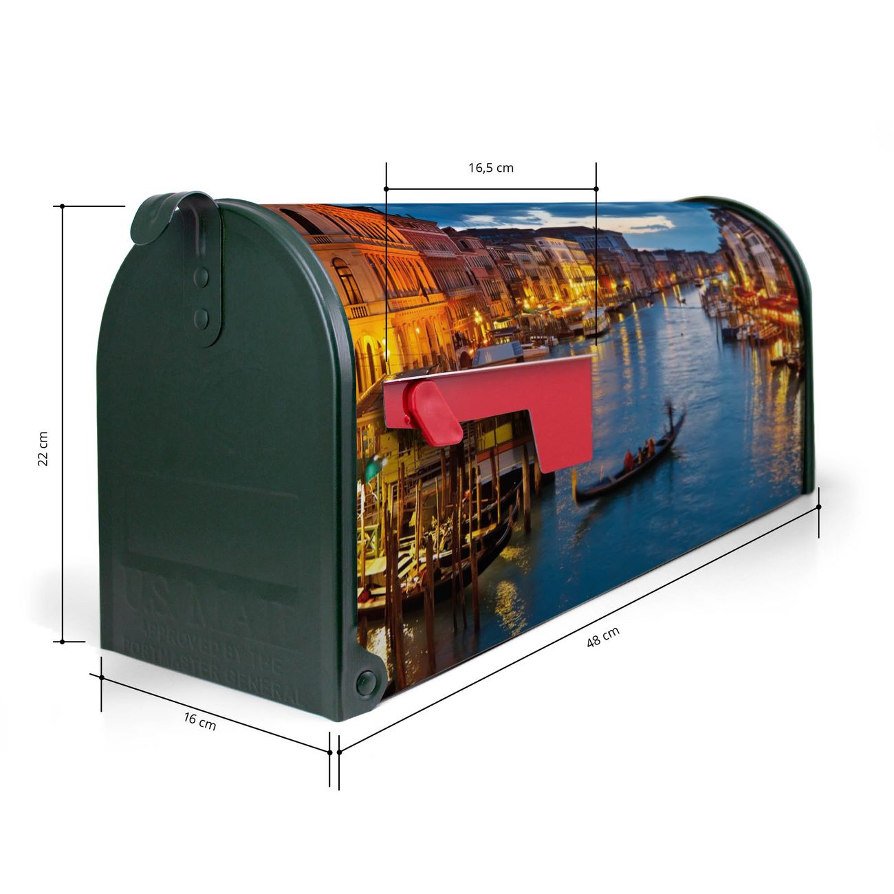 Der amerikanische Briefkasten von banjado mit Canale Grande Bei Nacht Motiv bietet Ihnen ausreichend Fassungsvermögen, um große A4 Sendungen und Zeitschriften zu empfangen. Die typisch amerikanische rote Fahne zeigt Ihnen an, wenn Sie Post erhalten haben. Die US-Mailbox besteht aus verzinktem Stahlblech welches lackiert wurde und ist 48 x 22 x 16 CM (BxHxT) groß. Die Folie mit Motiv Canale Grande Bei Nacht besteht aus einer wetter- und UV-resistenten Folie, die mit einem Schutzlaminat überzogen ist, sodass die US Mailbox zusätzlich vor Kratzern geschützt ist. An der Unterkante sind 4 Löcher je Seite um die Mailbox, typisch amerikanisch, an einem Holzpfahl oder einem Zaun zu befestigen. Auf Wunsch können Sie bei uns den passenden Standfuß oder die passende Wandhalterung kaufen um die US-Mailbox sicher zu befestigen. Wir bieten Ihnen ebenfalls Namensschilder, bereits beschriftet oder frei zu beschriften, und verschiedene selbst gestaltete Bitte-Keine-Werbung-Aufkleber.