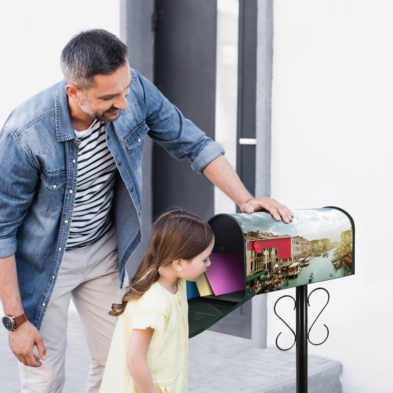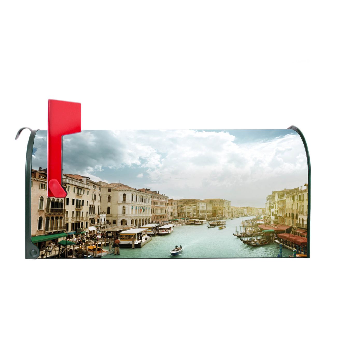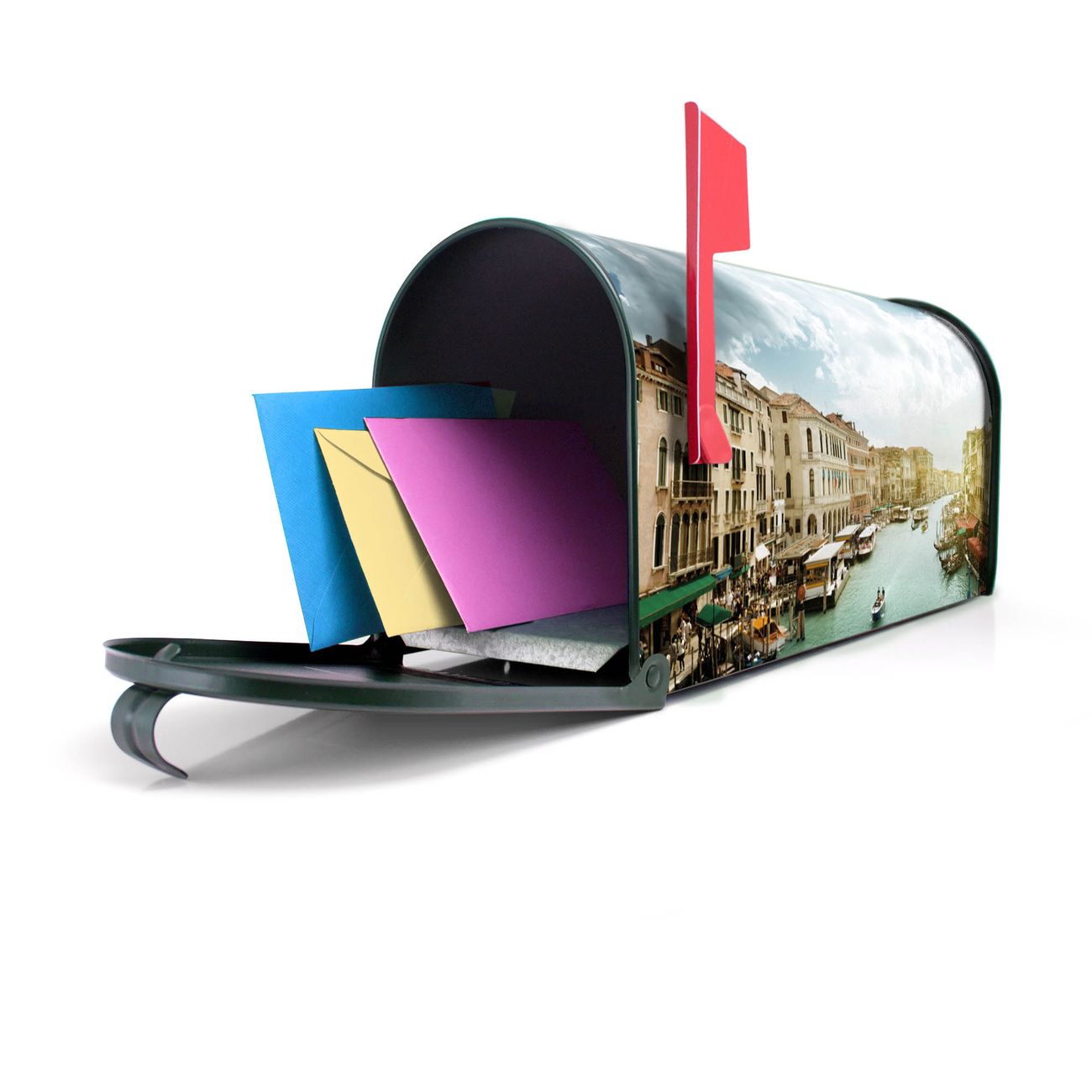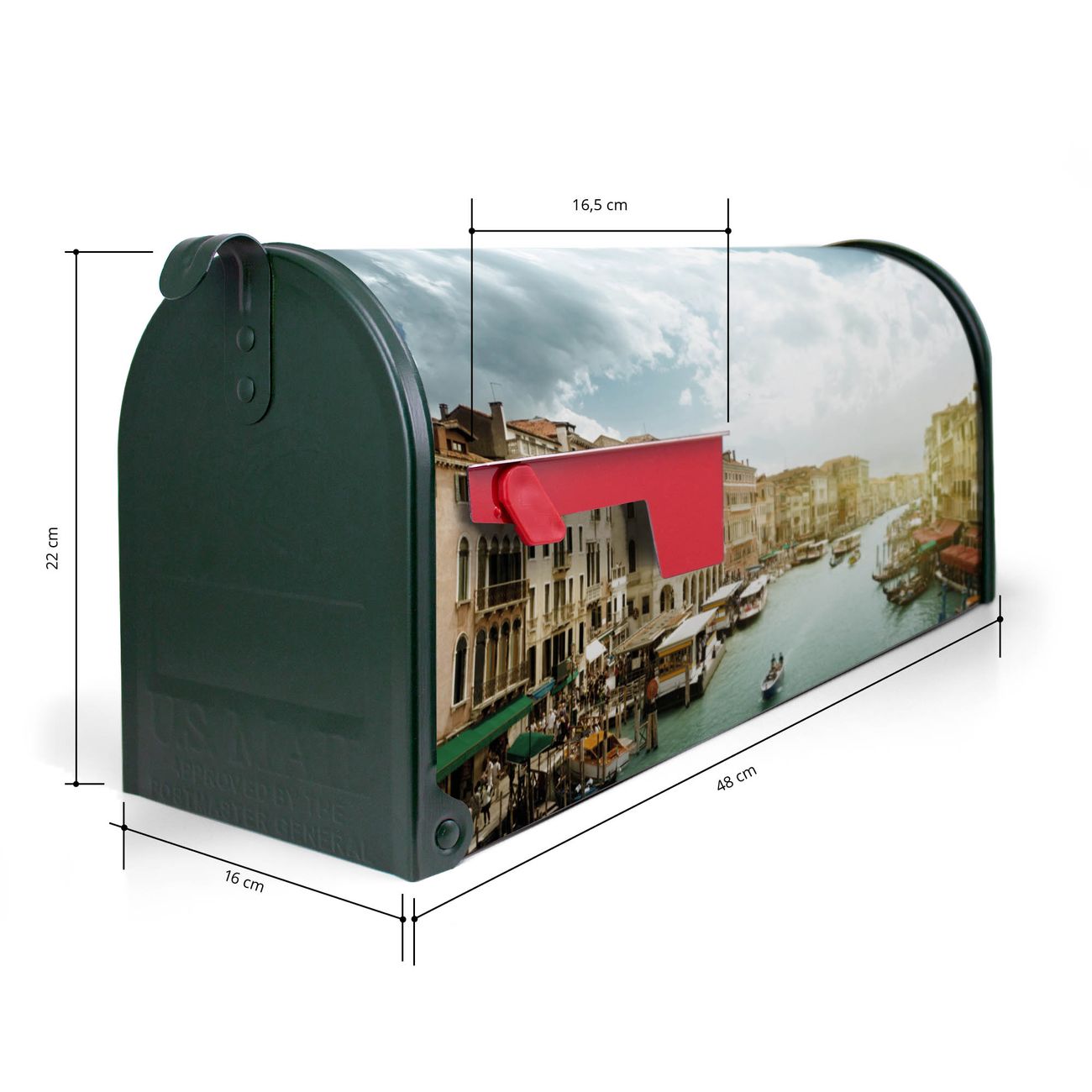 Der amerikanische Briefkasten von banjado mit Canale Grande Motiv bietet Ihnen ausreichend Fassungsvermögen, um große A4 Sendungen und Zeitschriften zu empfangen. Die typisch amerikanische rote Fahne zeigt Ihnen an, wenn Sie Post erhalten haben. Die US-Mailbox besteht aus verzinktem Stahlblech welches lackiert wurde und ist 48 x 22 x 16 CM (BxHxT) groß. Die Folie mit Motiv Canale Grande besteht aus einer wetter- und UV-resistenten Folie, die mit einem Schutzlaminat überzogen ist, sodass die US Mailbox zusätzlich vor Kratzern geschützt ist. An der Unterkante sind 4 Löcher je Seite um die Mailbox, typisch amerikanisch, an einem Holzpfahl oder einem Zaun zu befestigen. Auf Wunsch können Sie bei uns den passenden Standfuß oder die passende Wandhalterung kaufen um die US-Mailbox sicher zu befestigen. Wir bieten Ihnen ebenfalls Namensschilder, bereits beschriftet oder frei zu beschriften, und verschiedene selbst gestaltete Bitte-Keine-Werbung-Aufkleber.