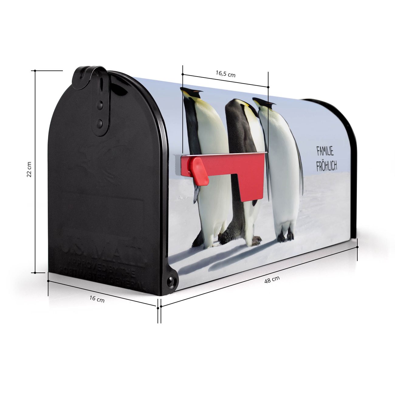 Der amerikanische Briefkasten von banjado mit Catch Up Motiv bietet Ihnen ausreichend Fassungsvermögen, um große A4 Sendungen und Zeitschriften zu empfangen. Die typisch amerikanische rote Fahne zeigt Ihnen an, wenn Sie Post erhalten haben. Die US-Mailbox besteht aus verzinktem Stahlblech welches lackiert wurde und ist 48 x 22 x 16 CM (BxHxT) groß. Die Folie mit Motiv Catch Up besteht aus einer wetter- und UV-resistenten Folie, die mit einem Schutzlaminat überzogen ist, sodass die US Mailbox zusätzlich vor Kratzern geschützt ist. An der Unterkante sind 4 Löcher je Seite um die Mailbox, typisch amerikanisch, an einem Holzpfahl oder einem Zaun zu befestigen. Auf Wunsch können Sie bei uns den passenden Standfuß oder die passende Wandhalterung kaufen um die US-Mailbox sicher zu befestigen. Wir bieten Ihnen ebenfalls Namensschilder, bereits beschriftet oder frei zu beschriften, und verschiedene selbst gestaltete Bitte-Keine-Werbung-Aufkleber.