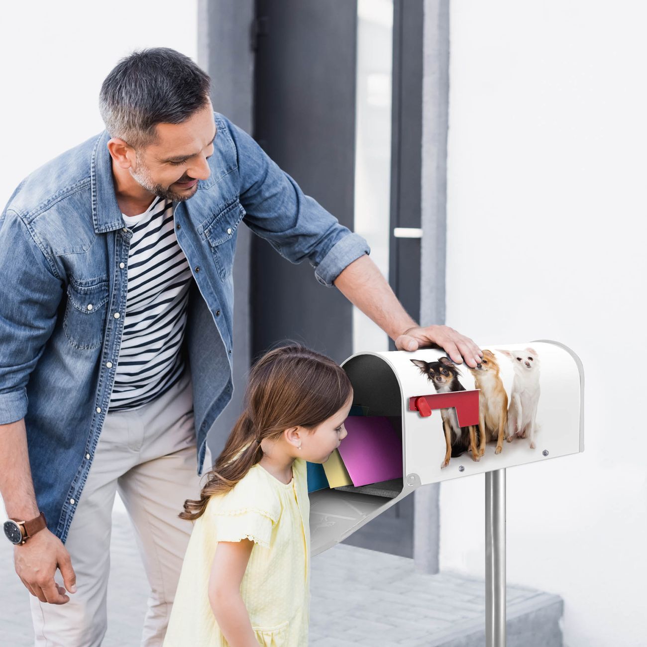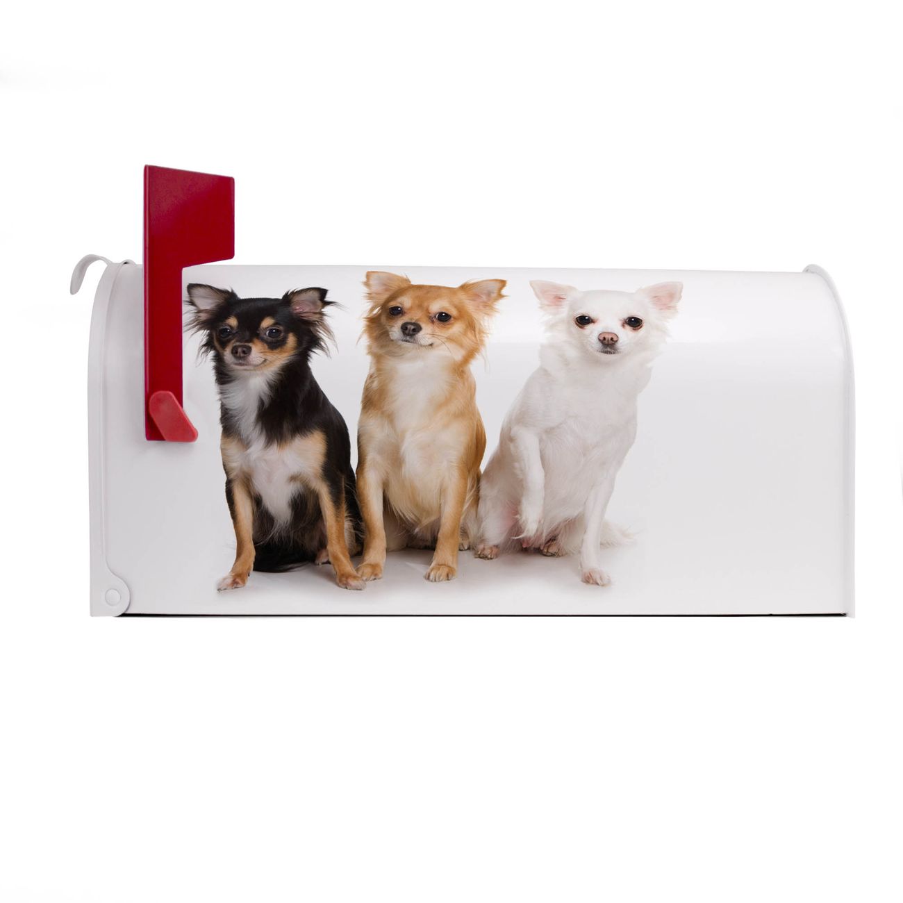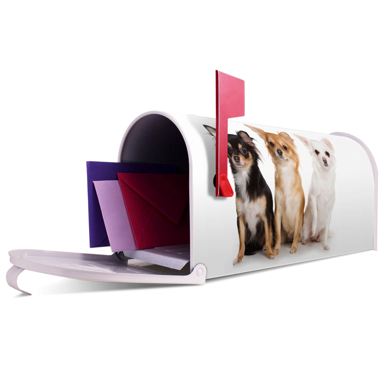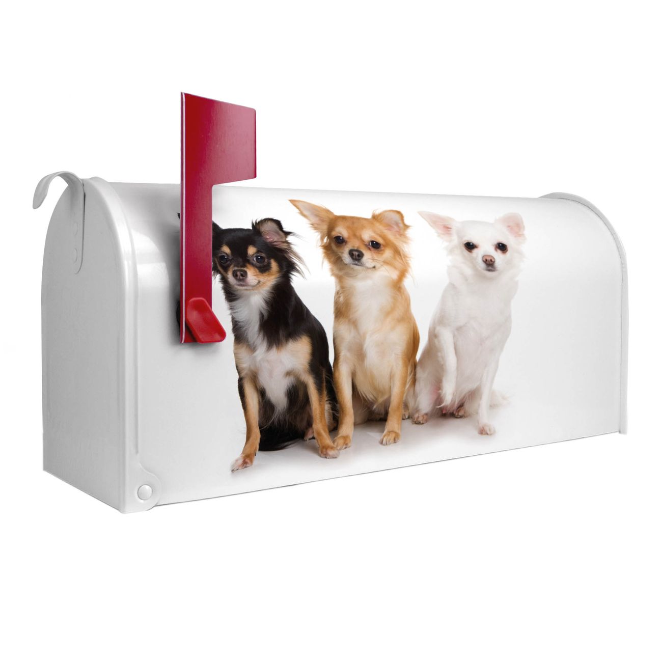 Unser amerikanischer Briefkasten mit dem Motiv Chihuahua hat ein sehr ansprechendes und ausgefallenes Design, ist in der Grundfarbe weiß, grün oder schwarz erhältlich. Damit entlocken Sie Ihren Nachbarn und dem Postboten immer wieder ein Lächeln. Die Mailbox ist ein Original Import aus Mississippi USA und wird von unserer kleinen Manufaktur in Sachsen von Hand veredelt. Die US-Mailbox bietet ausreichend Platz auch für große Sendungen, eine Fahne die Ihnen Post anzeigt, wetterfestes und äußerst stabiles Material - so macht Post empfangen Freude.
